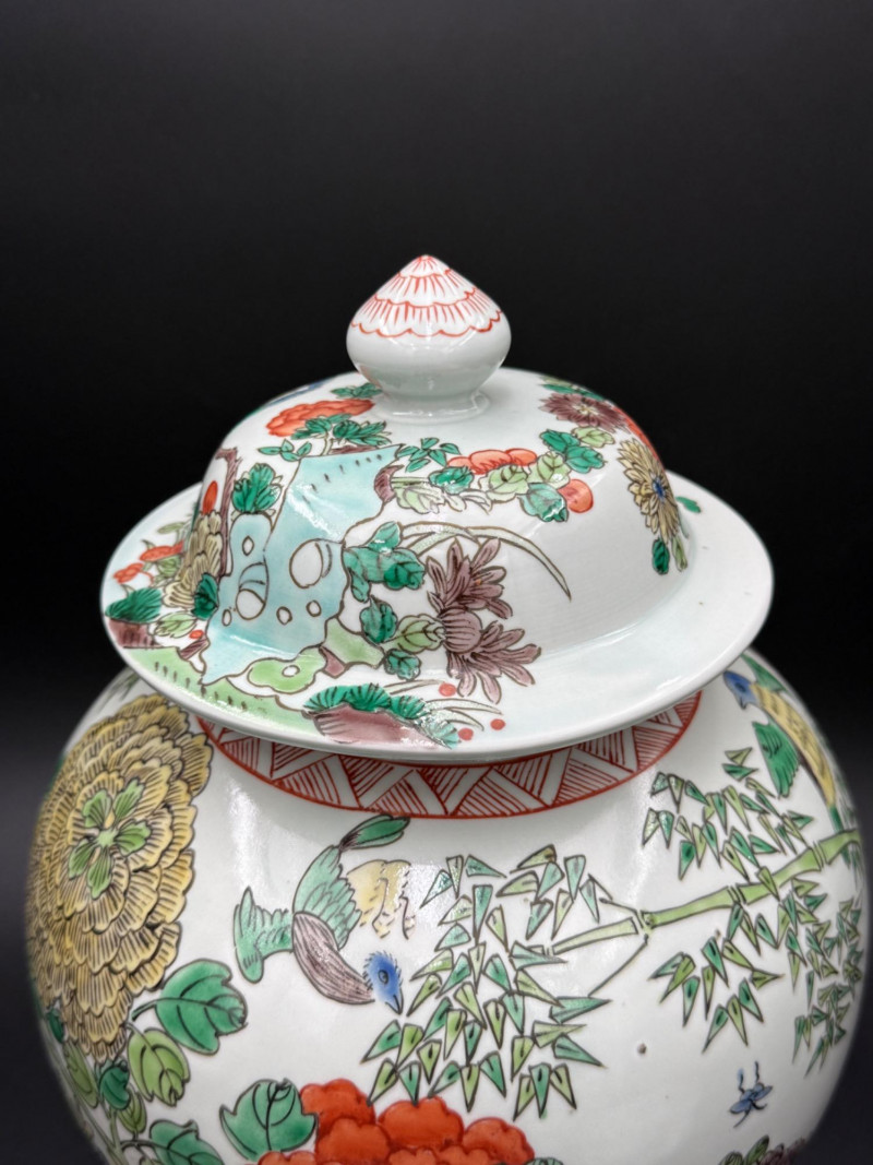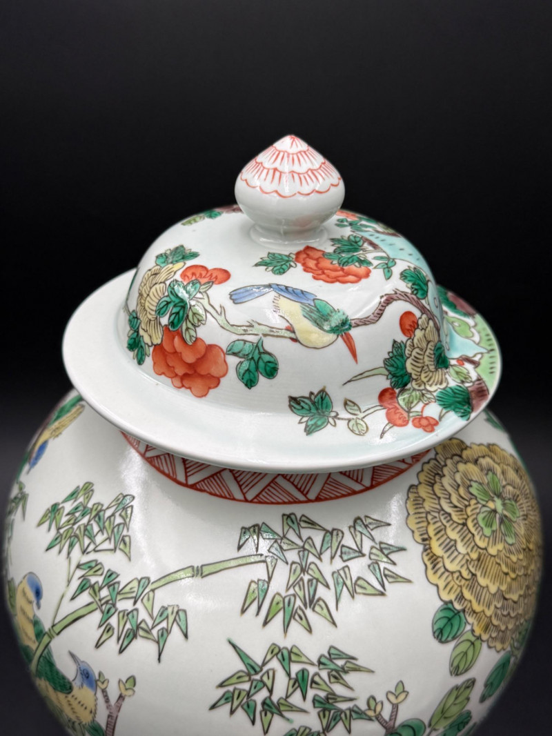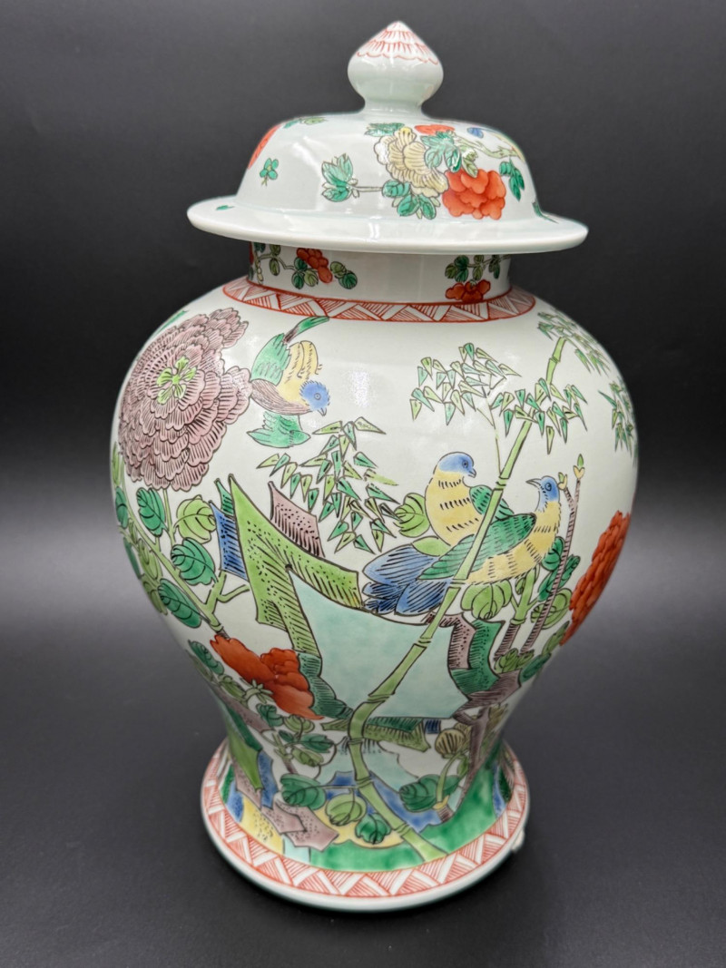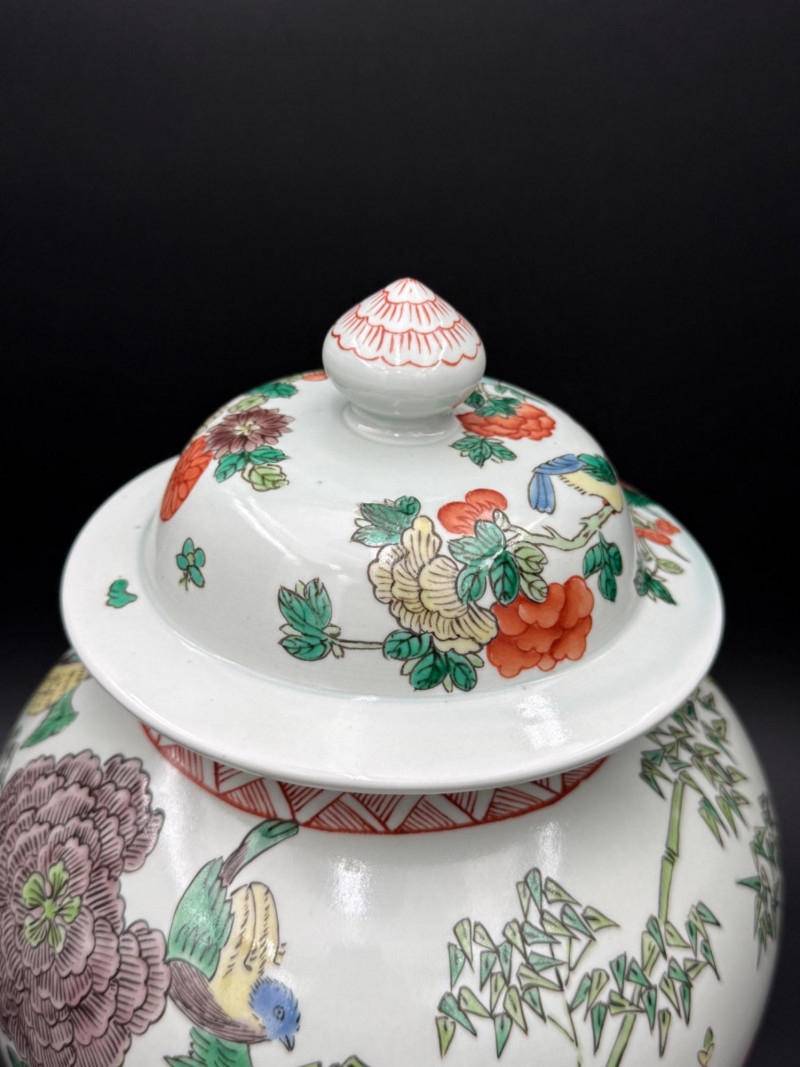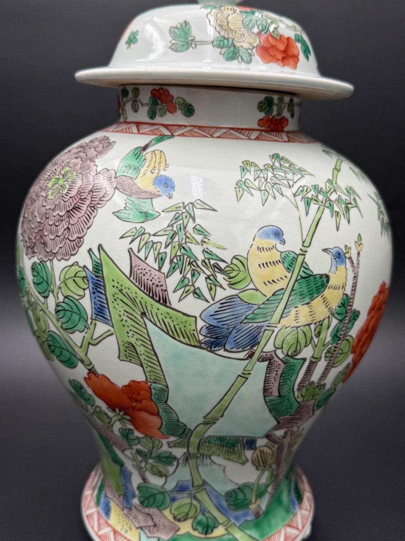 Early to Mid-20th Century Chinese Famille Style Ginger Jar Lidded porcelain ginger jar with a bulbous body and narrow neck, decorated with hand-painted birds perched among flowering branches, bamboo stalks, and foliage. The surface displays clusters of peonies in multiple colors, bordered by a patterned foot and a matching domed lid. The lid features a pierced finial and continues the floral and botanical motifs. The imagery is outlined and filled with varied enamel tones. Possibly from the early to mid-20th century, in the style of Chinese famille verte or famille rose porcelain, likely produced during or after the Republic period (1912–1949). Dimensions (approx.): 15.5 x 10 in.