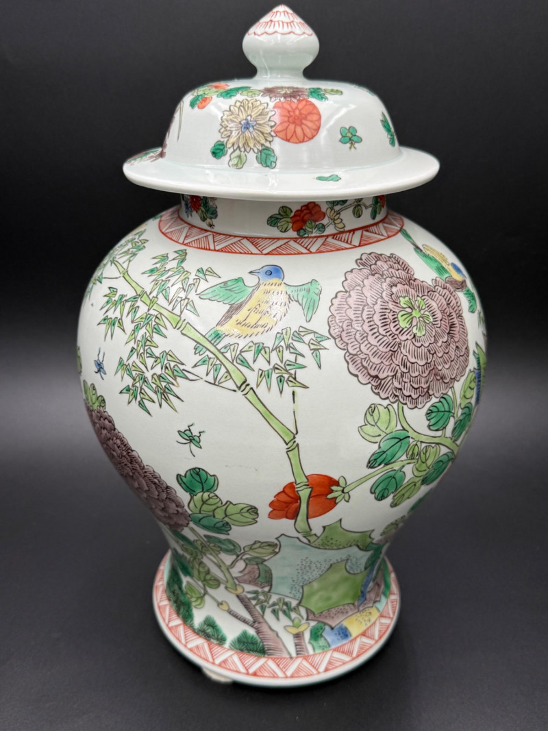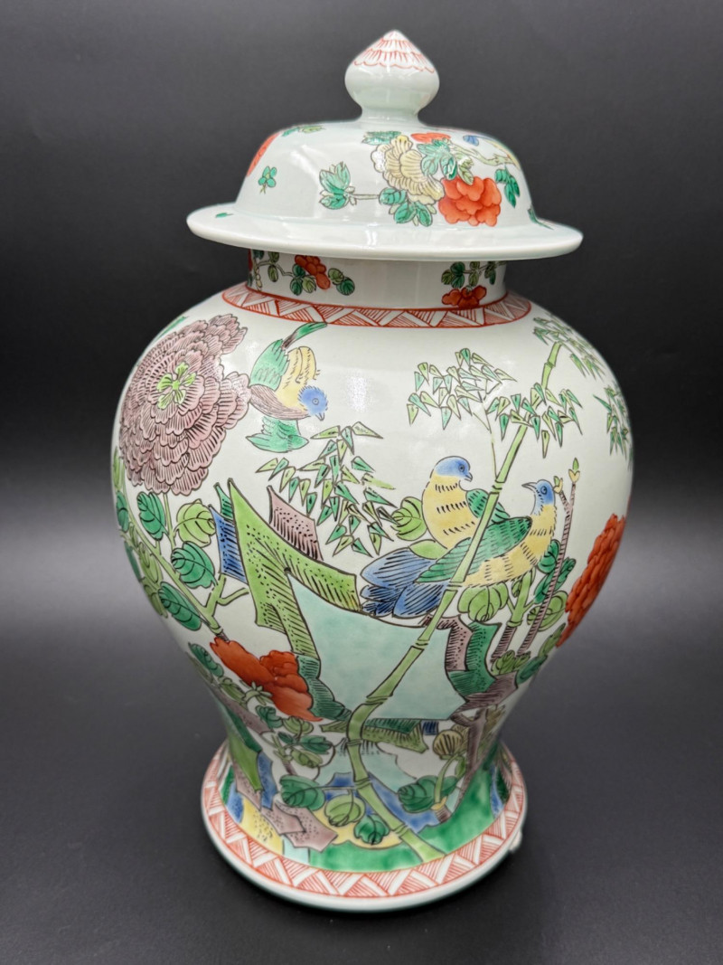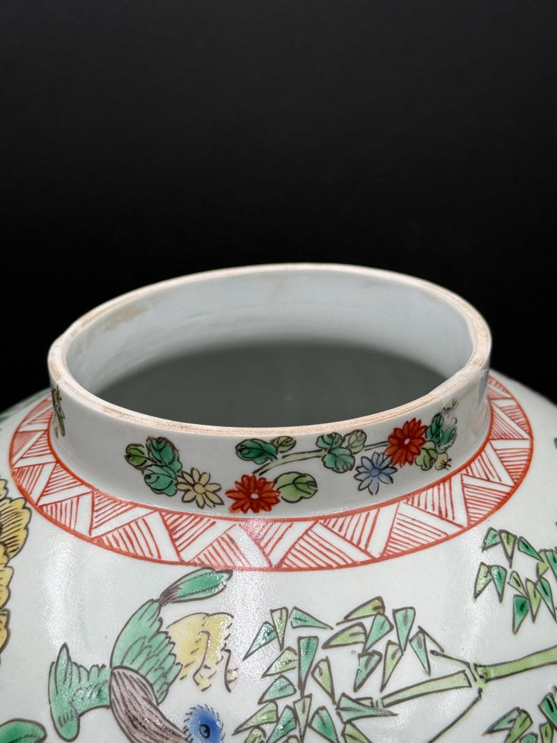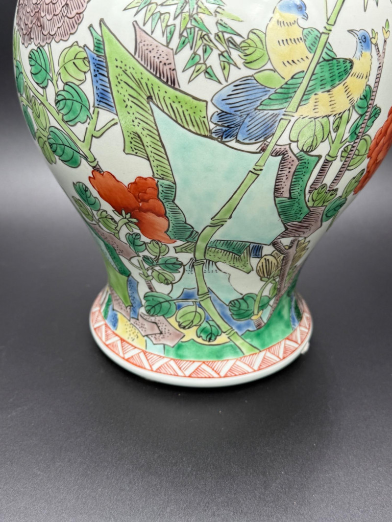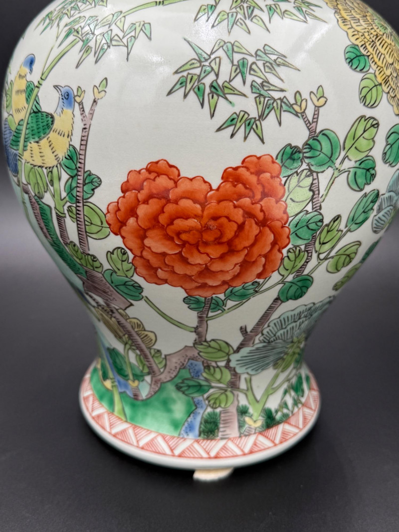 Early to Mid-20th Century Chinese Famille Style Ginger Jar Lidded porcelain ginger jar with a bulbous body and narrow neck, decorated with hand-painted birds perched among flowering branches, bamboo stalks, and foliage. The surface displays clusters of peonies in multiple colors, bordered by a patterned foot and a matching domed lid. The lid features a pierced finial and continues the floral and botanical motifs. The imagery is outlined and filled with varied enamel tones. Possibly from the early to mid-20th century, in the style of Chinese famille verte or famille rose porcelain, likely produced during or after the Republic period (1912–1949). Dimensions (approx.): 15.5 x 10 in.
