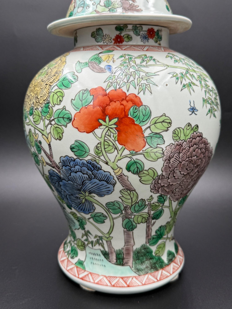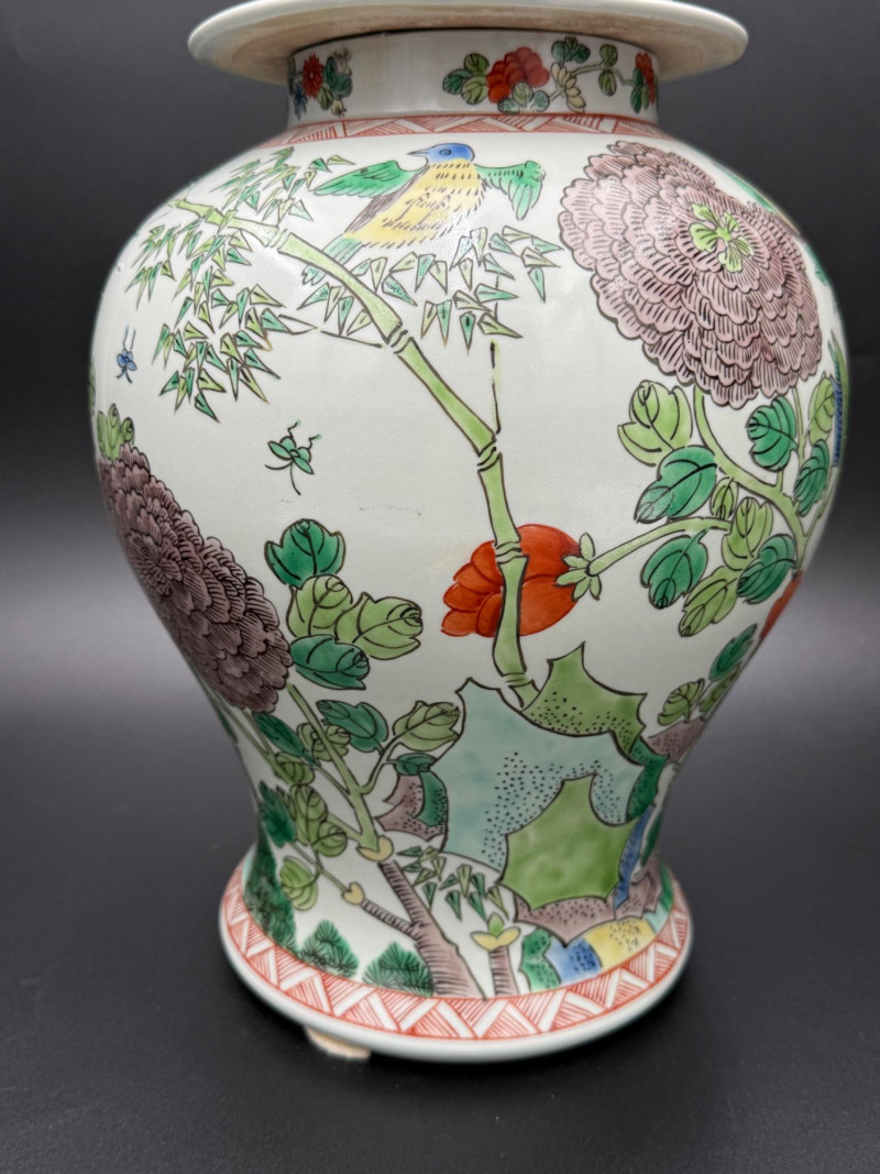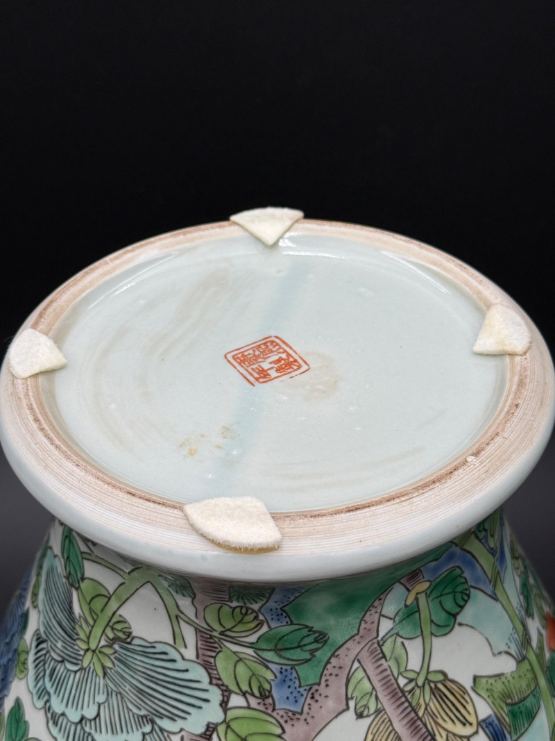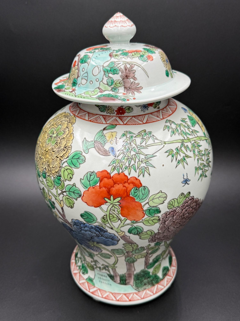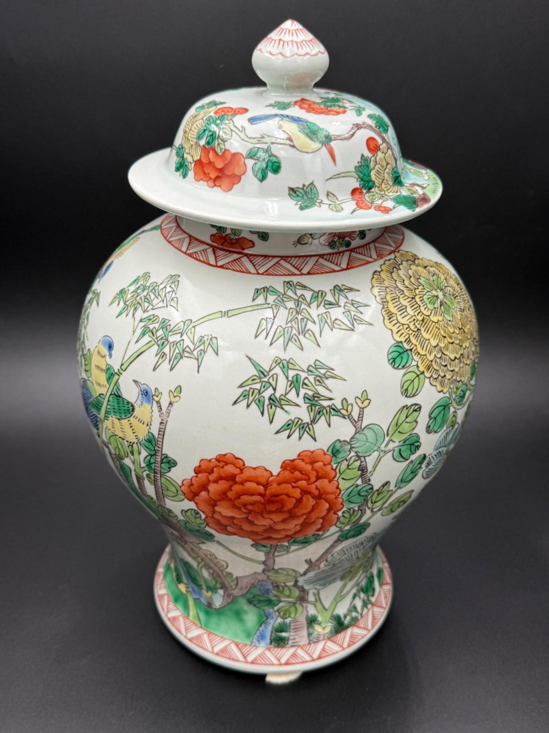 Early to Mid-20th Century Chinese Famille Style Ginger Jar Lidded porcelain ginger jar with a bulbous body and narrow neck, decorated with hand-painted birds perched among flowering branches, bamboo stalks, and foliage. The surface displays clusters of peonies in multiple colors, bordered by a patterned foot and a matching domed lid. The lid features a pierced finial and continues the floral and botanical motifs. The imagery is outlined and filled with varied enamel tones. Possibly from the early to mid-20th century, in the style of Chinese famille verte or famille rose porcelain, likely produced during or after the Republic period (1912–1949). Dimensions (approx.): 15.5 x 10 in.