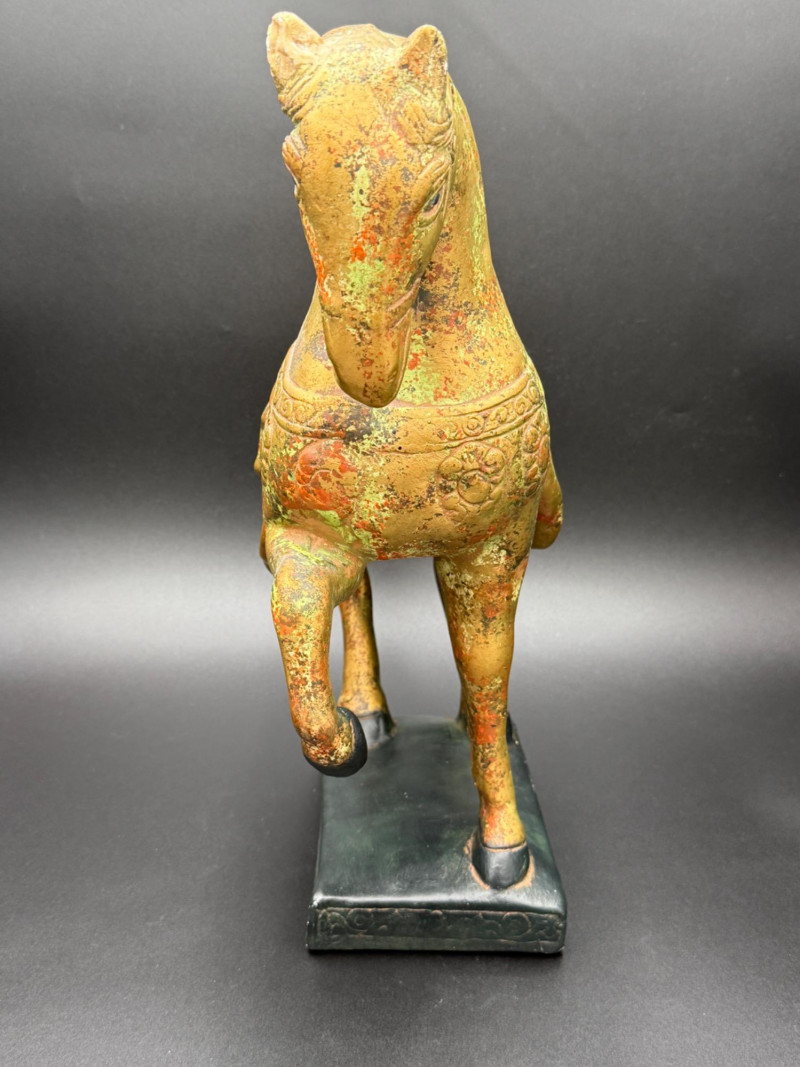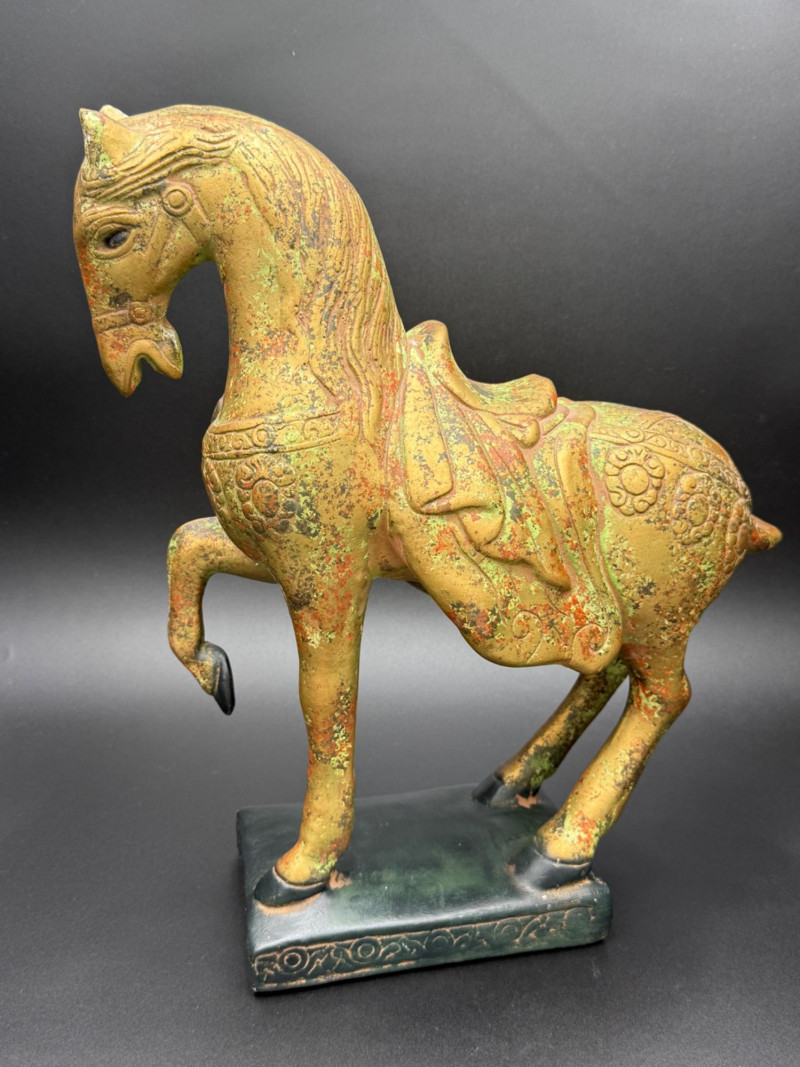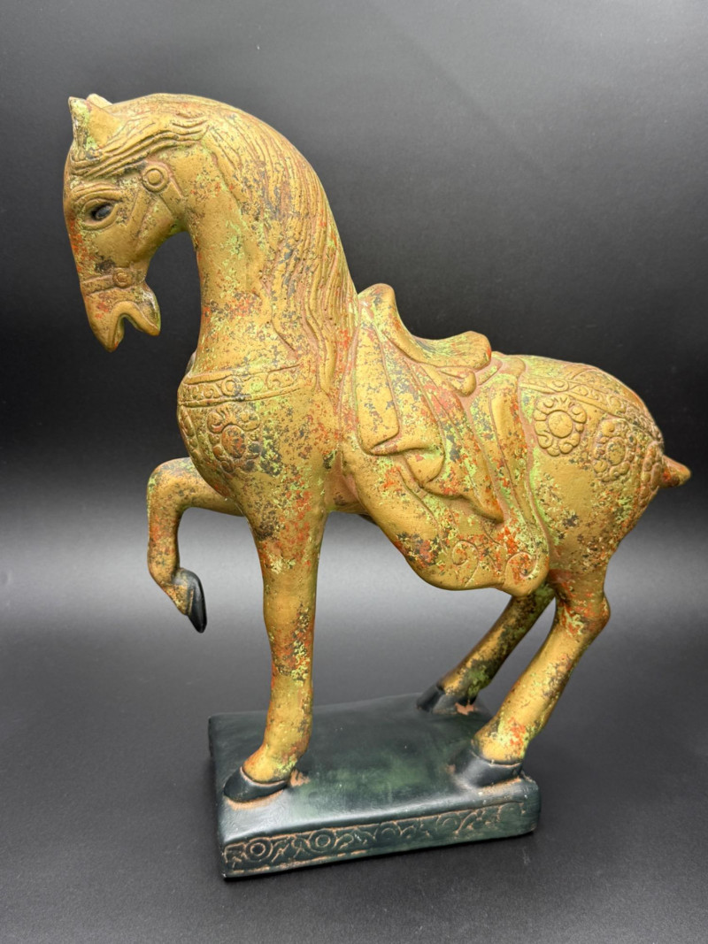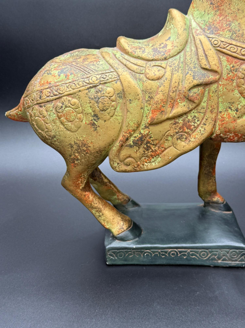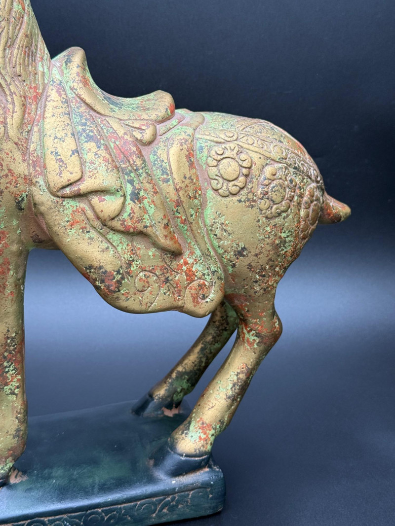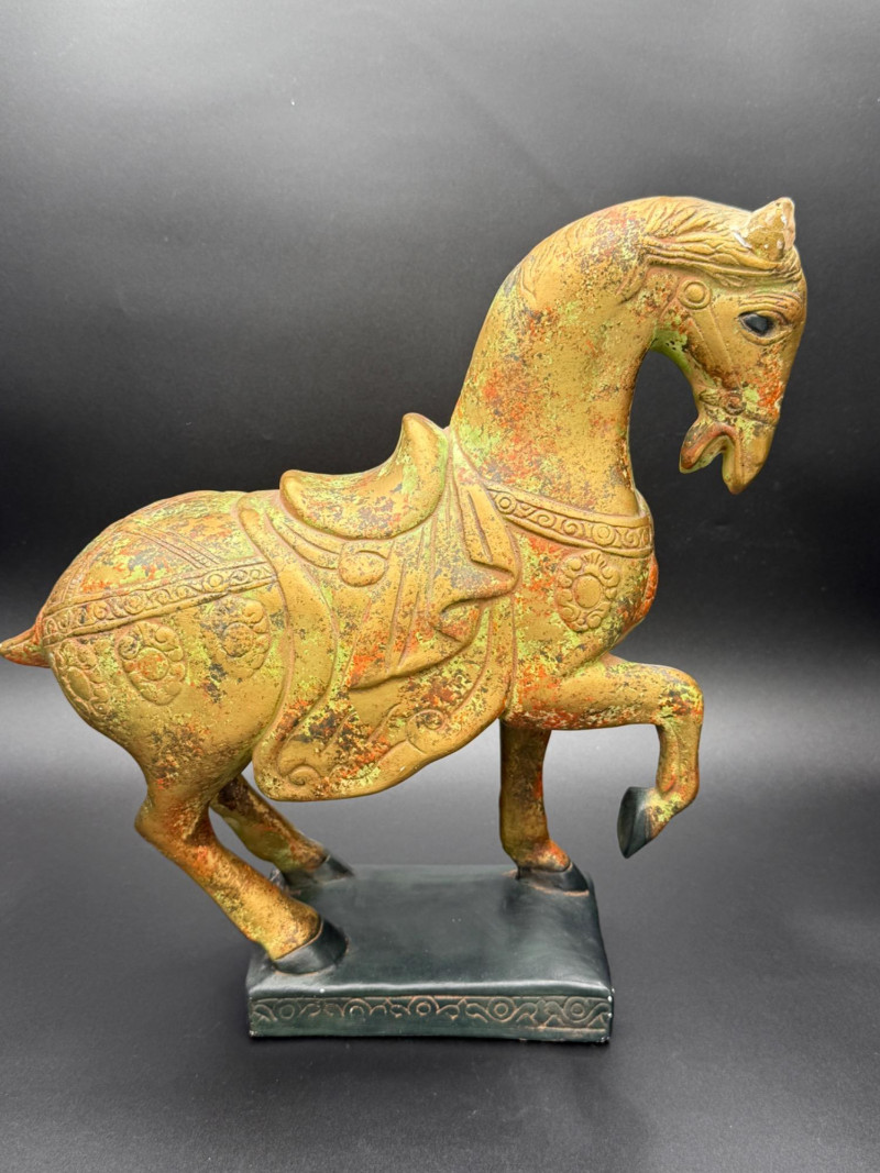 Tang-Style Painted Horse Sculpture on Plinth Figure of a horse in mid-stride with one foreleg raised, mounted on a rectangular plinth. The body is decorated with relief detailing along the saddle, bridle, and harness, including rosette and geometric motifs. The mane falls along one side of the neck, and the head is turned slightly downward with defined ears and carved reins. The surface is finished in mottled earthy tones, giving the appearance of aged patina. Material: Possibly composite or resin with painted finish