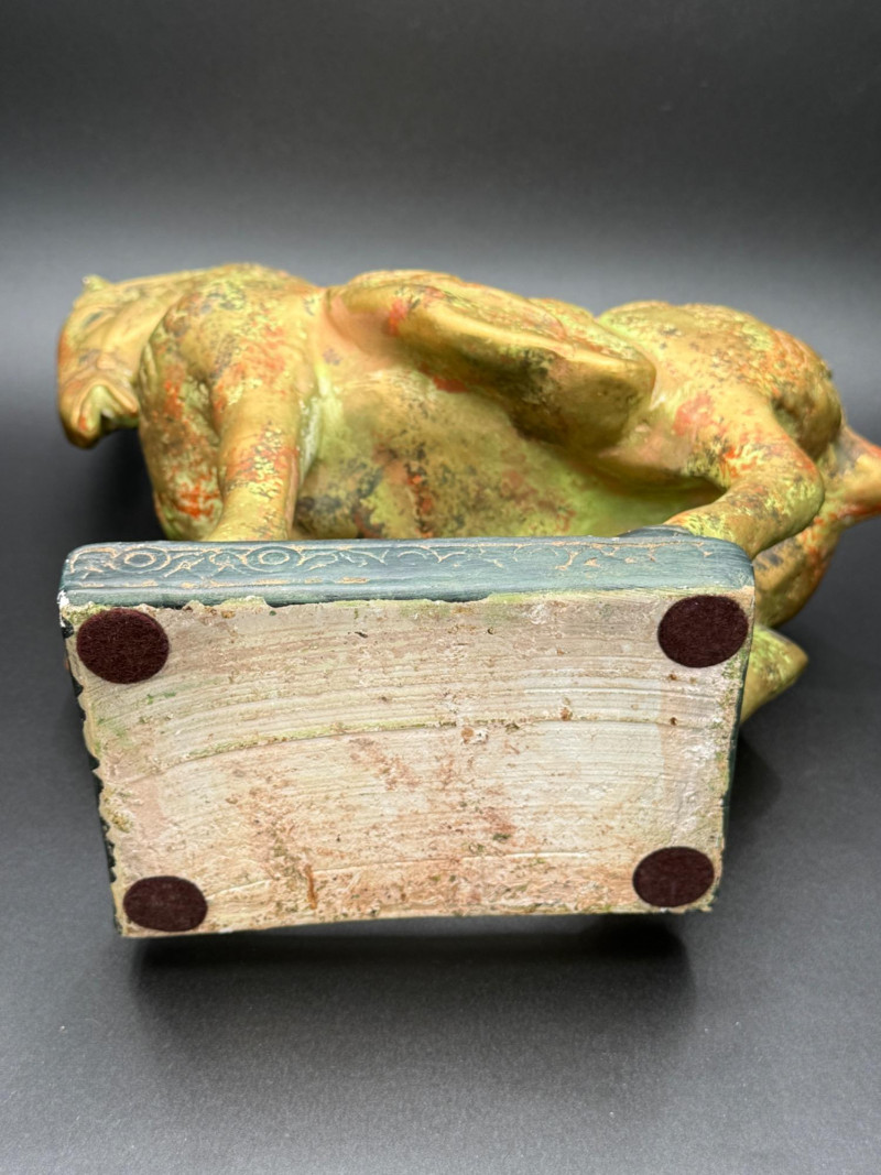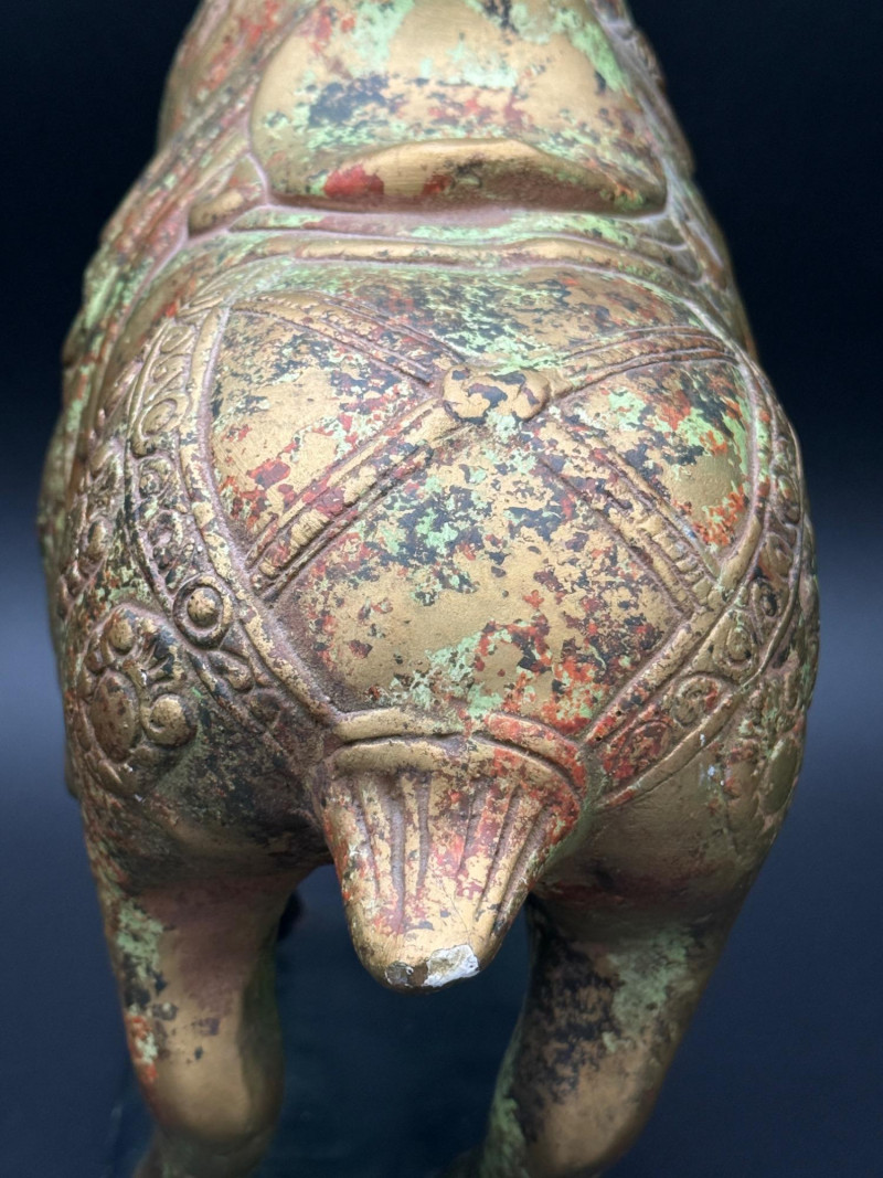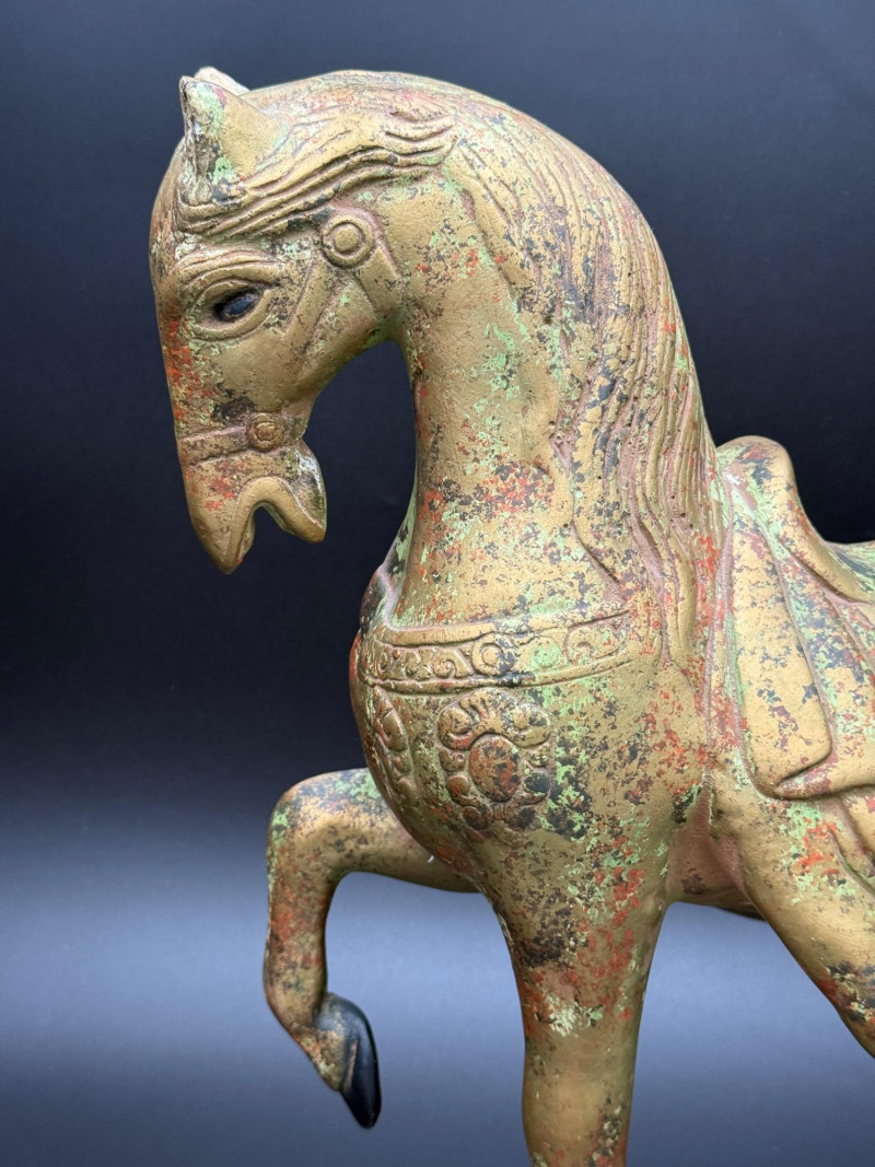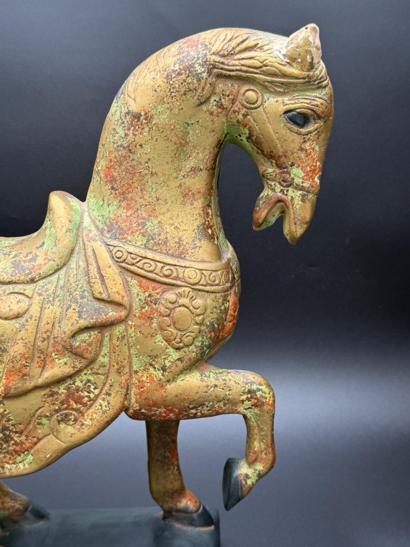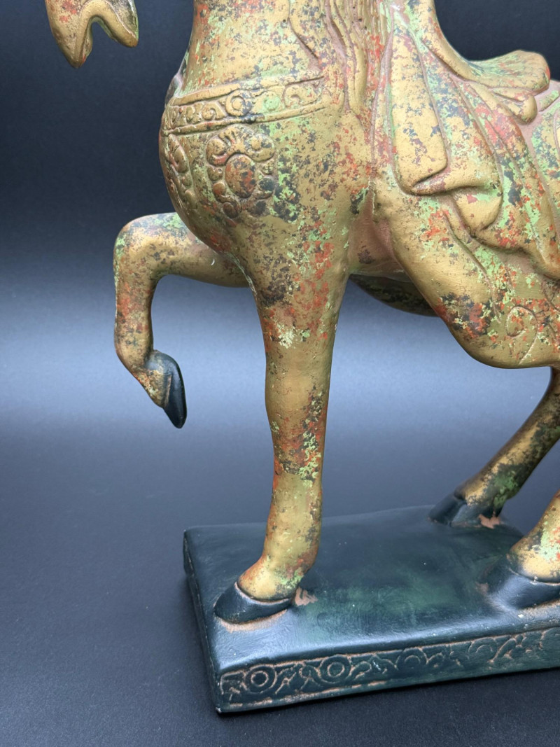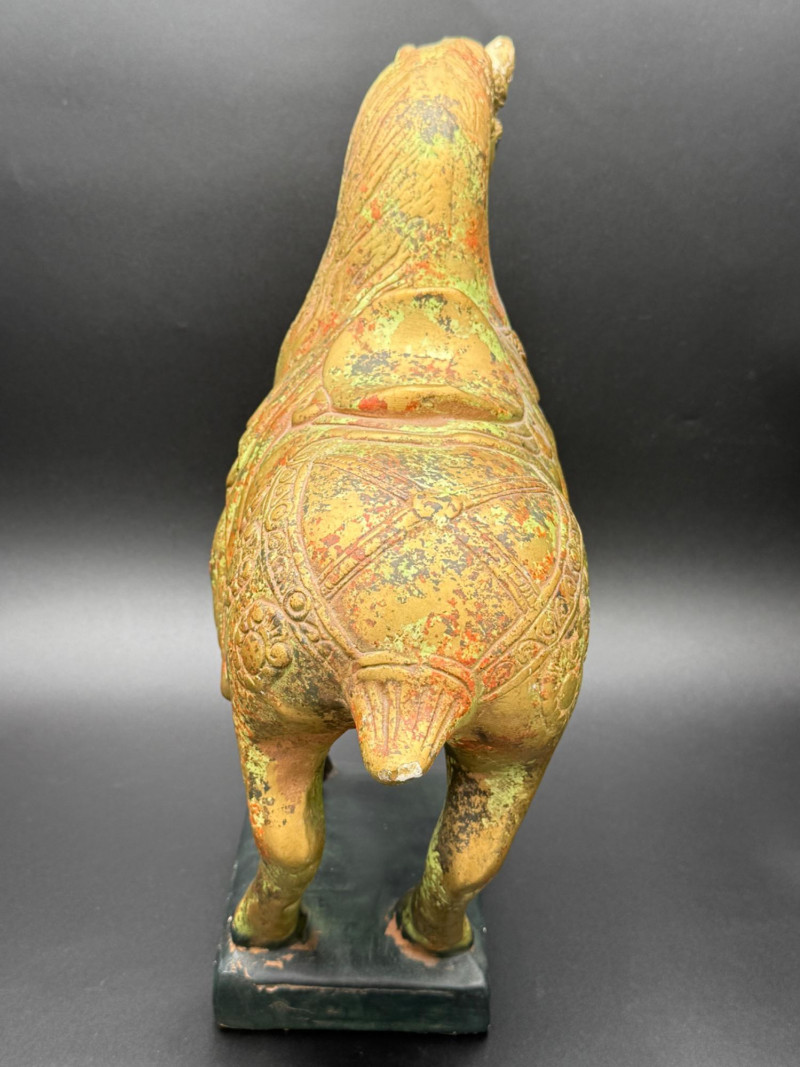 Tang-Style Painted Horse Sculpture on Plinth Figure of a horse in mid-stride with one foreleg raised, mounted on a rectangular plinth. The body is decorated with relief detailing along the saddle, bridle, and harness, including rosette and geometric motifs. The mane falls along one side of the neck, and the head is turned slightly downward with defined ears and carved reins. The surface is finished in mottled earthy tones, giving the appearance of aged patina. Material: Possibly composite or resin with painted finish