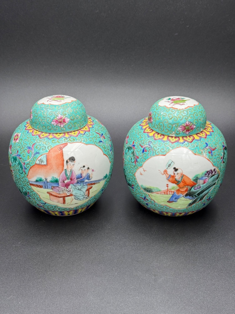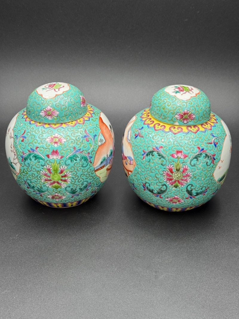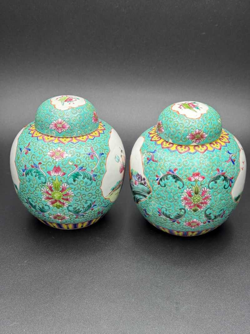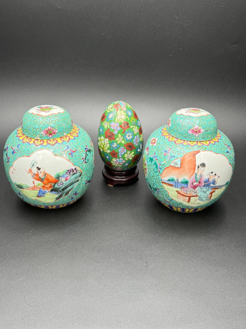 Chinese Porcelain Ginger Jars and Cloisonné Egg with Wooden Stand Group of three decorative objects comprising two vintage Chinese porcelain ginger jars and one cloisonné egg. The ginger jars feature domed lids, turquoise grounds with scrolling floral designs, and hand-painted figural scenes in white cartouches. The cloisonné egg is decorated with enamel floral patterns in wire outlines and is displayed on its round wooden stand. Dimensions (approx.):