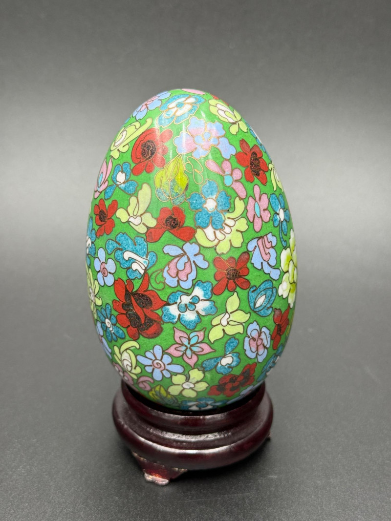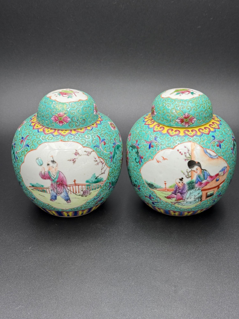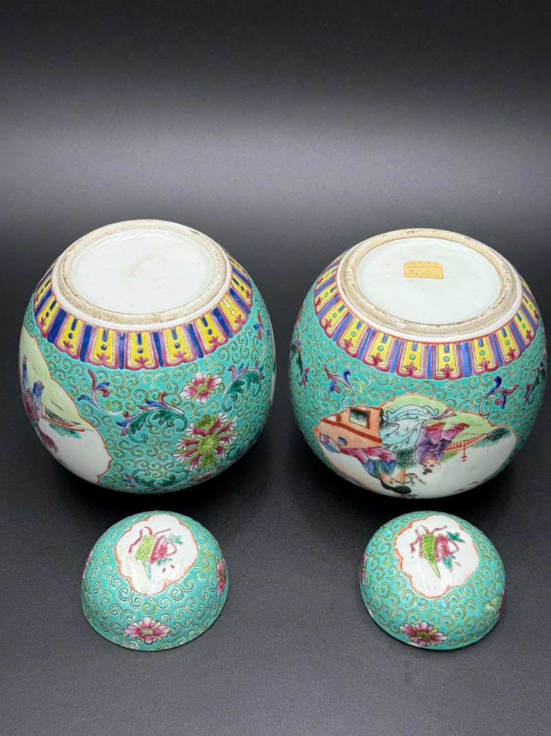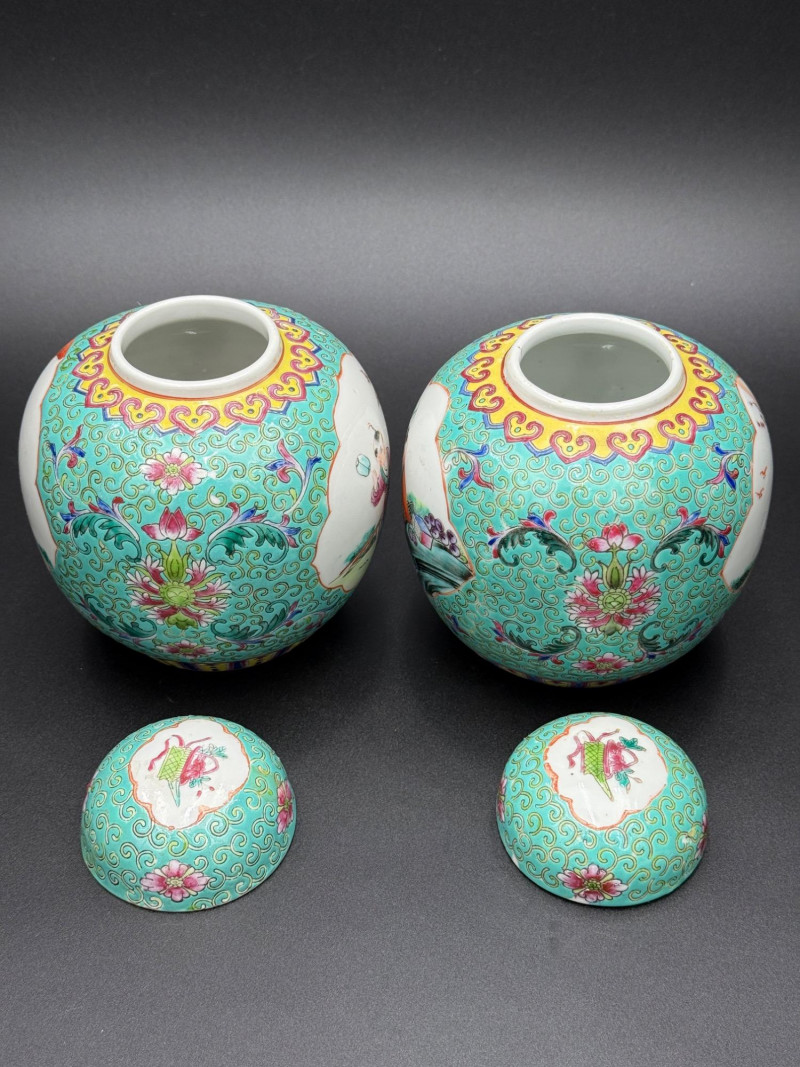 Chinese Porcelain Ginger Jars and Cloisonné Egg with Wooden Stand Group of three decorative objects comprising two vintage Chinese porcelain ginger jars and one cloisonné egg. The ginger jars feature domed lids, turquoise grounds with scrolling floral designs, and hand-painted figural scenes in white cartouches. The cloisonné egg is decorated with enamel floral patterns in wire outlines and is displayed on its round wooden stand. Dimensions (approx.):