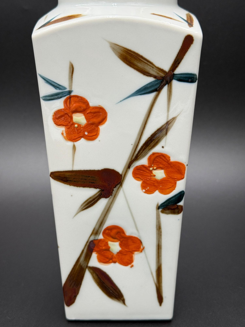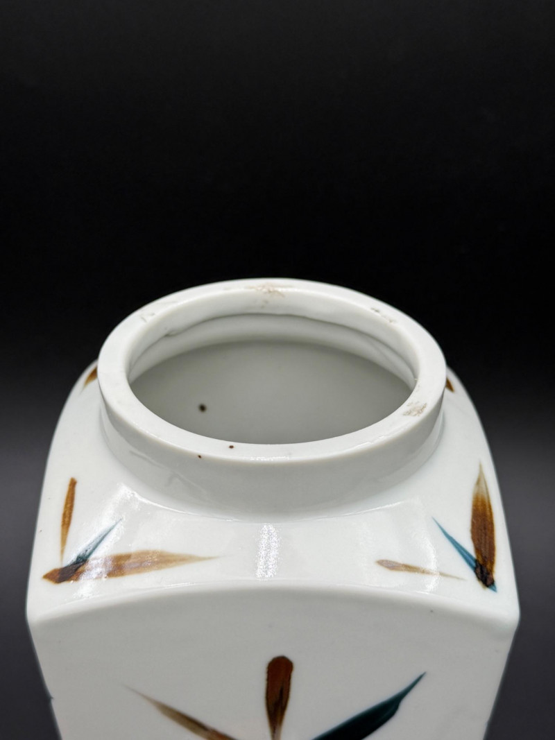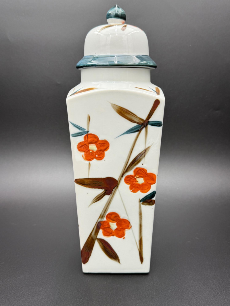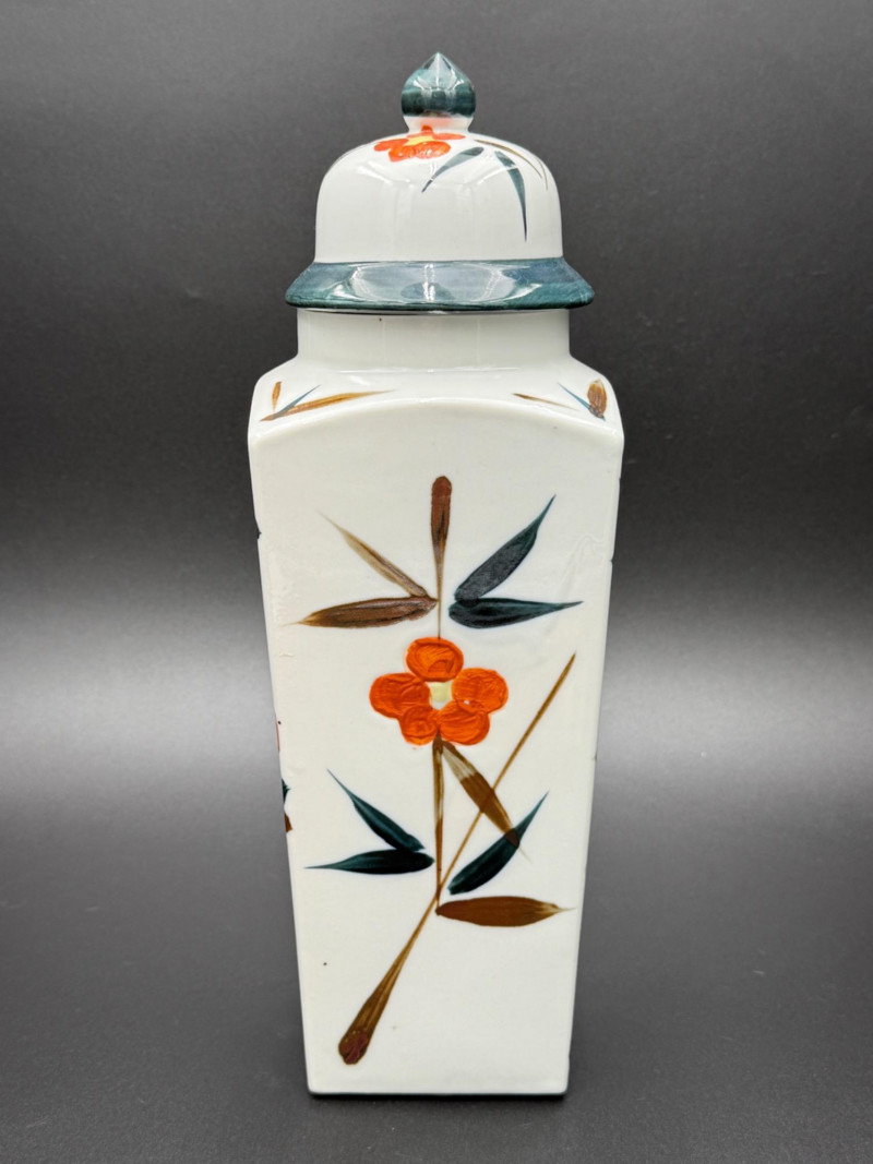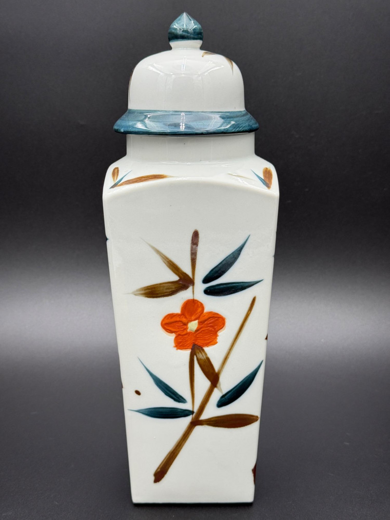 Porcelain Tea Caddy Hand-Painted Cherry Blossoms Square-bodied porcelain tea caddy with a domed lid. The surface is hand-painted with cherry blossoms and bamboo in red, brown, and blue on a white ground. A geometric border decorates the lid. The foot is unglazed with green felt pads. A maker’s mark appears near the base.