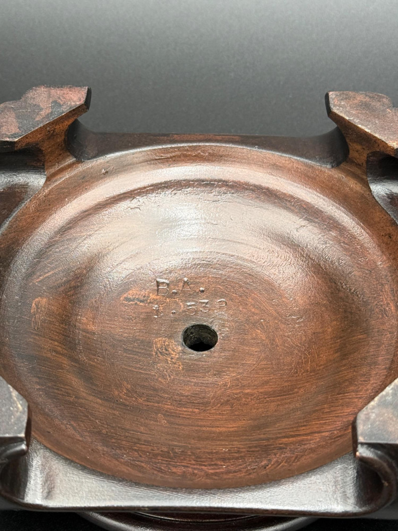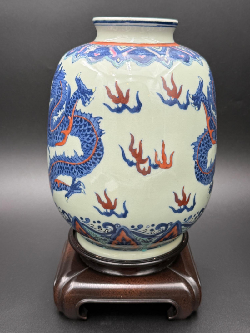 Chinese Porcelain Dragon Jar with Stand Porcelain jar with rounded body and short neck, resting on a carved wooden display stand. The surface is decorated with dragons in motion, rendered in underglaze blue with red accents, surrounded by flame motifs. A patterned border encircles the neck and base. The underside is glazed and marked with a four-character inscription in underglaze blue. The jar is paired with a fitted circular wooden stand featuring shaped feet and a central opening.