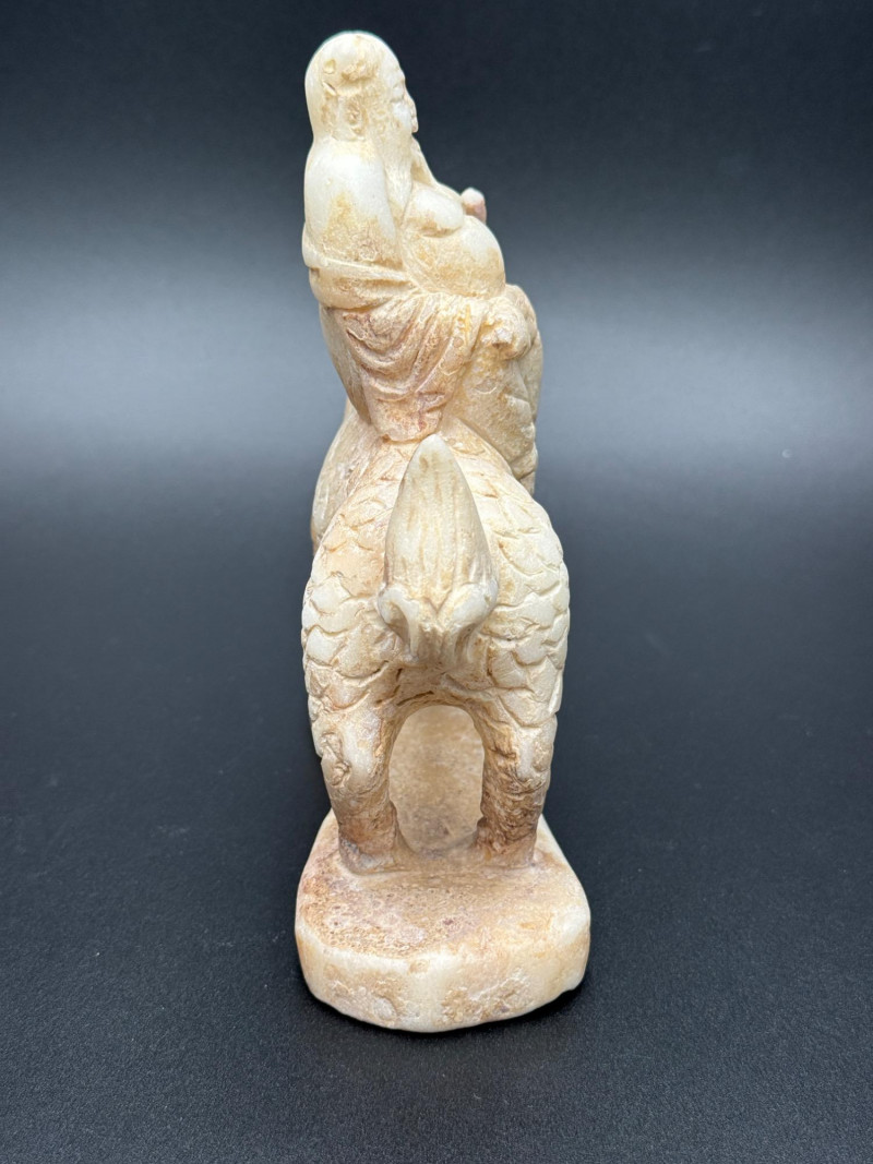 Soapstone Figure of Seated Figure on Mythical Beast Carved figure depicting a seated figure holding a stringed instrument, mounted on a quadruped creature with a scaled body, clawed feet, and an open mouth. The rider is positioned upright with crossed legs and draped garments. The creature stands on a rectangular base with rounded edges. The surface displays natural veining and tonal variations, likely carved from soapstone. Dimensions: 7.5 x 8 x 3 inches