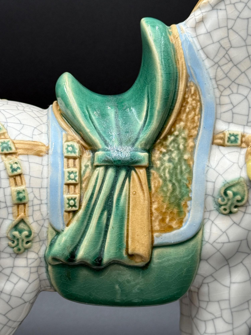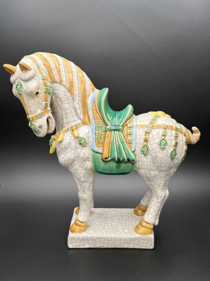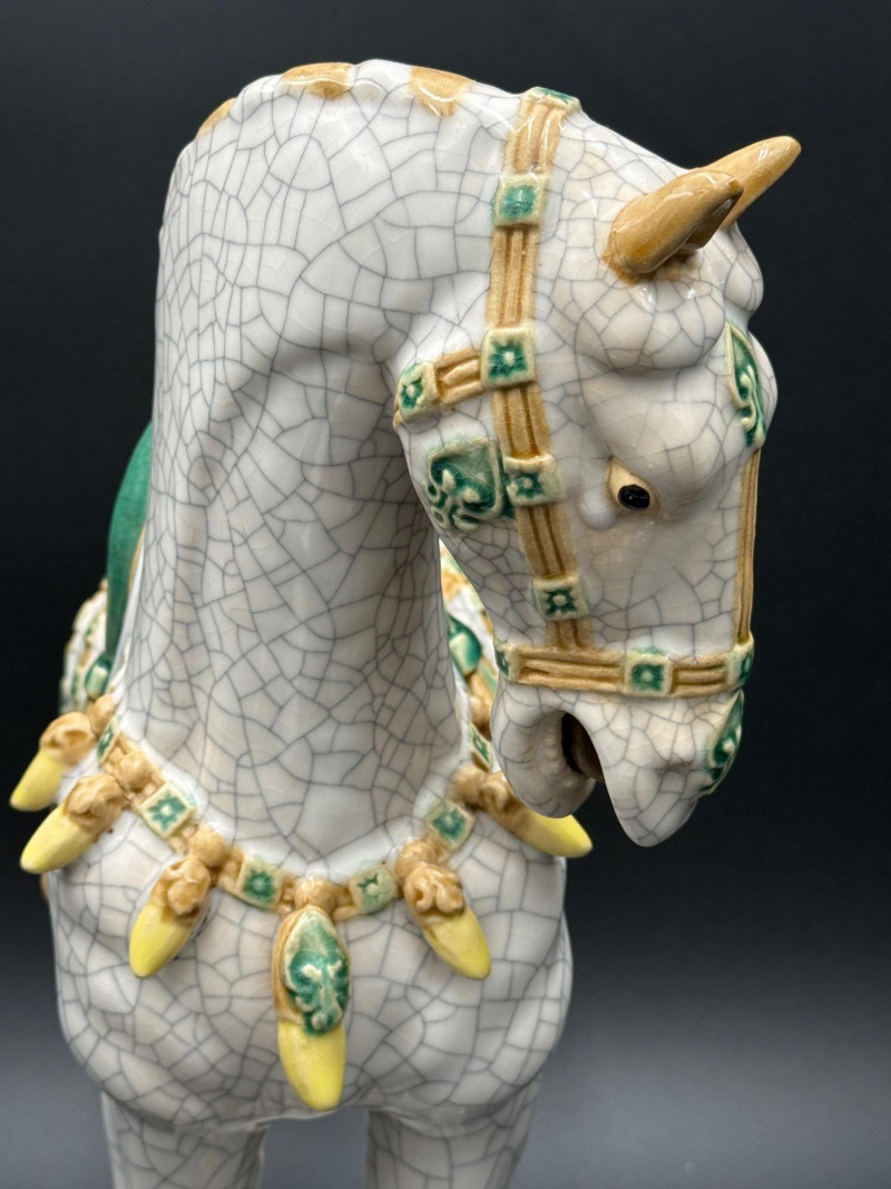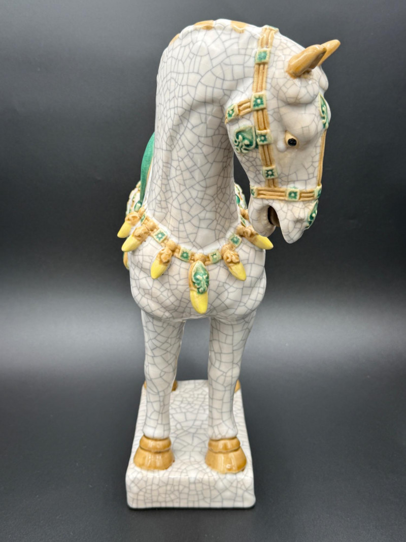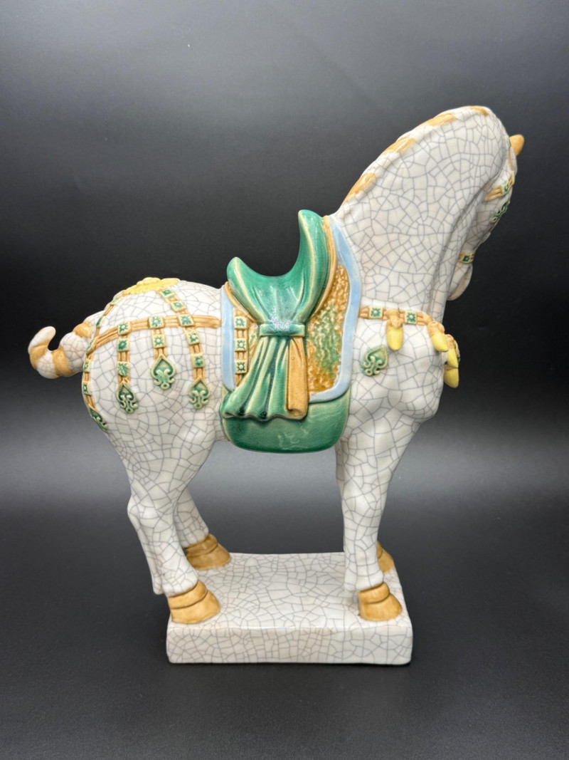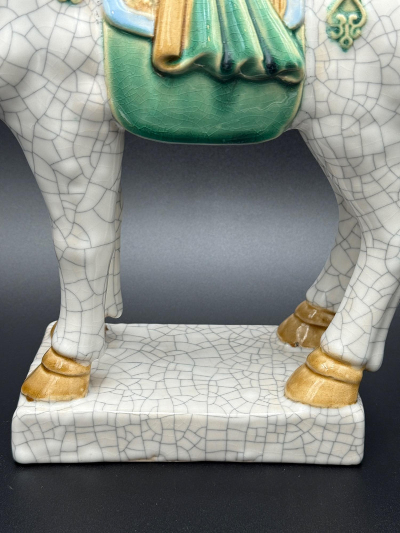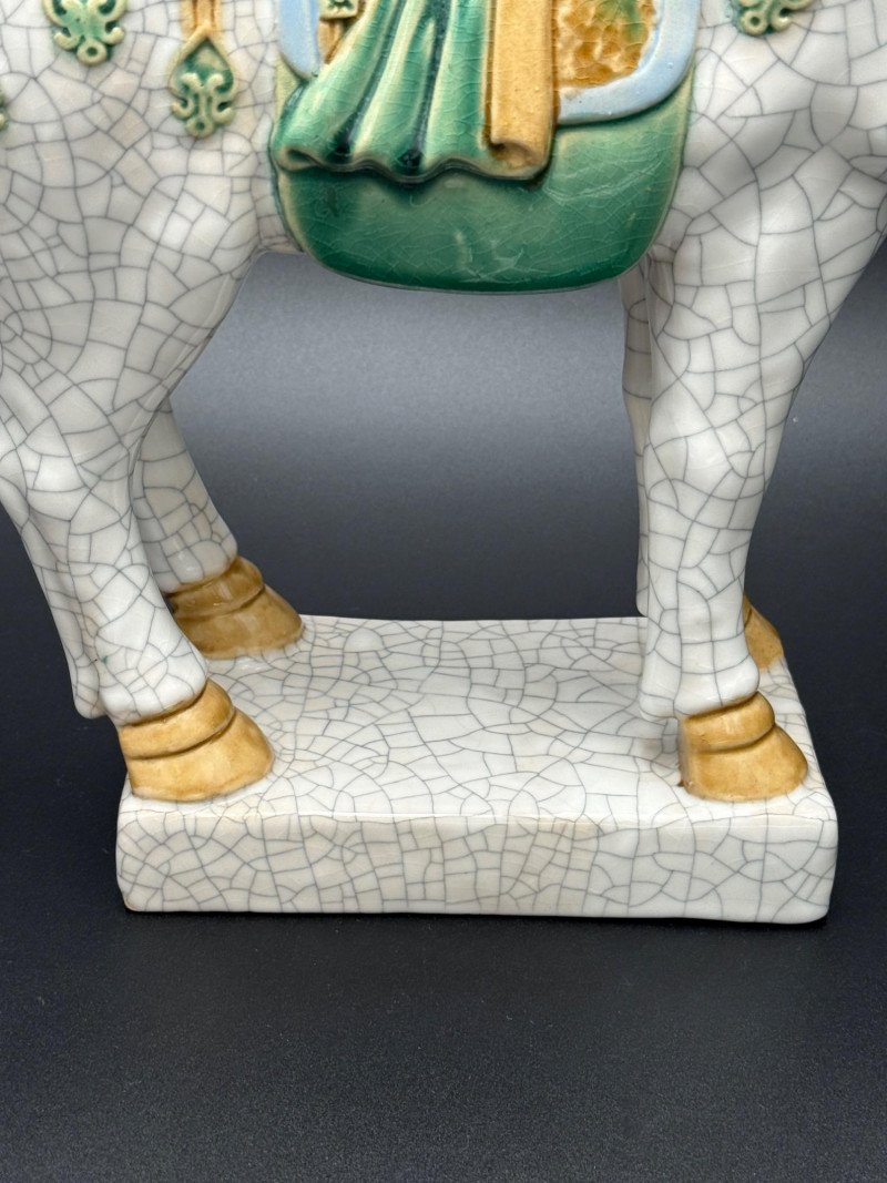Porcelain Horse Sculpture with Crackle Glaze, 16" Tall Figure of a horse standing with all four hooves on a rectangular base. The surface displays a crackle glaze throughout. The mane is ridged and falls along one side of the neck, and the tail is curled and bound. The horse is fitted with a saddle and cloth drapery in green and gold tones, along with a harness adorned with rosettes and suspended pendants. The head is lowered slightly and equipped with a bridle, reins, and collar featuring ornamental elements. Sticker label marked “Made in China” on the underside. Dimensions (approx.): 16 x 15 x 6 inches