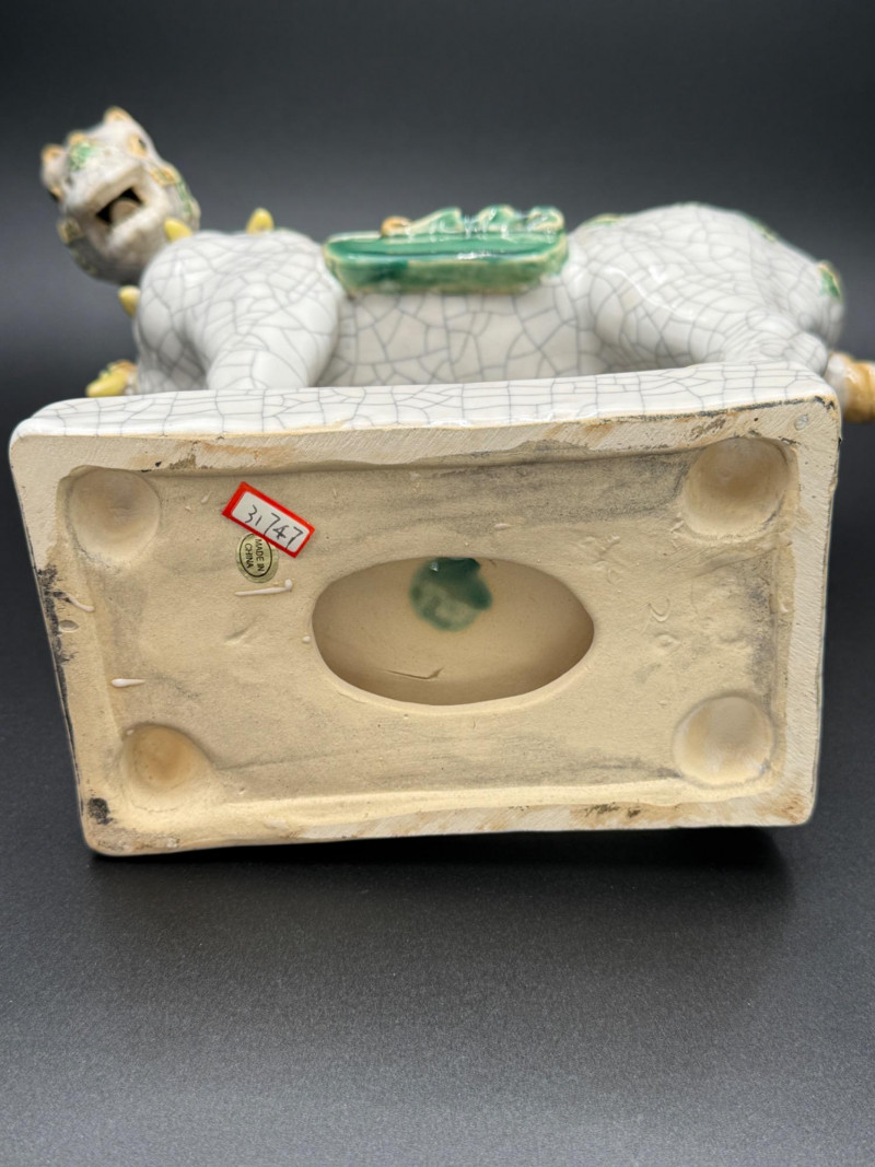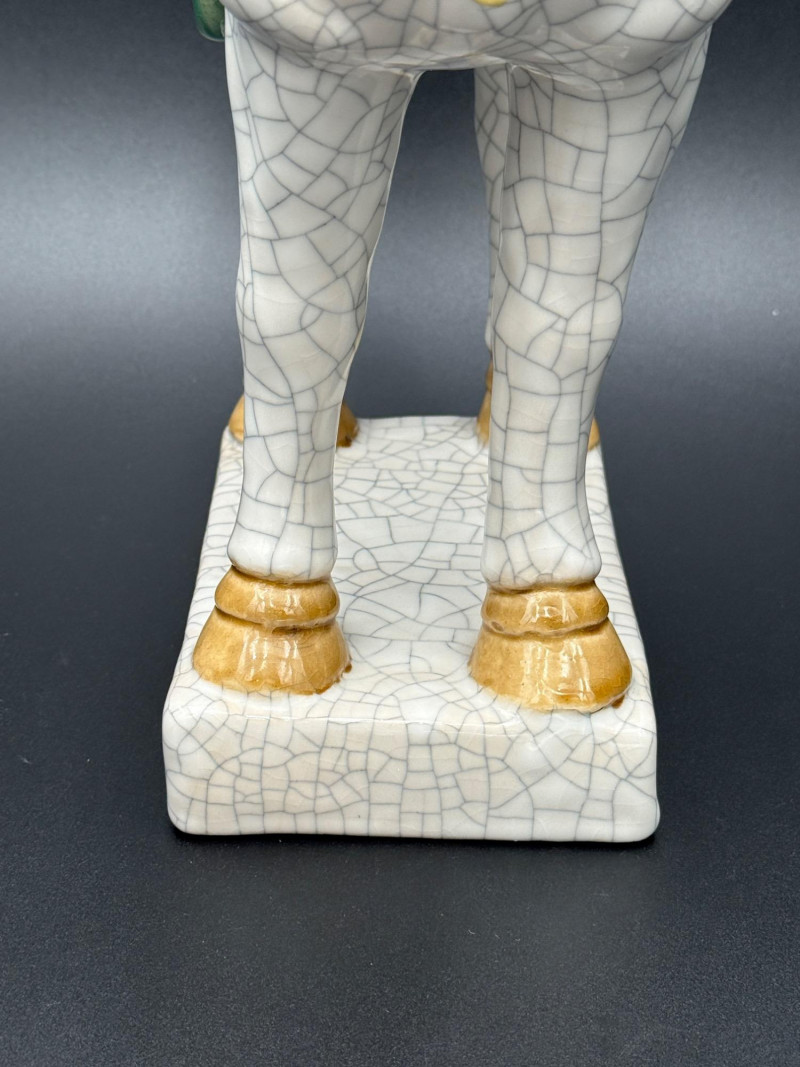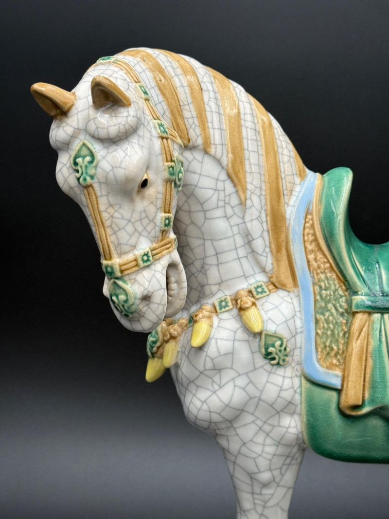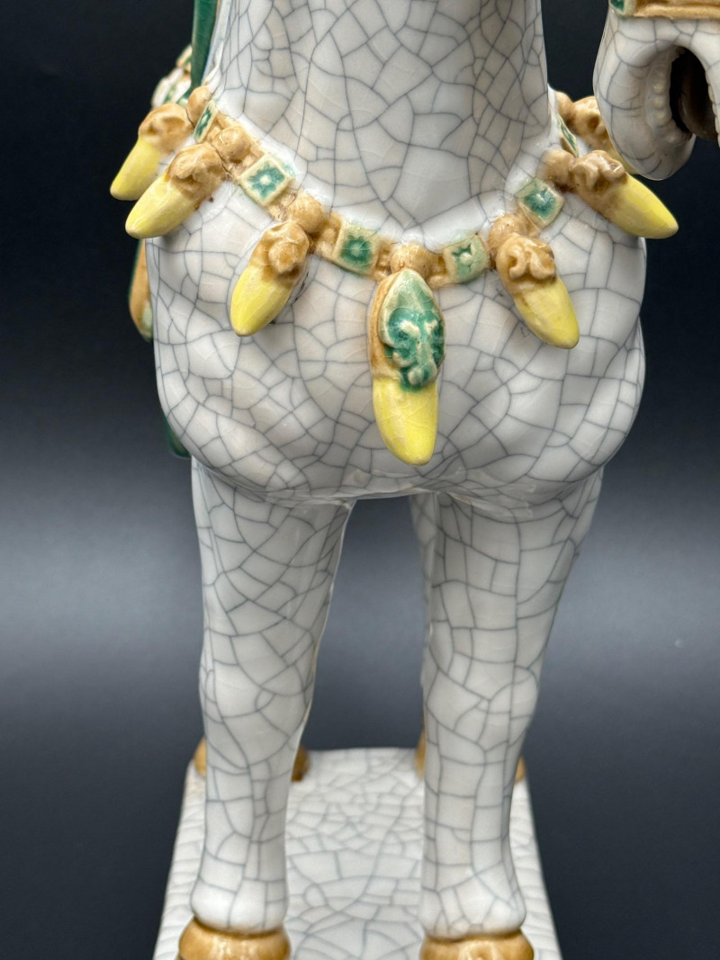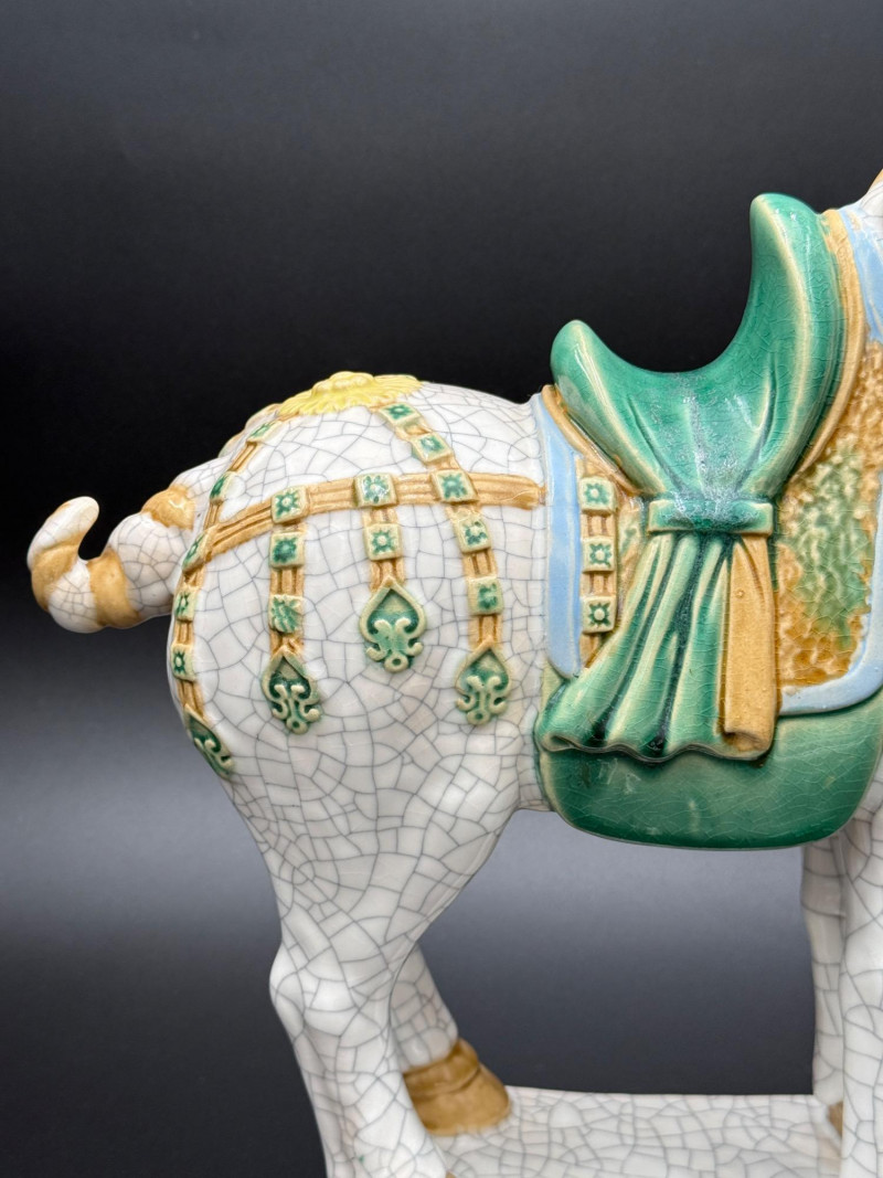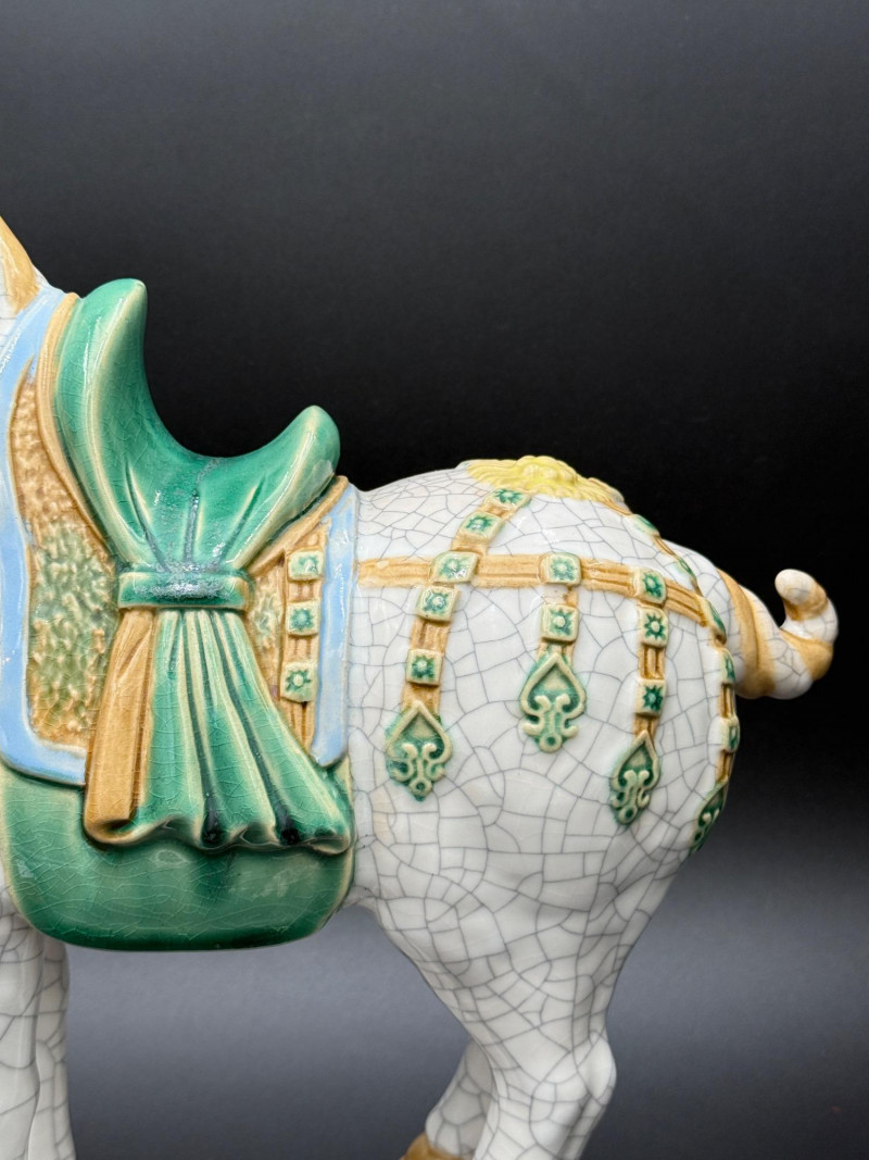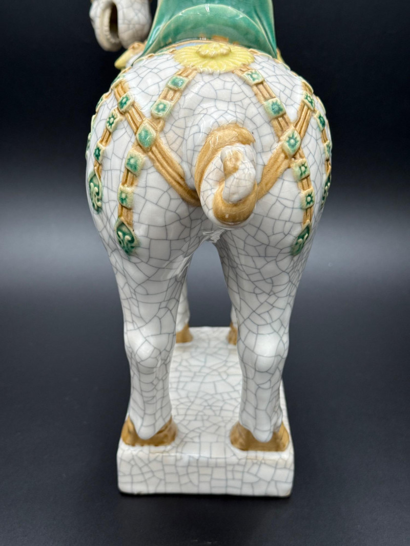 Porcelain Horse Sculpture with Crackle Glaze, 16" Tall Figure of a horse standing with all four hooves on a rectangular base. The surface displays a crackle glaze throughout. The mane is ridged and falls along one side of the neck, and the tail is curled and bound. The horse is fitted with a saddle and cloth drapery in green and gold tones, along with a harness adorned with rosettes and suspended pendants. The head is lowered slightly and equipped with a bridle, reins, and collar featuring ornamental elements. Sticker label marked “Made in China” on the underside. Dimensions (approx.): 16 x 15 x 6 inches