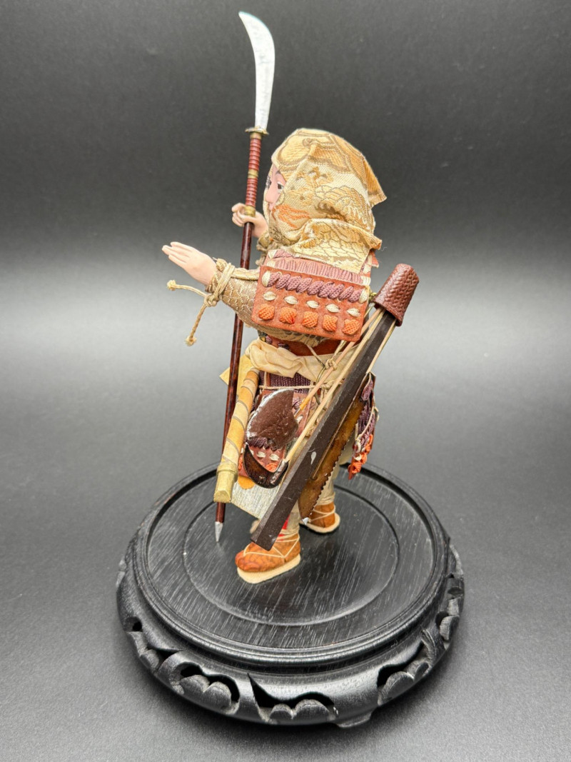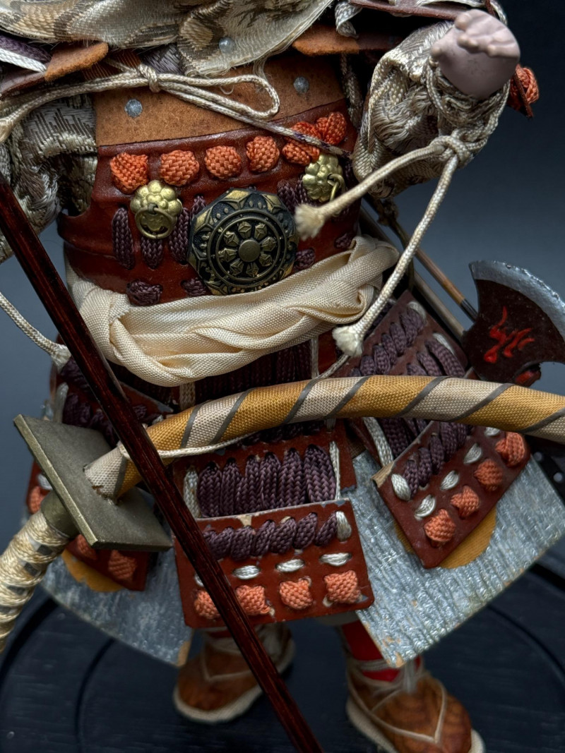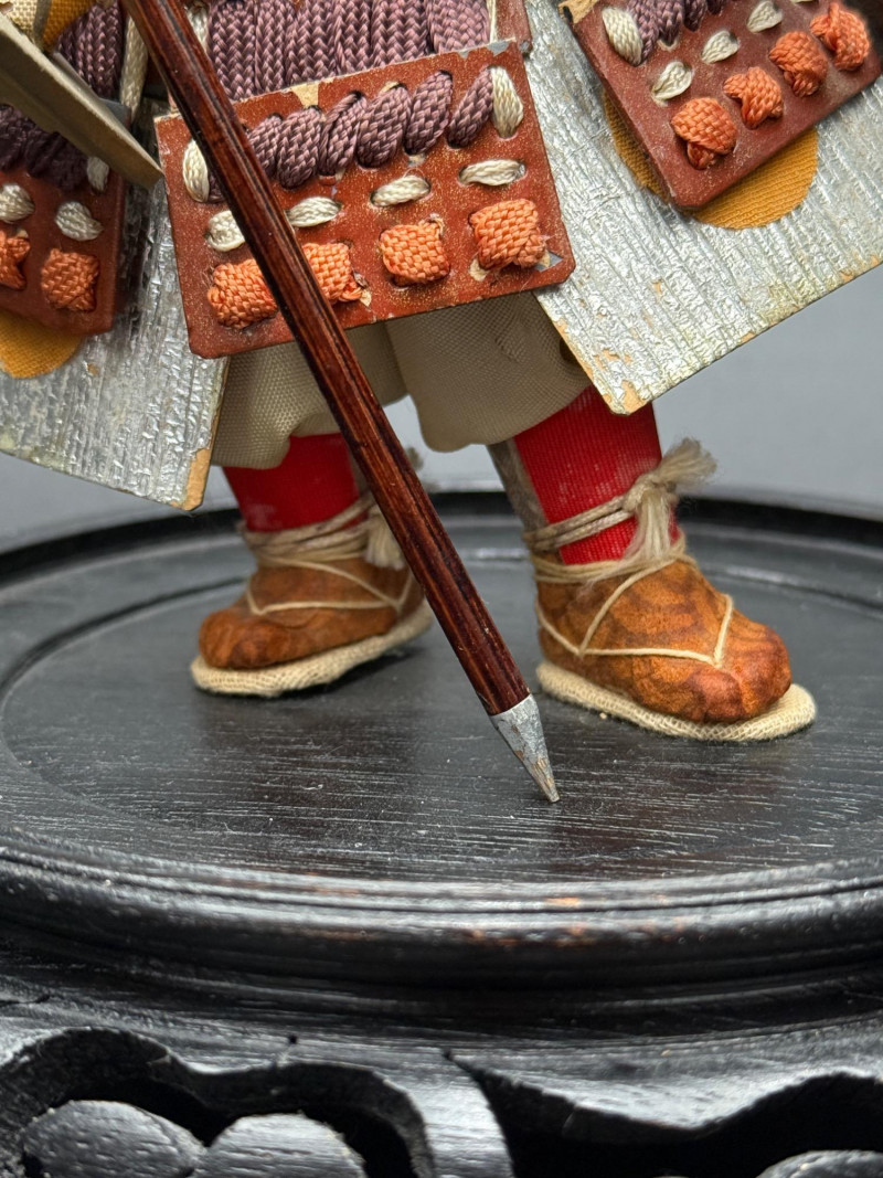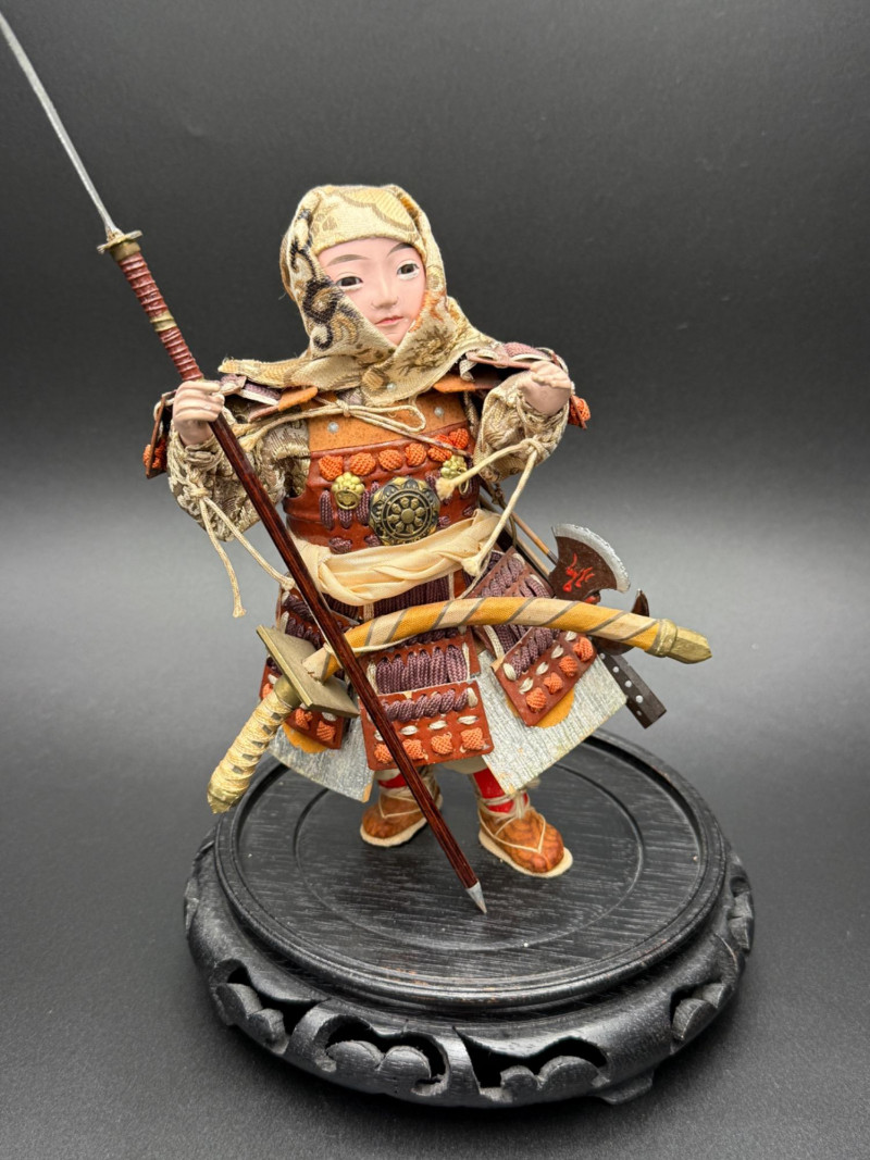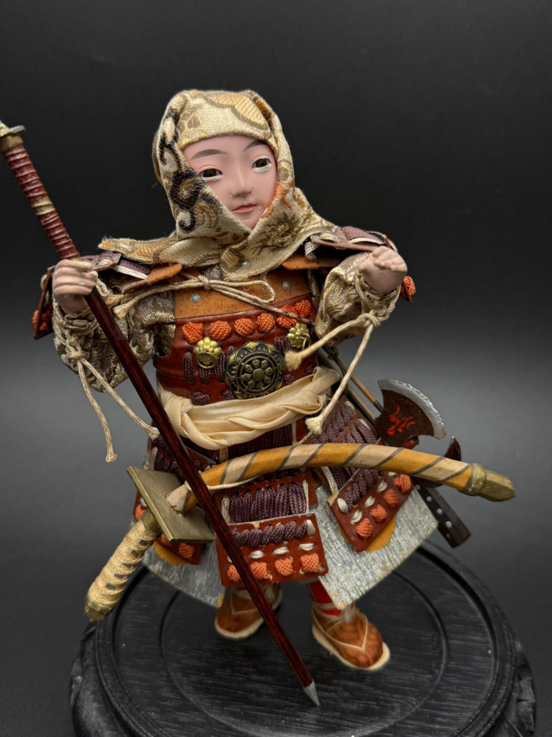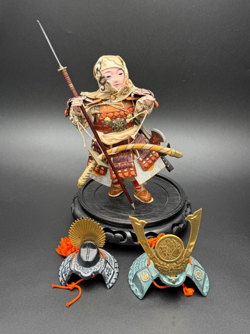 Japanese Warrior Doll with Helmets Figure of a Japanese warrior in full armor, posed holding a yari and equipped with a sword, bow, and quiver. The figure incorporates multiple materials including textile, wood, and metal. The garments and armor sections are constructed with layered components, tied and secured with cord and fastenings. The face is crafted with detailed facial features and painted expression. Includes three removable kabuto-style helmets, each with distinct crests and front plates. The helmets are made of metal and are decorated with orange tassels. Dimensions: