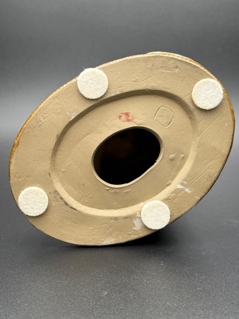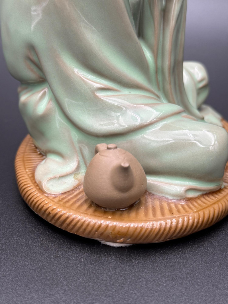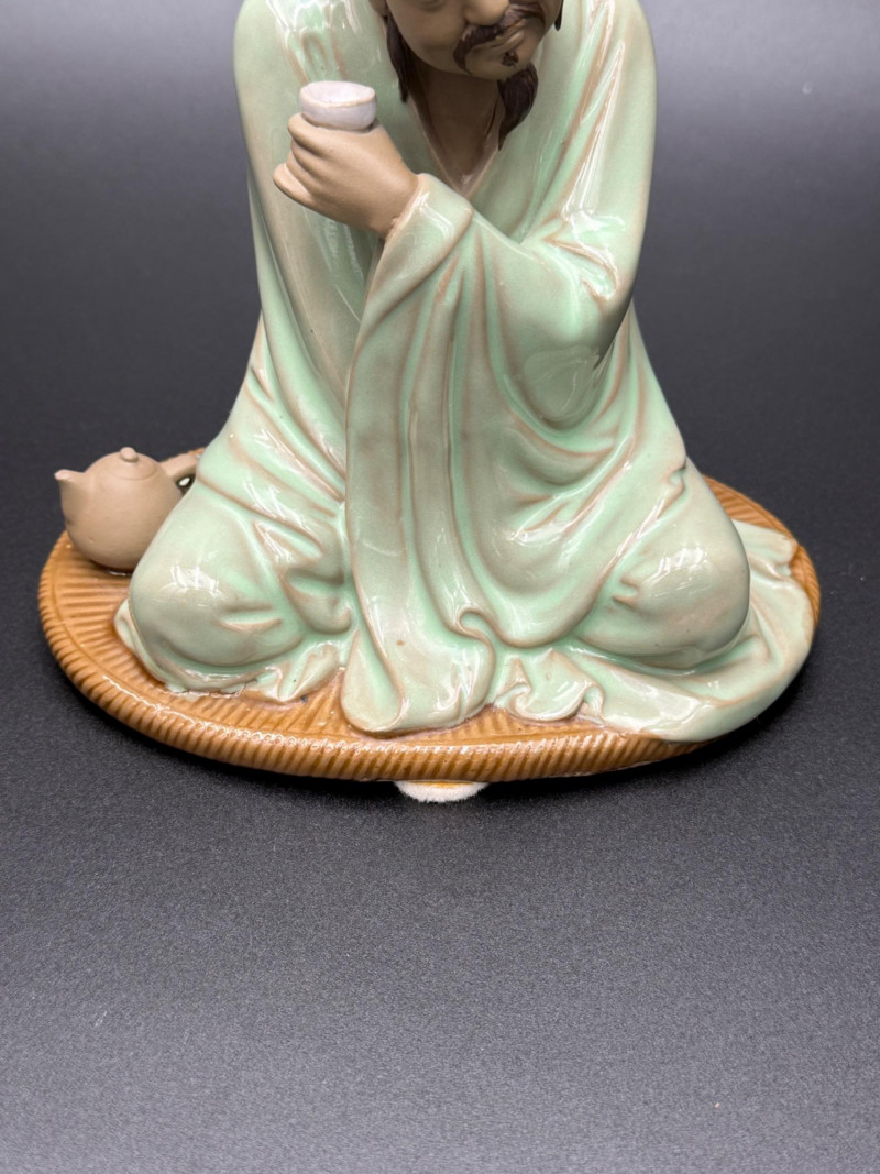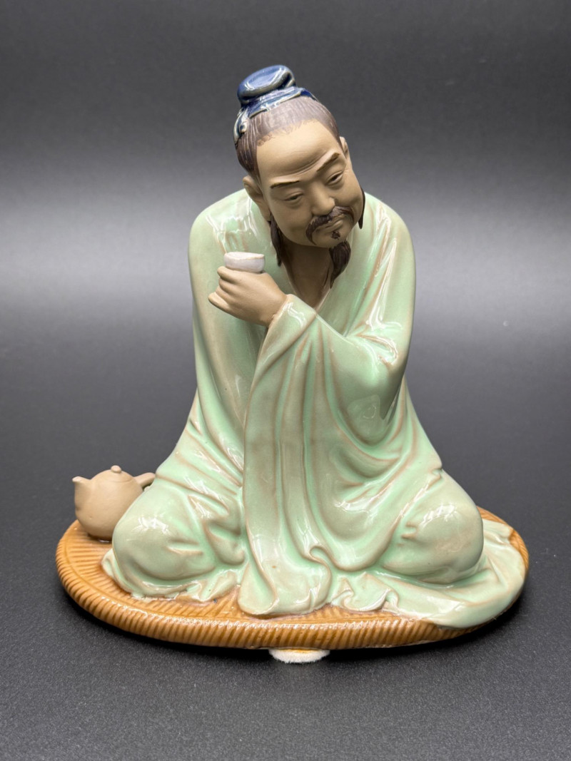 Chinese Mudman Figurine Seated with Teacup Chinese ceramic figure depicting a seated man holding a cup in his right hand. The figure is robed and positioned cross-legged on an oval base, with a small clay teapot placed beside his knee. His head is turned slightly, and his hair is tied in a topknot. The surface shows a pale celadon-style glaze over the robe, while the teapot and headpiece are left unglazed. The underside is hollow with an open center and bears an impressed seal and a red painted mark. Dimensions: