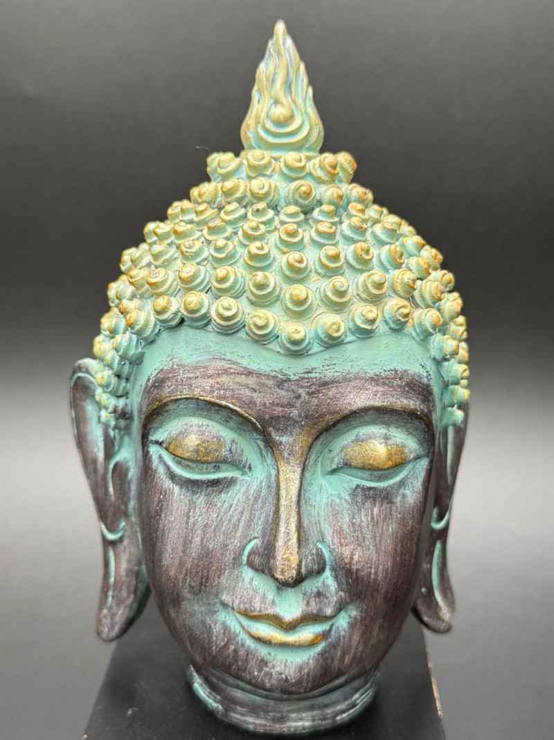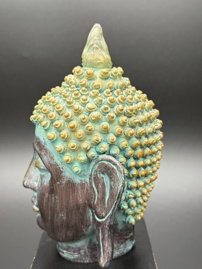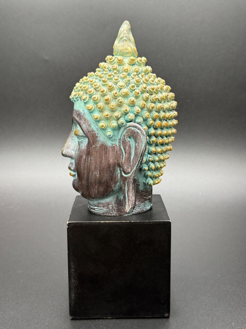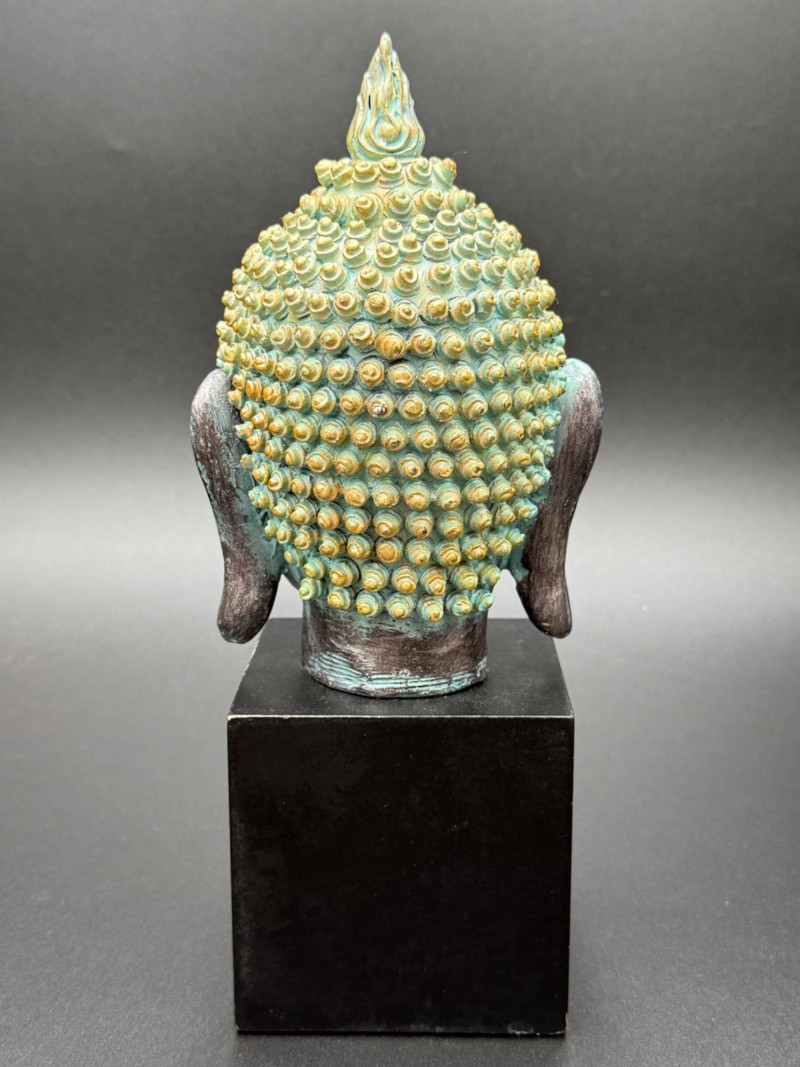 Metal Buddha Head Statue Statue of a Buddha head with closed eyes and elongated ears. The hair is composed of tightly coiled curls surrounding the ushnisha at the crown. The face shows arched brows, a straight nose, and a faint smile. The surface is finished in dark and green tones, giving the appearance of age.