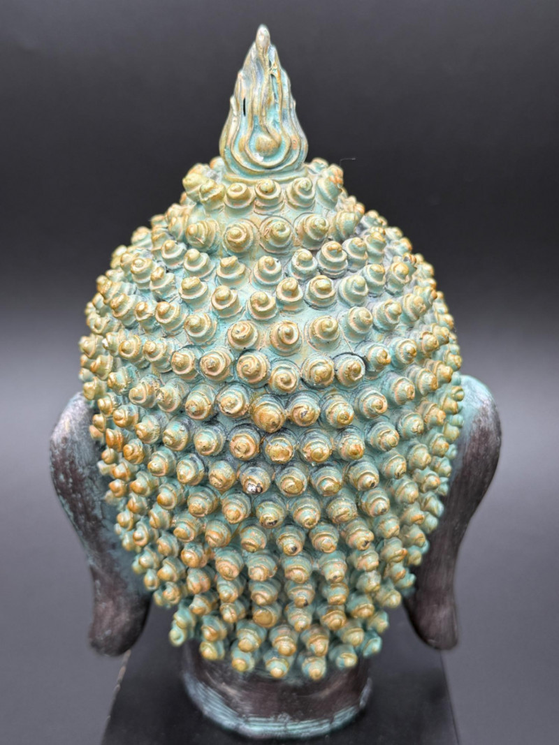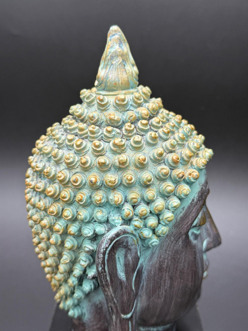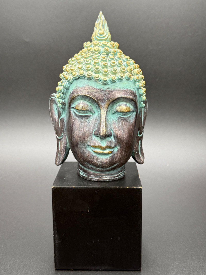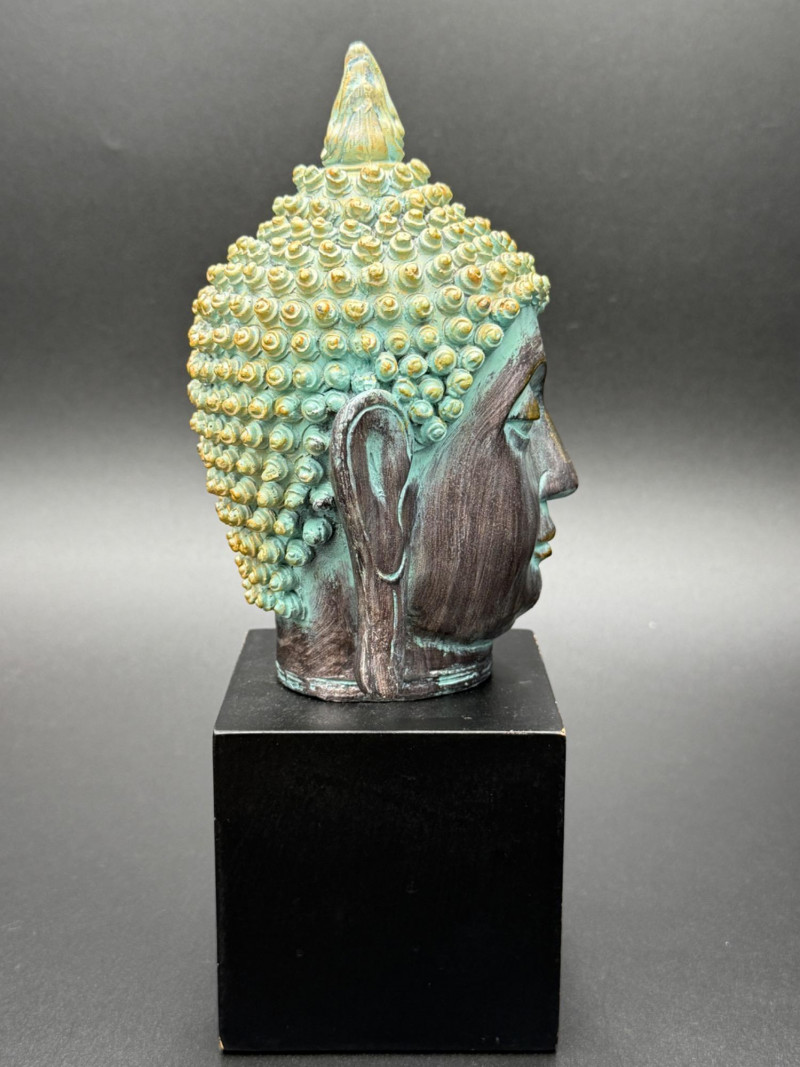 Metal Buddha Head Statue Statue of a Buddha head with closed eyes and elongated ears. The hair is composed of tightly coiled curls surrounding the ushnisha at the crown. The face shows arched brows, a straight nose, and a faint smile. The surface is finished in dark and green tones, giving the appearance of age.