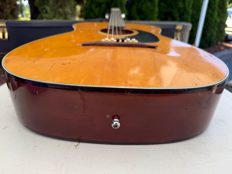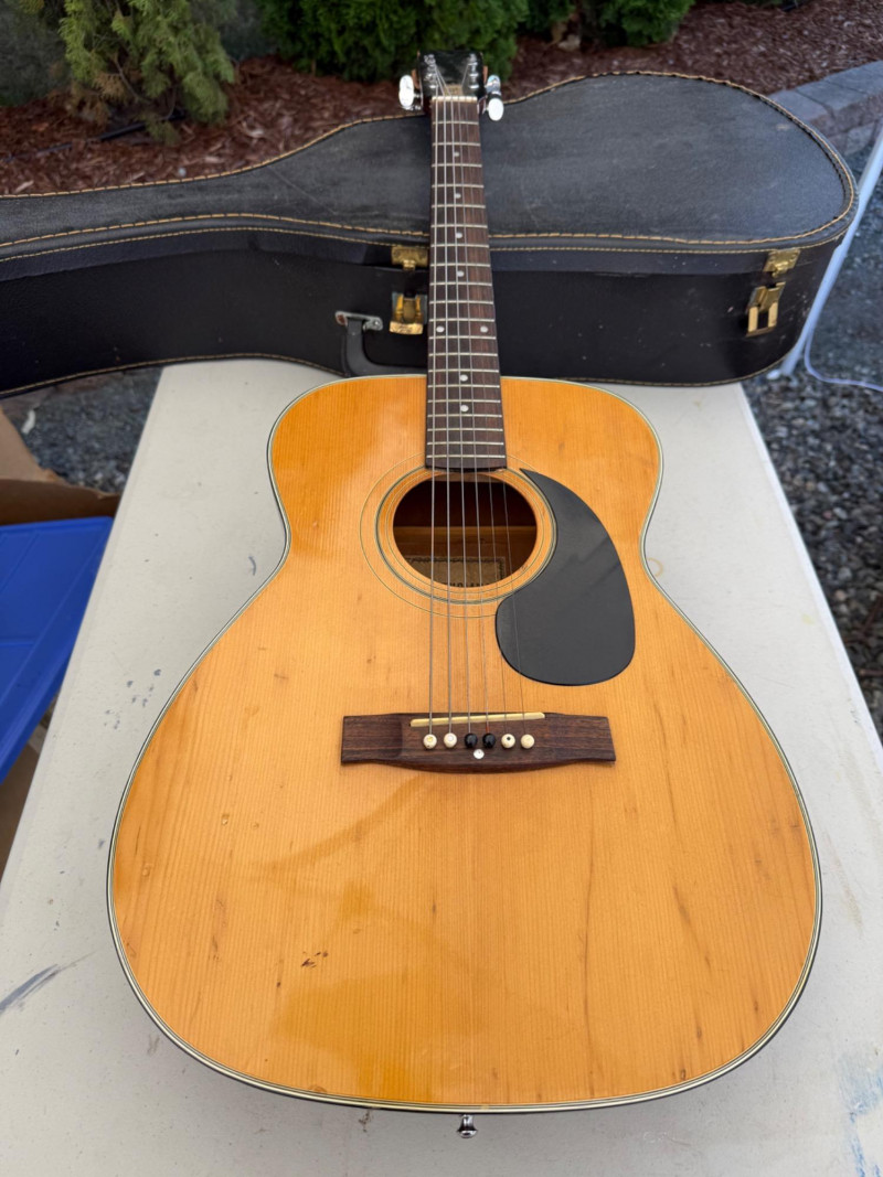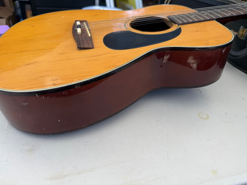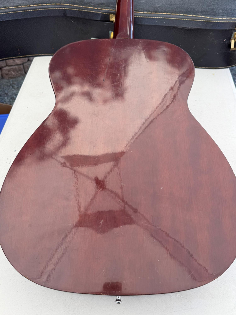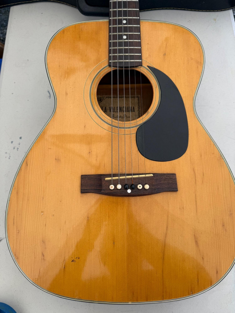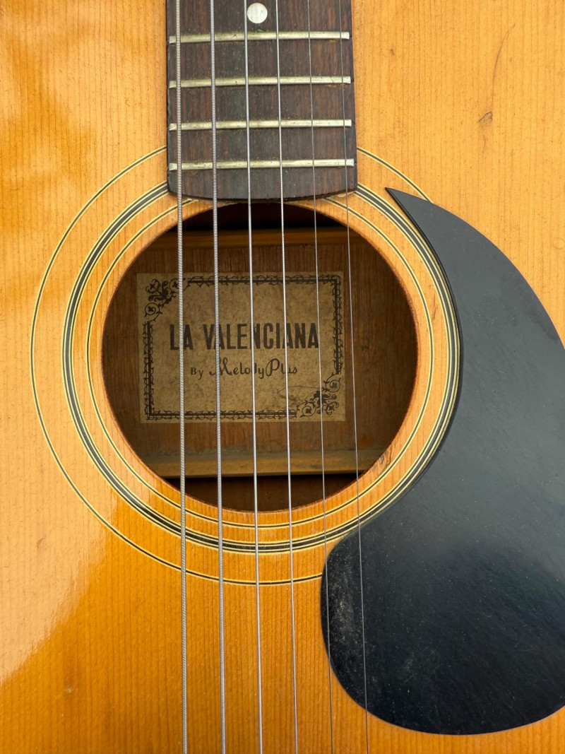 La Valencia by Melody Plus Acoustic Guitar – Affordable Elegance with Classic Charm The La Valencia by Melody Plus acoustic guitar is a stylish and accessible instrument, ideal for students, hobbyists, or collectors of entry-level vintage guitars. With its attractive finish, comfortable playability, and warm tone, this guitar offers a charming combination of affordability and musical value. Brand: La Valencia (by Melody Plus) Body Style: Dreadnought (or specify if it’s a parlor or concert size) Top: Laminated spruce or hardwood (model dependent) Back & Sides: Mahogany-tone or natural wood laminate Neck: Hardwood neck with smooth finish Fretboard: Rosewood or painted hardwood with dot inlays Bridge: Fixed bridge with plastic or composite saddle Finish: Gloss sunburst or natural finish (varies by model) Made in: Likely Taiwan or Korea (typical of Melody Plus branding, 1970s–1980s) Key Features: