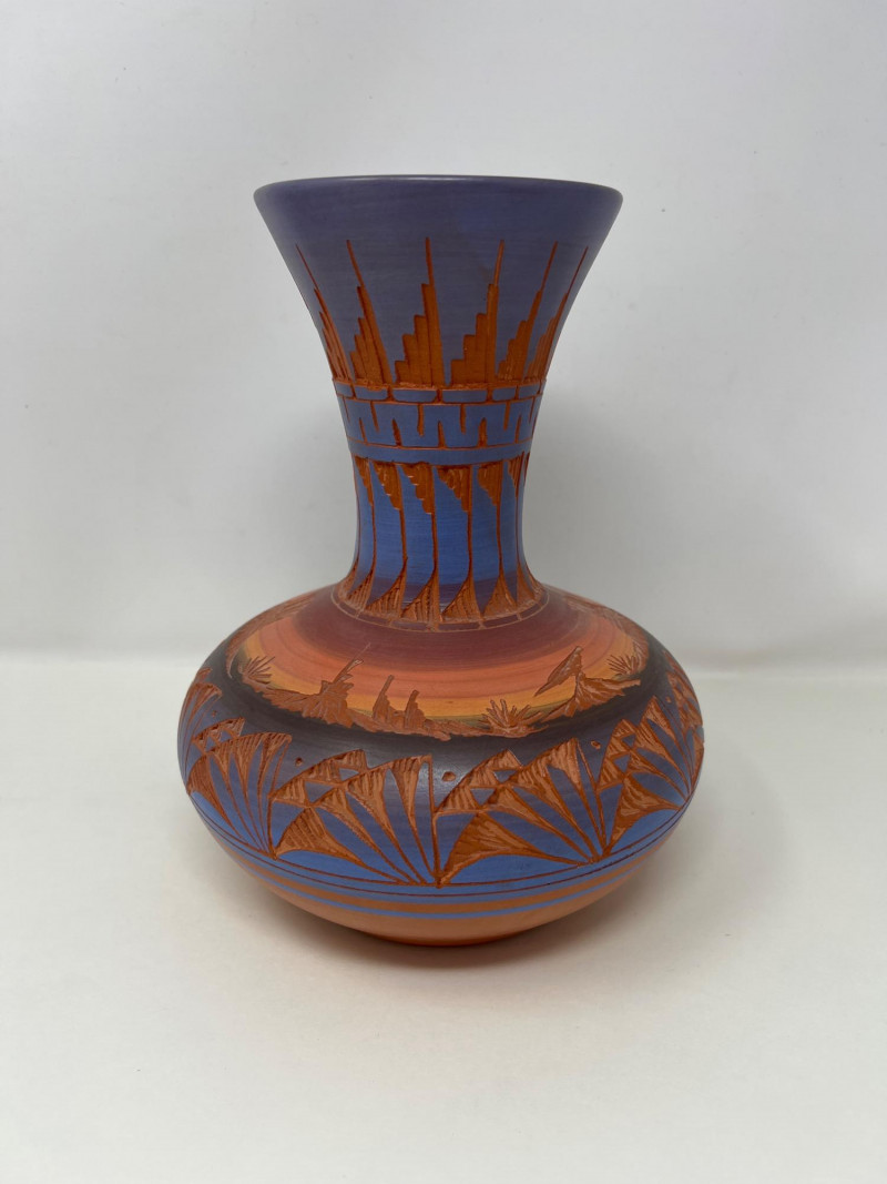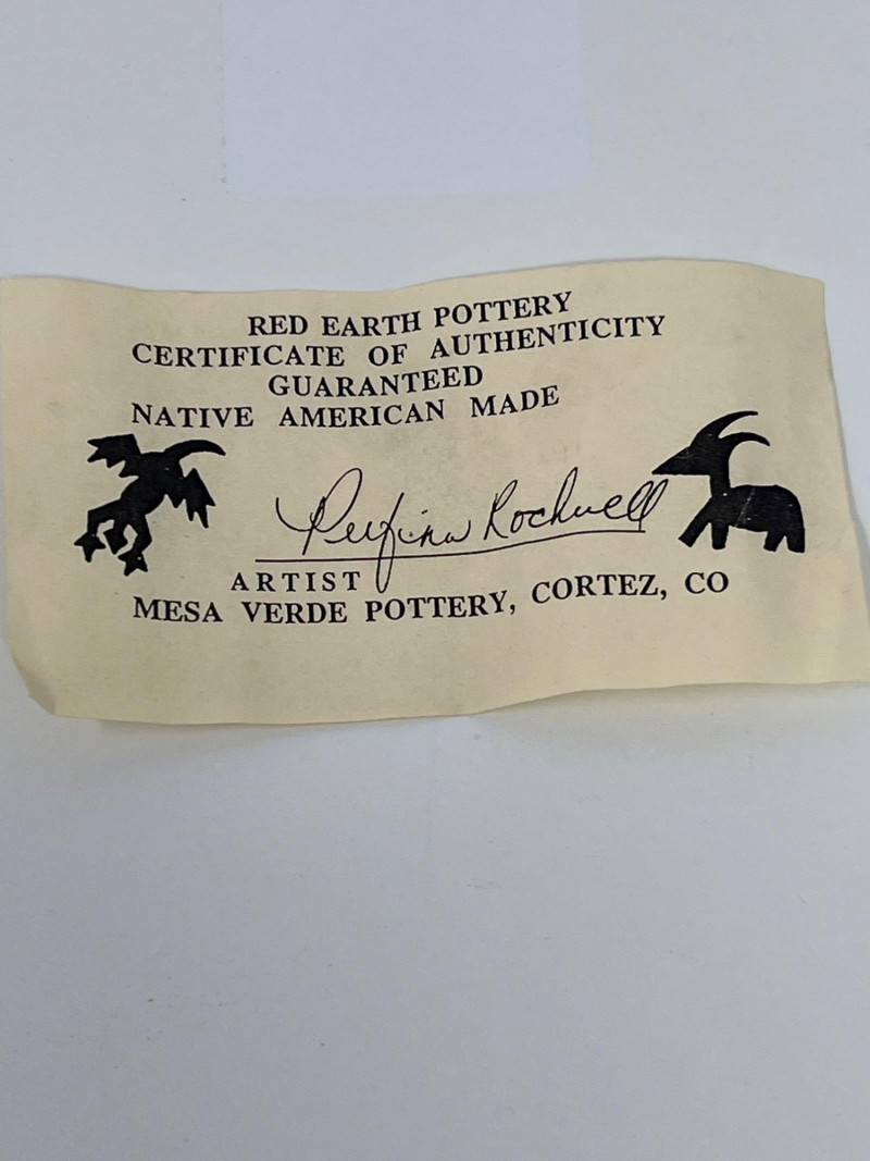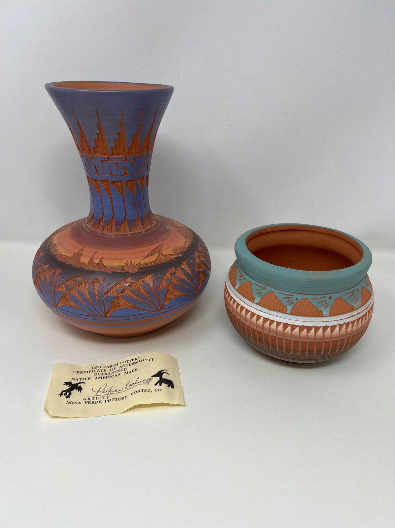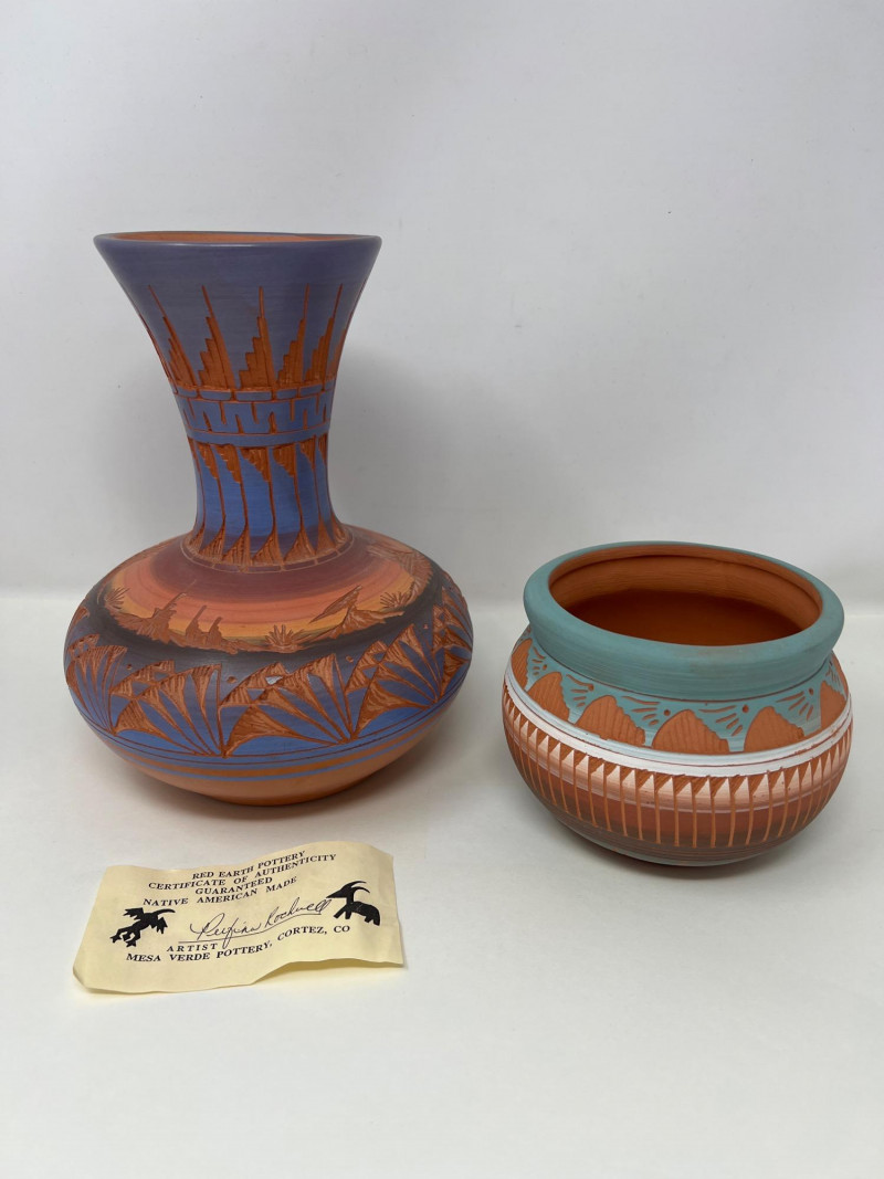 Two handcrafted and signed Native American pottery pieces by noted artists Tony Yazzie (Navajo) and Perfina Rockwell (Mesa Verde Pottery, Red Earth line). Each piece showcases detailed etching, traditional motifs, and painted finishes. Tall vase signed by Perfina Rockwell (Mesa Verde Pottery, Cortez, CO), includes original COA (9 inches tall x 7.5 inches round) Shorter jar signed by Tony Yazzie (Navajo) (4 inches tall x 5.5 inches round) Hand-etched and painted earthenware with rich Southwestern colors