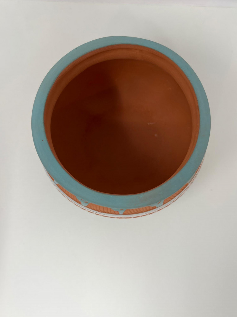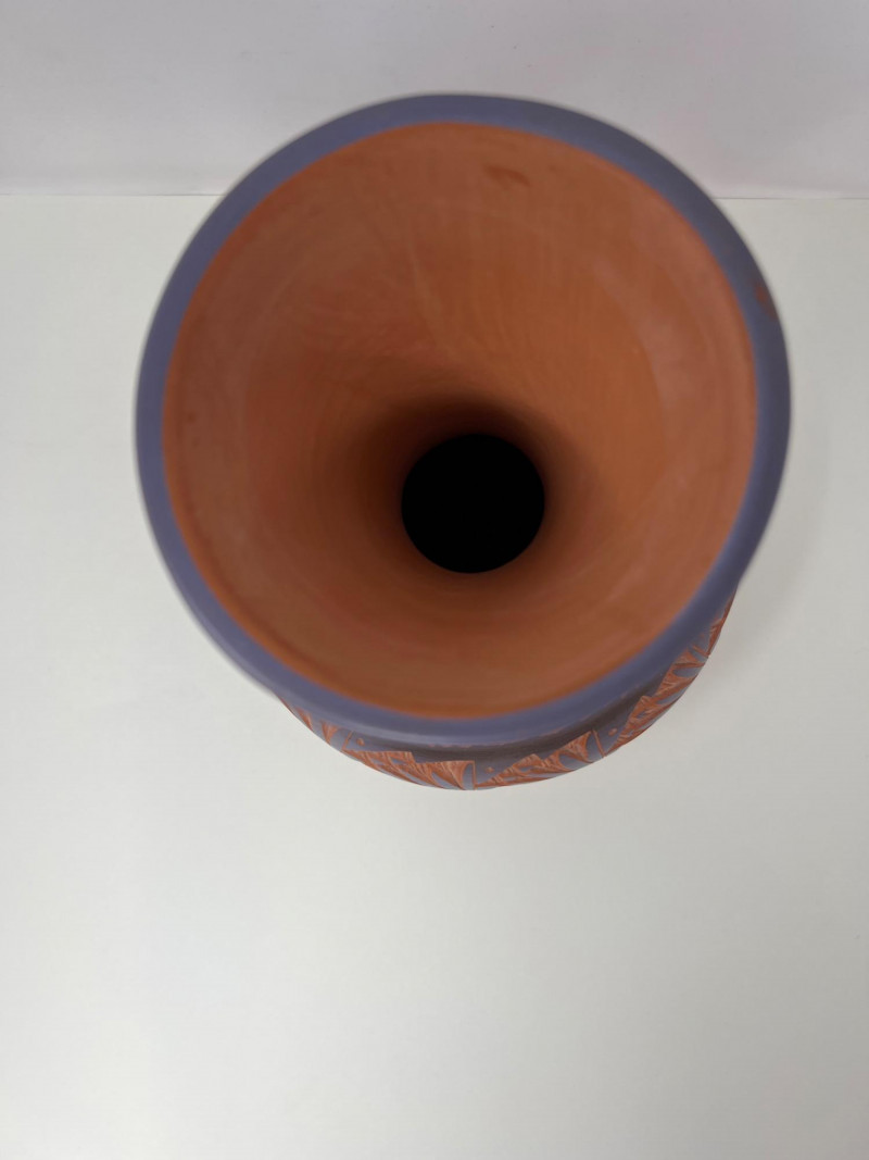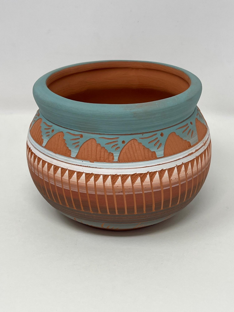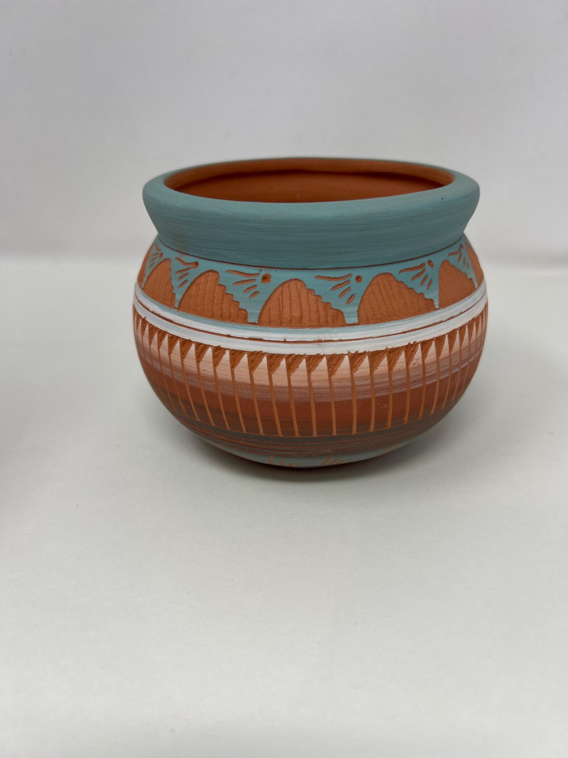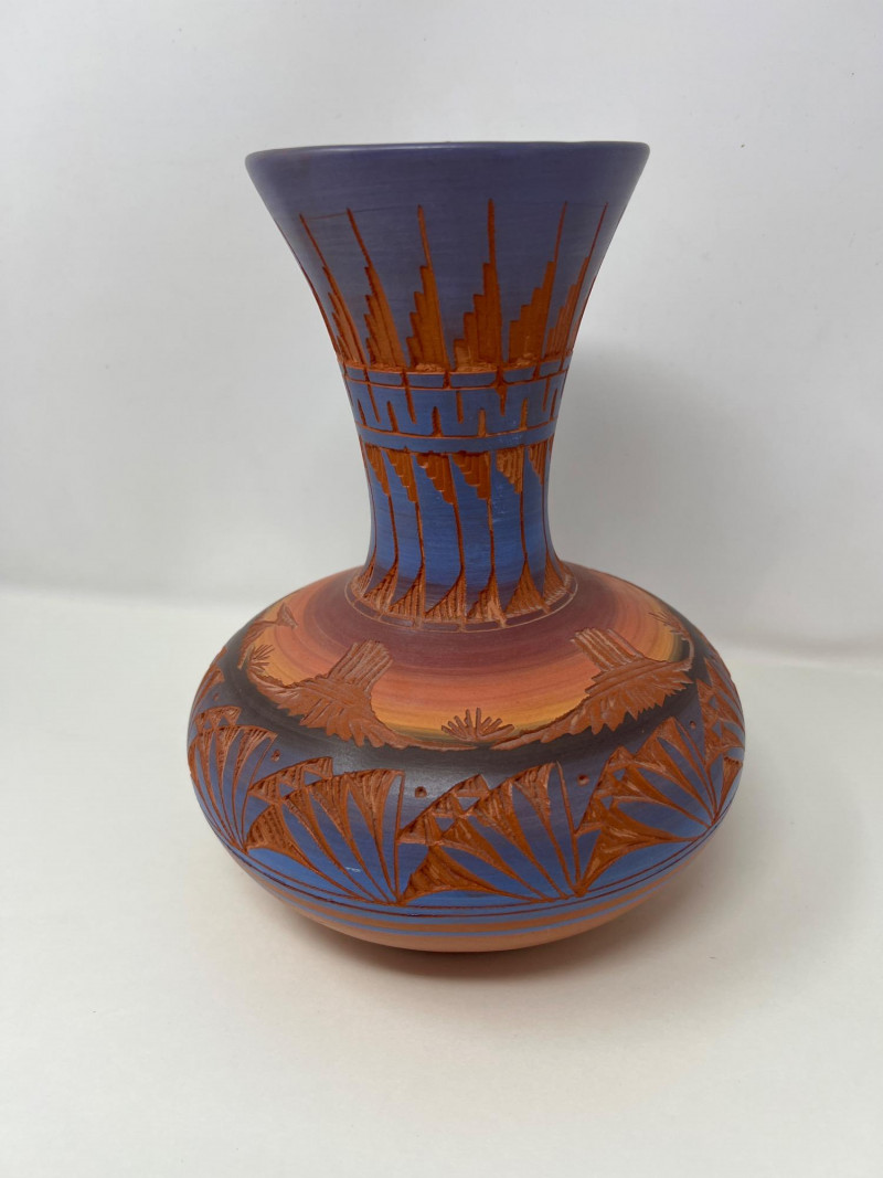 Two handcrafted and signed Native American pottery pieces by noted artists Tony Yazzie (Navajo) and Perfina Rockwell (Mesa Verde Pottery, Red Earth line). Each piece showcases detailed etching, traditional motifs, and painted finishes. Tall vase signed by Perfina Rockwell (Mesa Verde Pottery, Cortez, CO), includes original COA (9 inches tall x 7.5 inches round) Shorter jar signed by Tony Yazzie (Navajo) (4 inches tall x 5.5 inches round) Hand-etched and painted earthenware with rich Southwestern colors