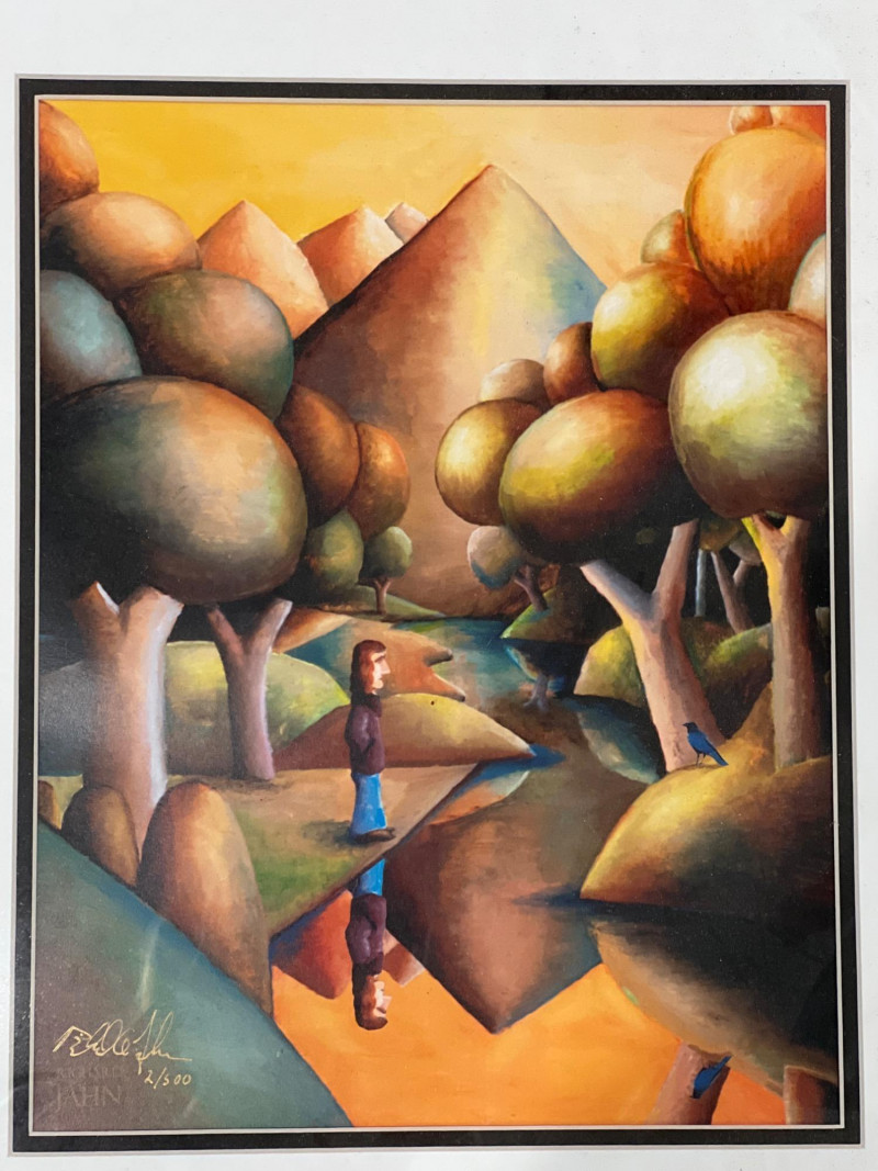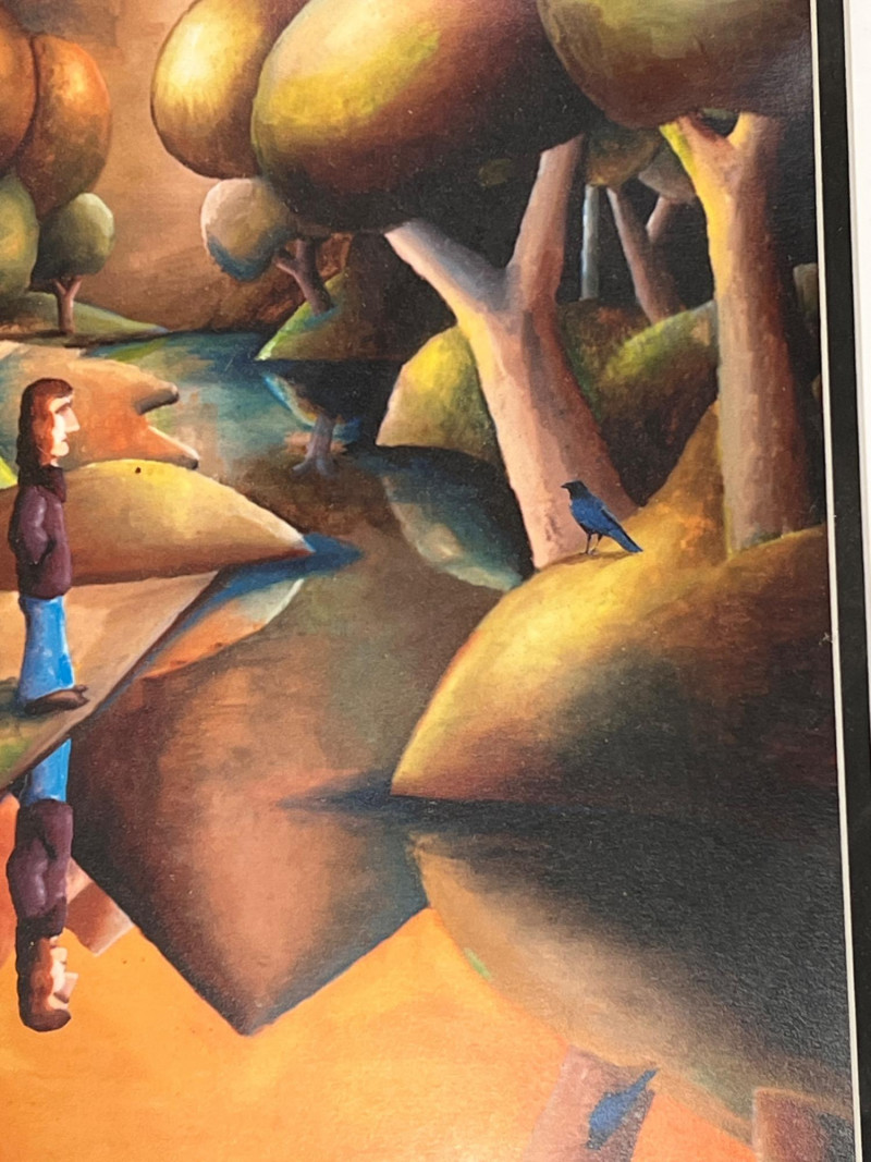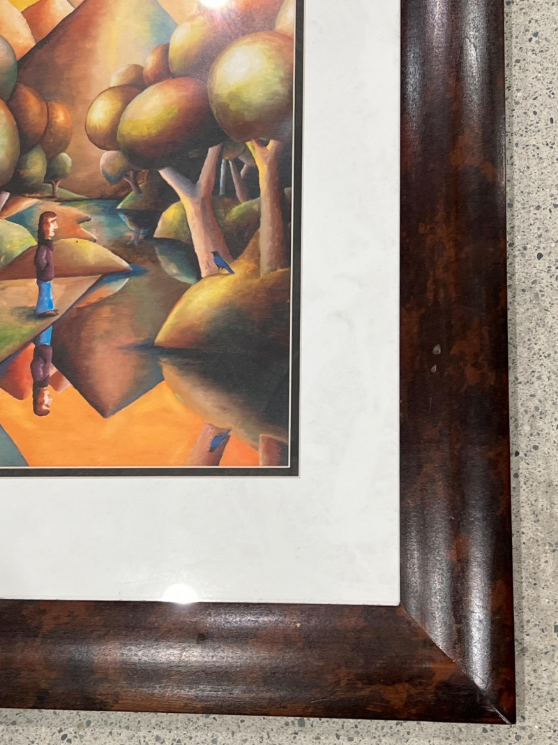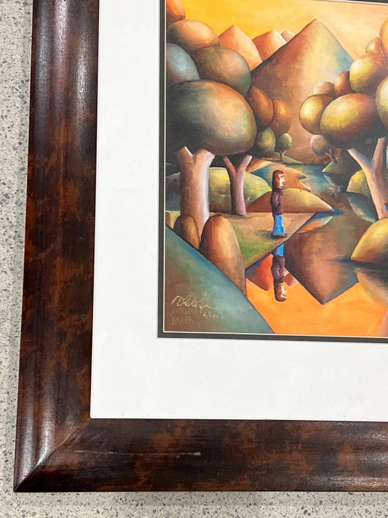 Vibrant and surreal, Reflections by Richard Jahn is a limited-edition lithograph that merges stylized landscape with meditative presence. Signed in print, and also with a personal signature in gold ink, this lithograph is numbered 2/500. His compelling work depicts a serene forest with rounded trees, gentle mountains, and a solitary figure mirrored in a still stream—echoing both visual reflection and introspective calm. Presented in a glossy wood frame with white matting, the piece delivers striking color and emotional stillness. A captivating addition to any contemporary, nature-inspired, or surrealist art collection. Hand-signed & a limited edition - number 2 of 500 Title: Reflections Artist: Richard Jahn Medium: Lithograph Frame: Glossy brown wood frame with white mat