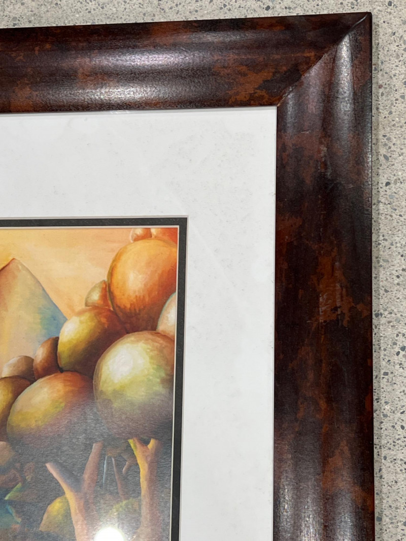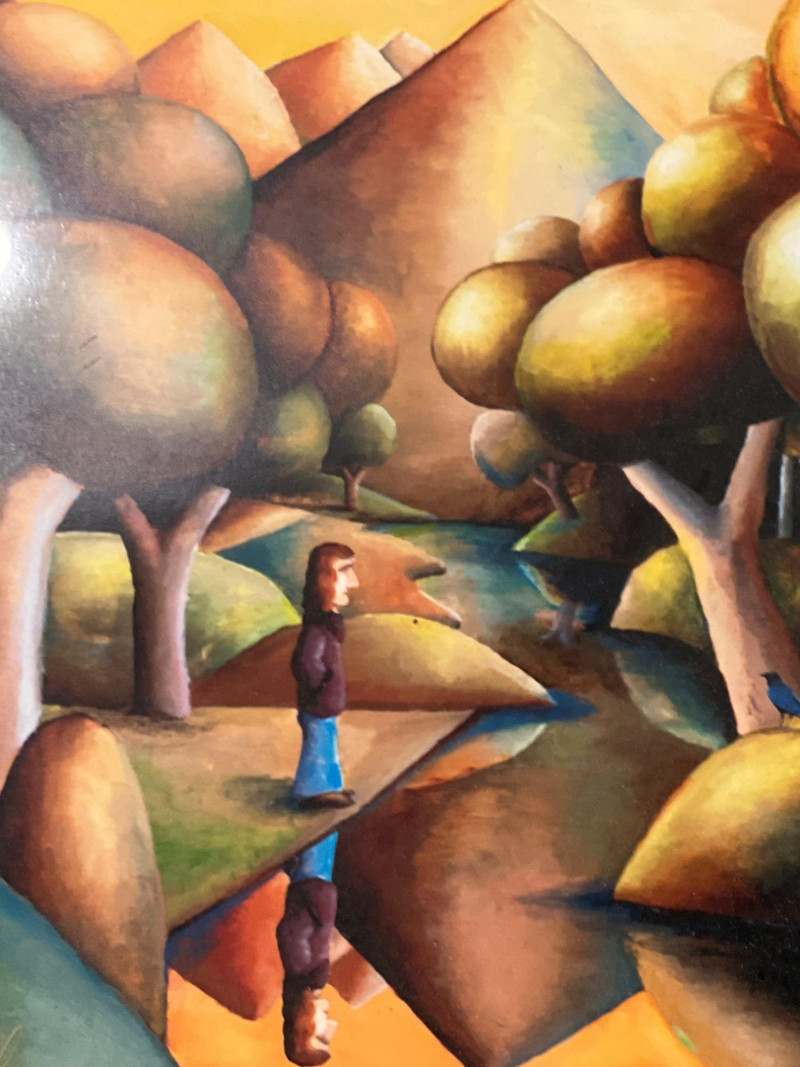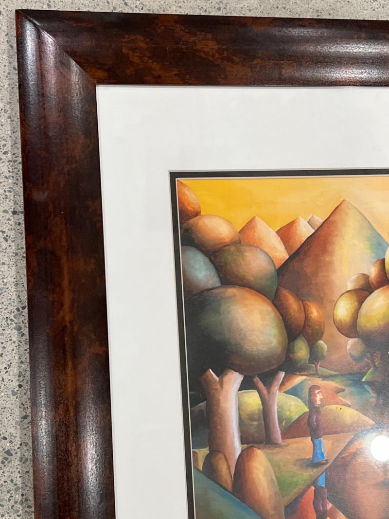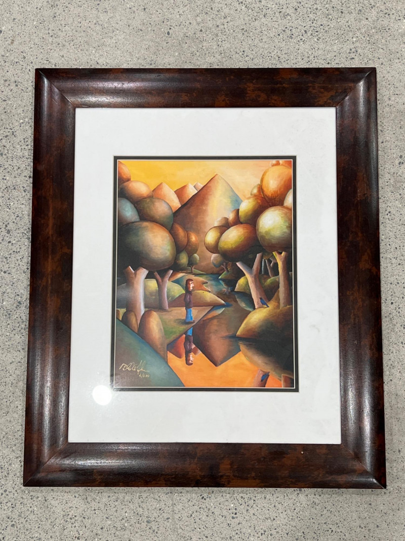 Vibrant and surreal, Reflections by Richard Jahn is a limited-edition lithograph that merges stylized landscape with meditative presence. Signed in print, and also with a personal signature in gold ink, this lithograph is numbered 2/500. His compelling work depicts a serene forest with rounded trees, gentle mountains, and a solitary figure mirrored in a still stream—echoing both visual reflection and introspective calm. Presented in a glossy wood frame with white matting, the piece delivers striking color and emotional stillness. A captivating addition to any contemporary, nature-inspired, or surrealist art collection. Hand-signed & a limited edition - number 2 of 500 Title: Reflections Artist: Richard Jahn Medium: Lithograph Frame: Glossy brown wood frame with white mat