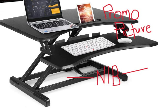 Brand-new and unused SIMBR adjustable standing desk, still in original manufacturer packaging. Ideal for creating a sit-stand workstation at home or in the office. Model: VM-GSD63 SKU: USAN1012779 Adjustable height desktop riser for dual monitors Includes keyboard tray platform Weight: 13.5 kg