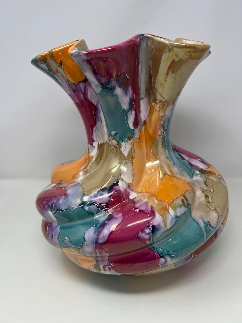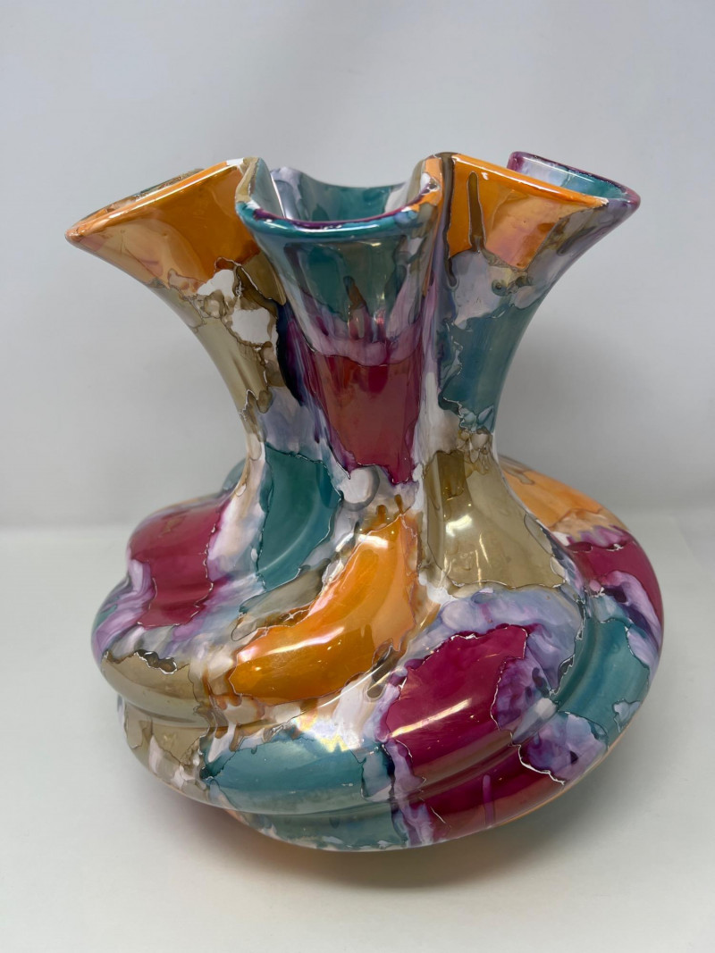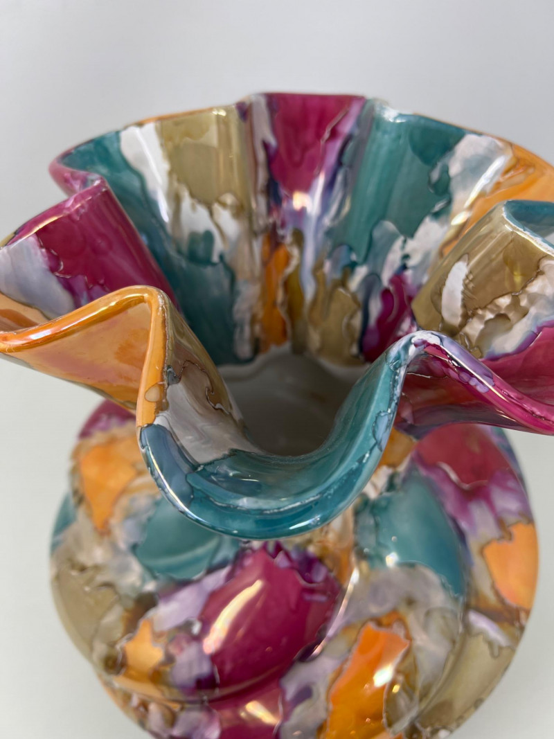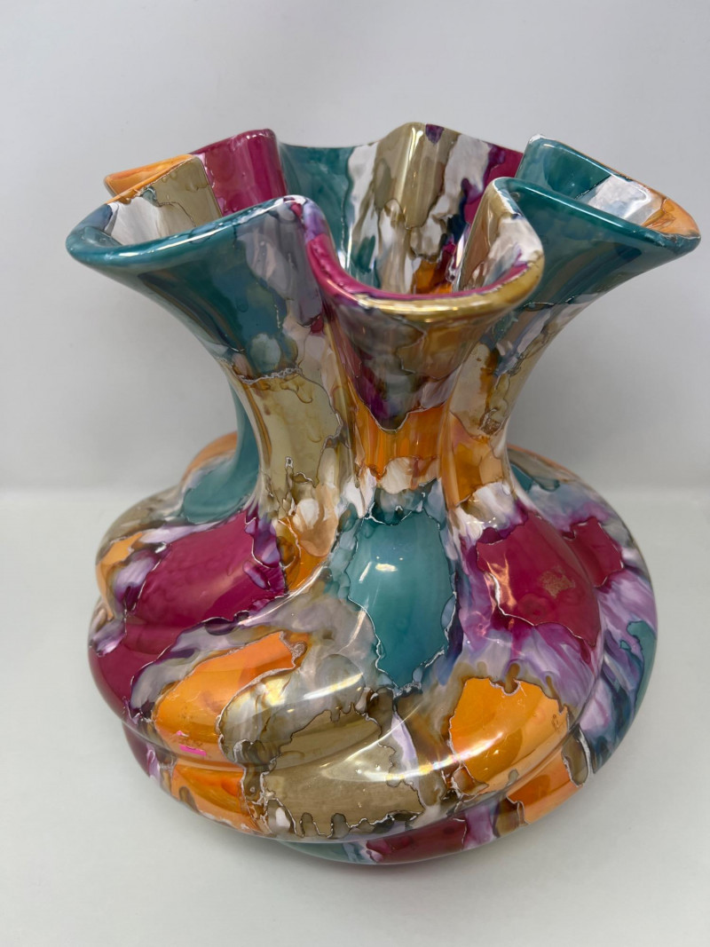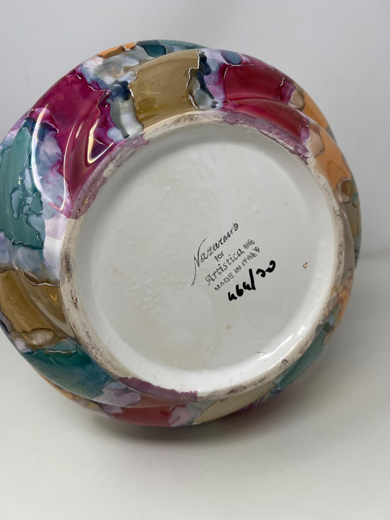 Hand-blown Italian art glass vase by Nazareno Picchiotti for Artistica, Inc. Deruta is best known for its centuries-old ceramic traditions, however, Nazareno brought a bold, contemporary voice to the Deruta legacy. His work for Artistica blends traditional Italian craftsmanship with postmodern design sensibilities, making pieces like this vase a "bridge between eras". The design reflects a 1980's influence with its multi-spouted top and swirling marbled palette of cobalt, orange, and pink. Signed “Nazareno for Artistica Inc – Made in Italy” Number on base states “464/30” Note: If you missed owning this lot (or if the size is too large for your decoration purposes) - be sure to visit Lot 60 where a 7 inch tall vase similar to this one is offered. Due to Size/Fragility: This Item Is Not Eligible for Shipping. Available for Local Pickup Only.