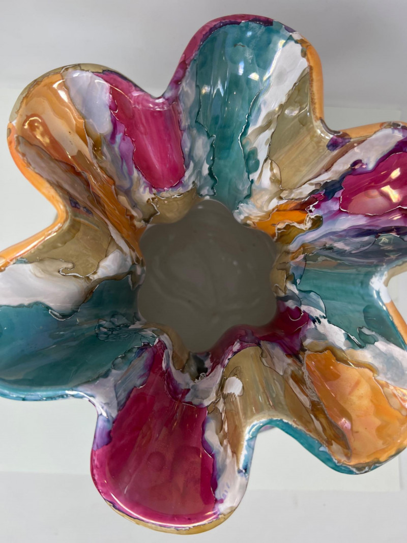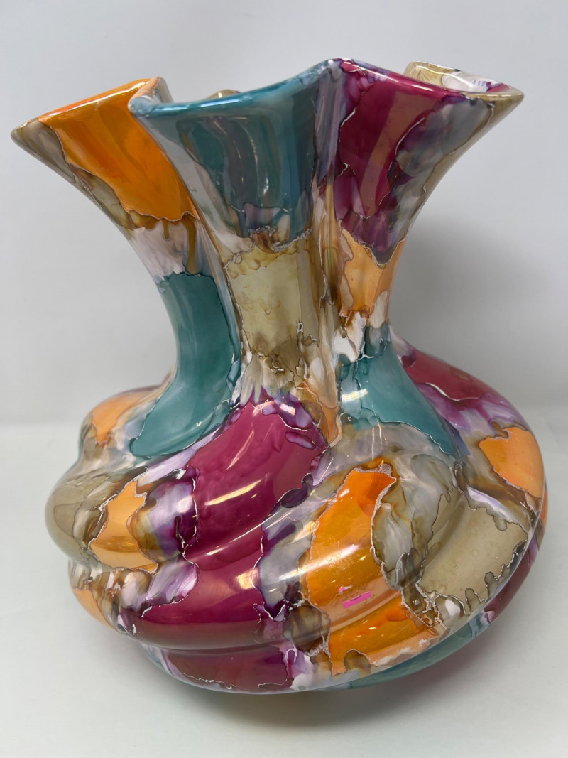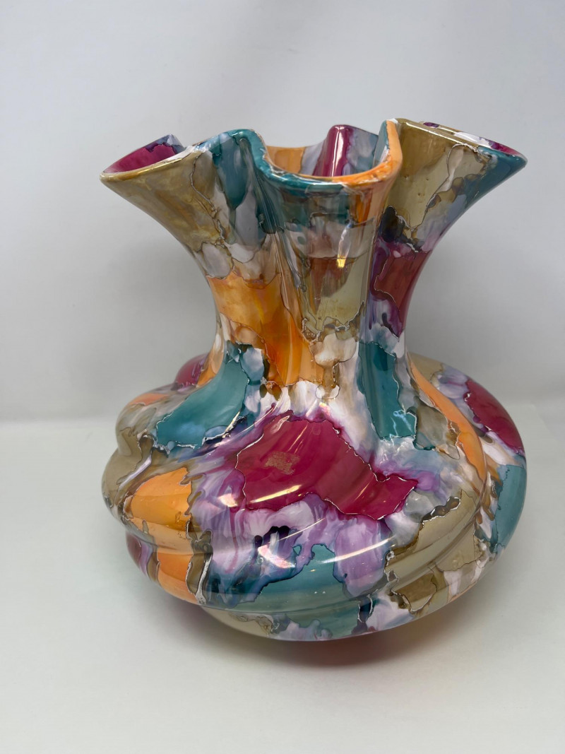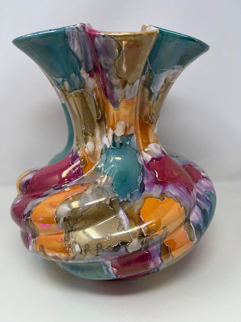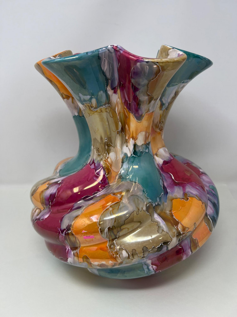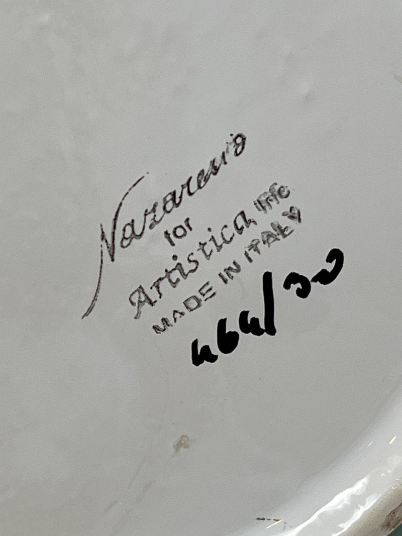 Hand-blown Italian art glass vase by Nazareno Picchiotti for Artistica, Inc. Deruta is best known for its centuries-old ceramic traditions, however, Nazareno brought a bold, contemporary voice to the Deruta legacy. His work for Artistica blends traditional Italian craftsmanship with postmodern design sensibilities, making pieces like this vase a "bridge between eras". The design reflects a 1980's influence with its multi-spouted top and swirling marbled palette of cobalt, orange, and pink. Signed “Nazareno for Artistica Inc – Made in Italy” Number on base states “464/30” Note: If you missed owning this lot (or if the size is too large for your decoration purposes) - be sure to visit Lot 60 where a 7 inch tall vase similar to this one is offered. Due to Size/Fragility: This Item Is Not Eligible for Shipping. Available for Local Pickup Only.