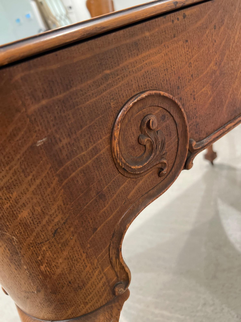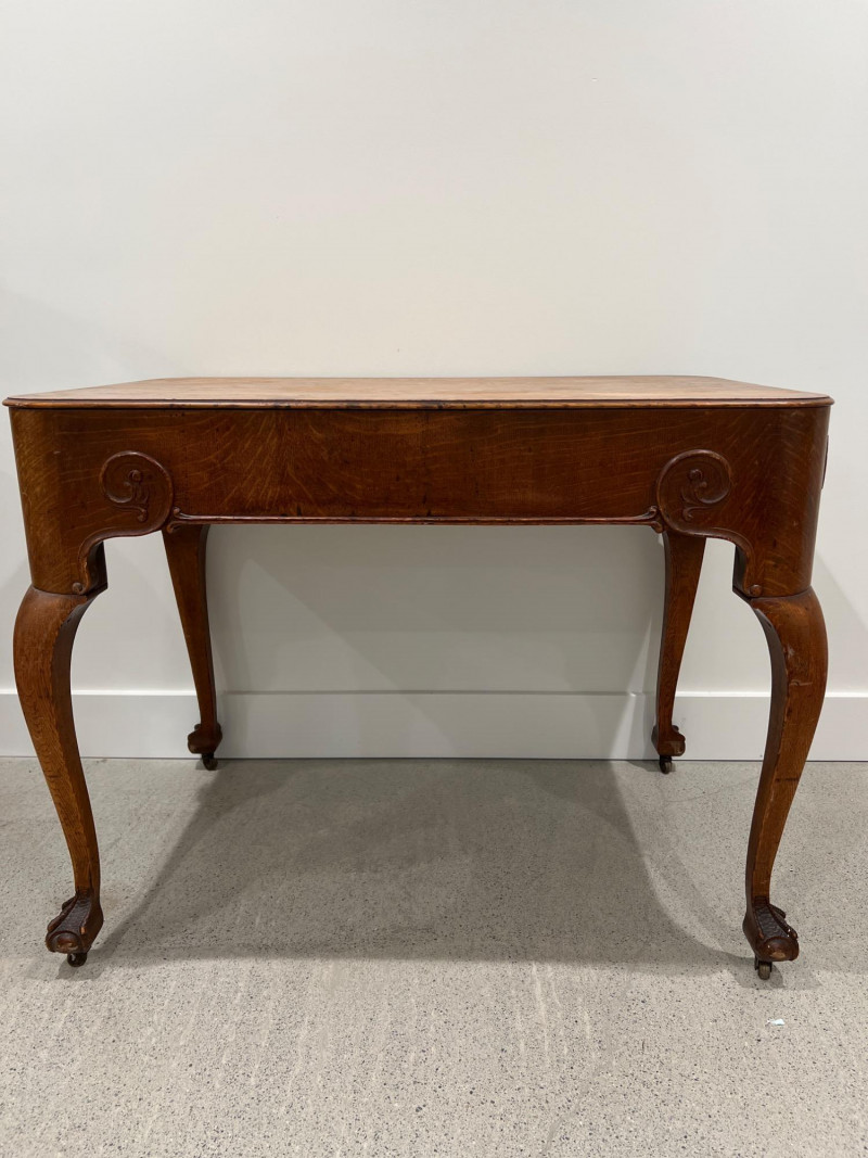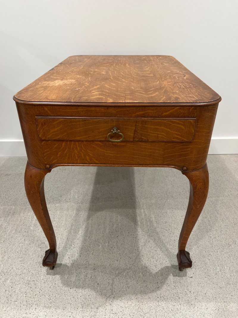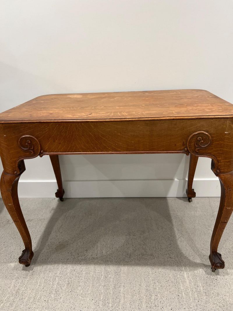 Solid oak game table with a single drawer and detailed carved legs ending in claw feet on casters. The wood shows attractive grain patterns and age-related wear. One functional drawer with ring pull. Solid oak wood Two drawers on each end, claw feet, casters Surface wear consistent with age as well as a few wood rings on top; see photos Due to Size: This Item Is Not Eligible for Shipping. Available for Local Pickup Only.