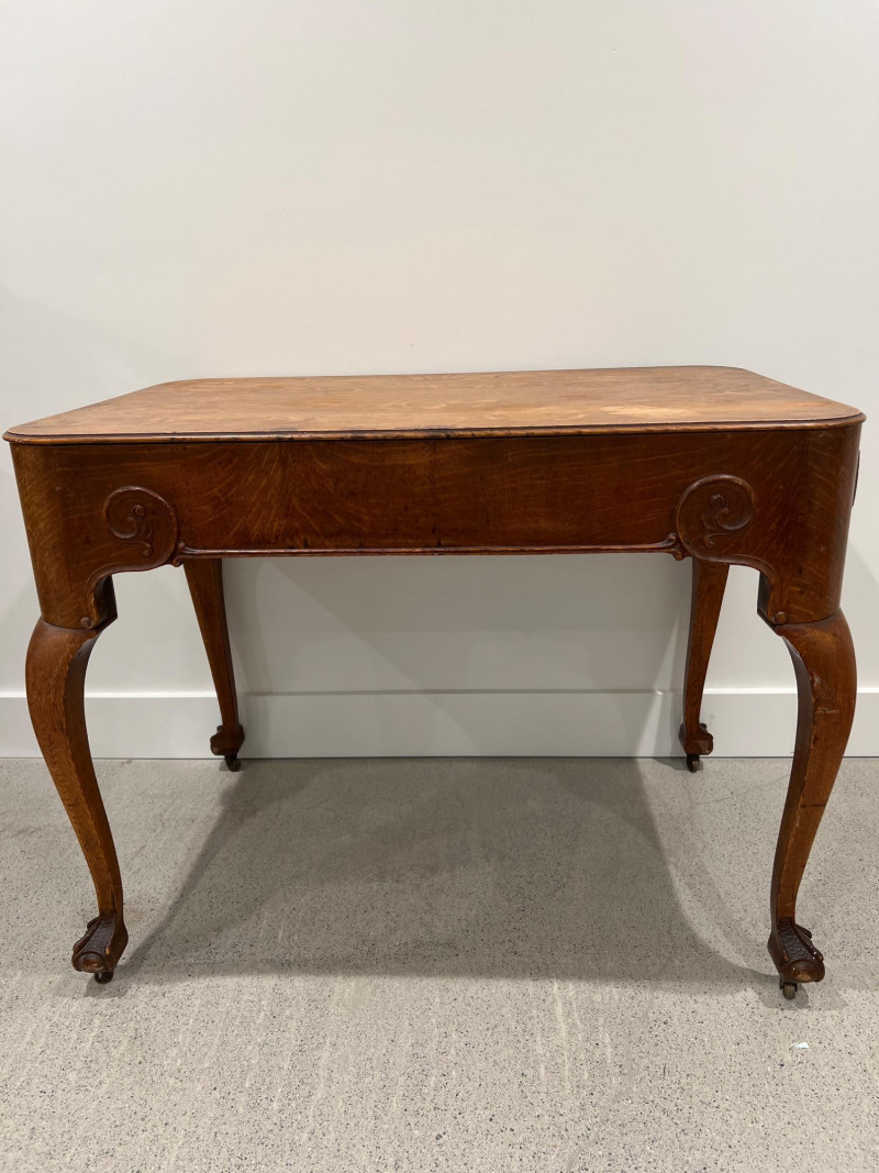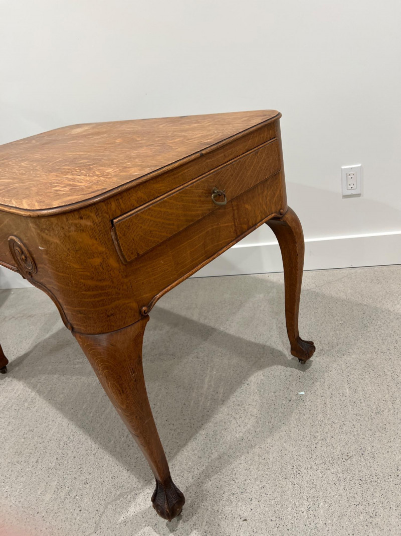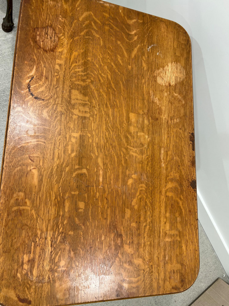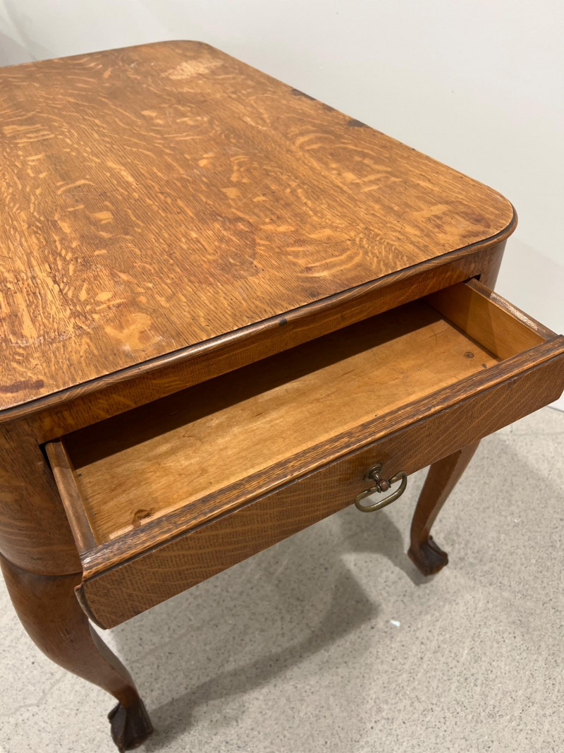 Solid oak game table with a single drawer and detailed carved legs ending in claw feet on casters. The wood shows attractive grain patterns and age-related wear. One functional drawer with ring pull. Solid oak wood Two drawers on each end, claw feet, casters Surface wear consistent with age as well as a few wood rings on top; see photos Due to Size: This Item Is Not Eligible for Shipping. Available for Local Pickup Only.