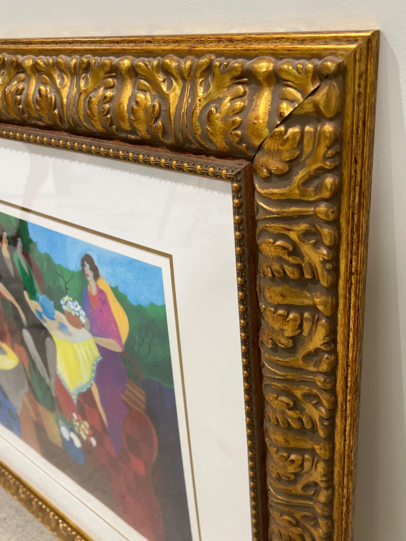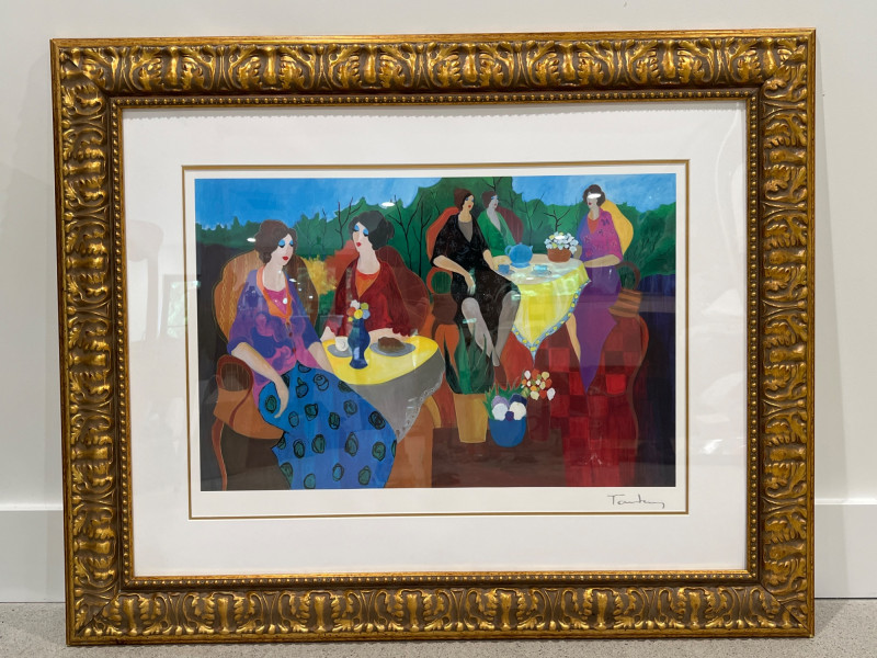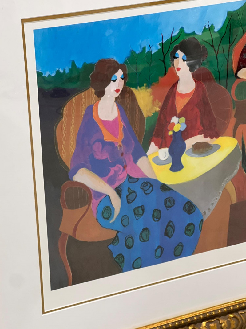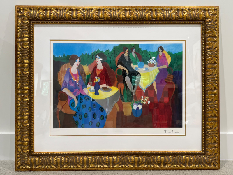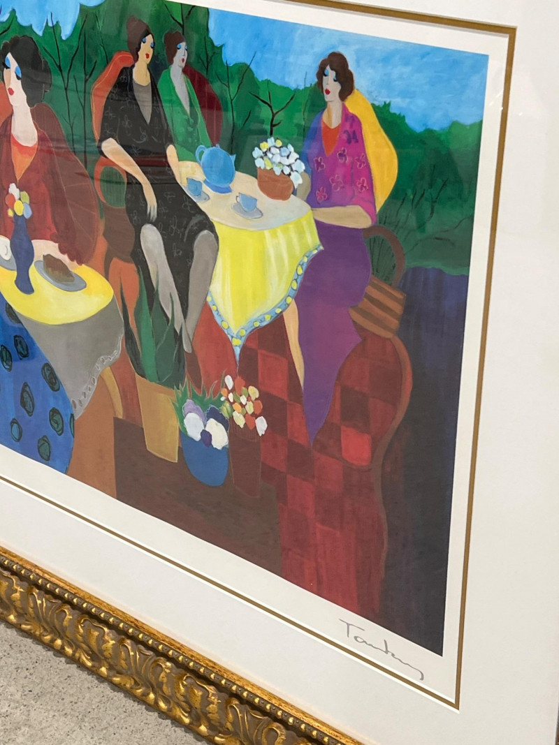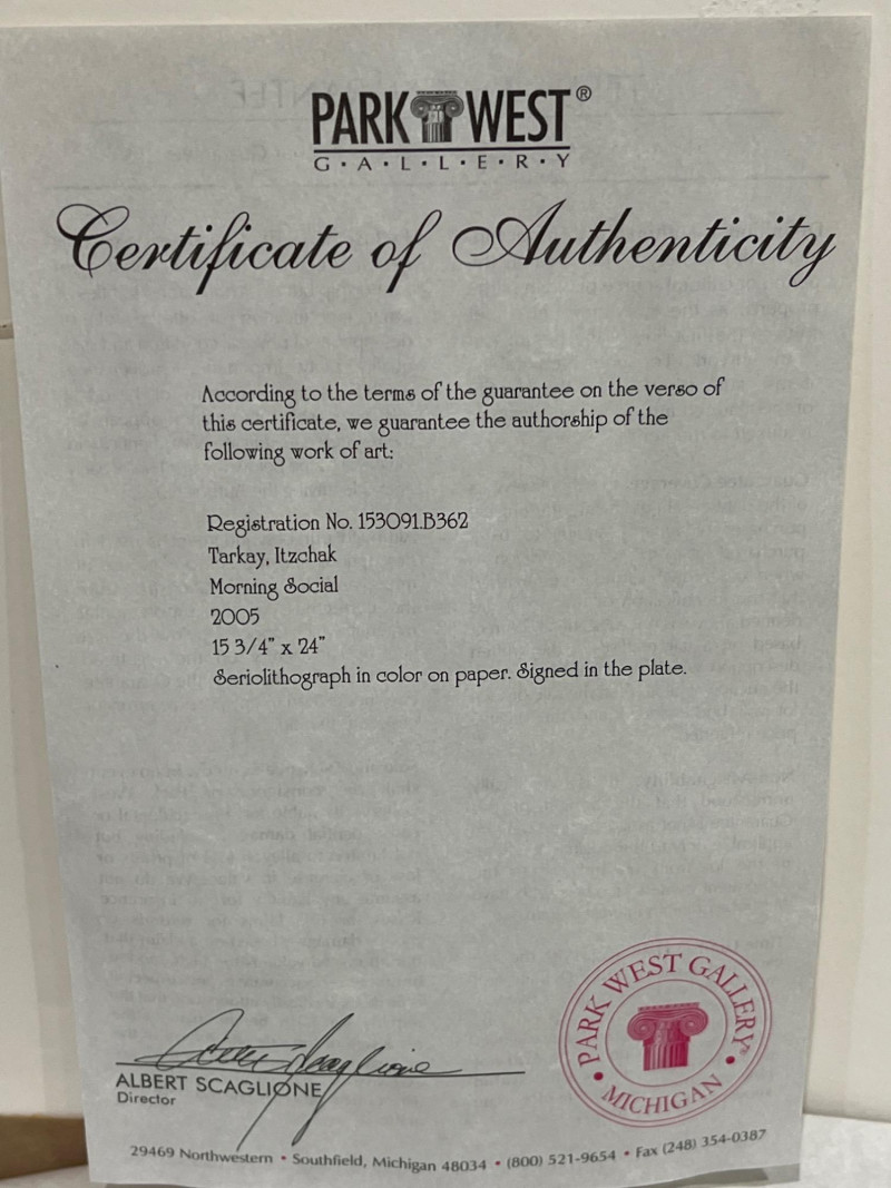 Artist: Itzchak Tarkay Title: Morning Social Medium: Seriolithograph on paper Frame: Ornate gold-tone frame with matting Includes COA from Park West Gallery Artist Biography: Itzchak Tarkay (1935-2012) Itzchak Tarkay was an Israeli artist known for his colorful, Post-Impressionist-style works, often featuring women in relaxed, social settings. Influenced by French Impressionism, his art combines bold color, fluid lines, and peaceful composition, earning him international acclaim. Due to Size/Fragility: This Item Is Not Eligible for Shipping. Available for Local Pickup Only.