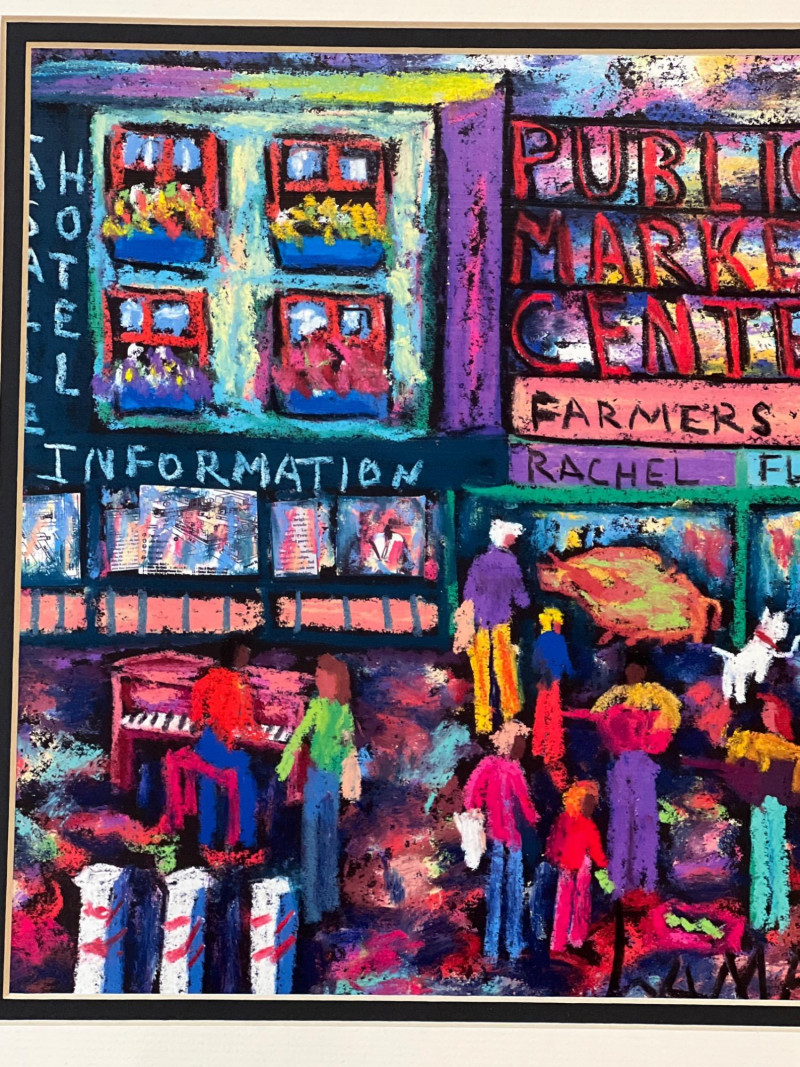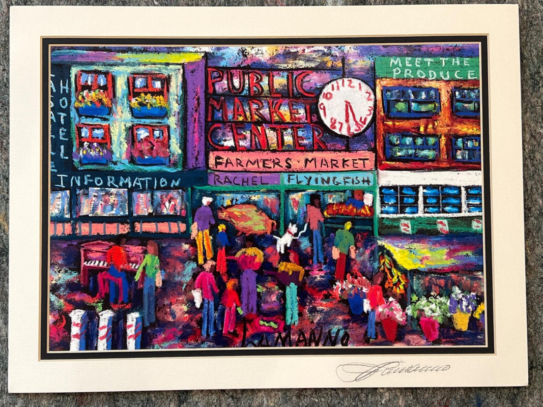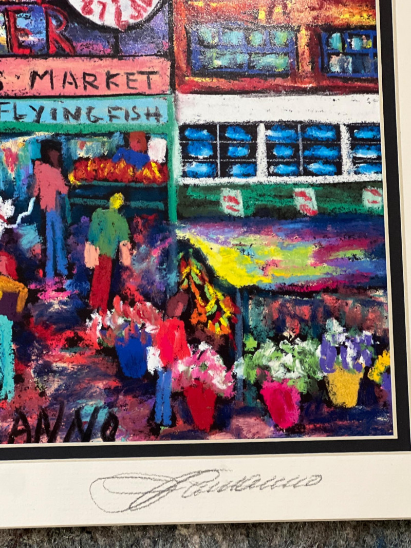 Vibrant and full of local character, this signed print by Seattle-based artist Joseph A. Lamanno captures the bustling energy of Pike Place Market in his signature pastel-inspired palette. Depicting busy market stalls, iconic signage, and everyday scenes of the city’s beloved landmark, the piece reflects Lamanno’s decades-long presence in the Pacific Northwest art scene.