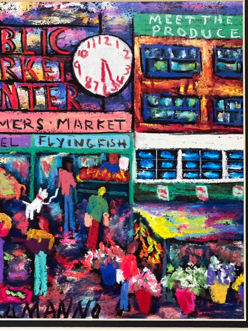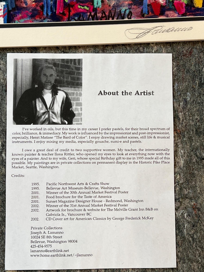 Lamanno began exhibiting at Pike Place in the late 1970s, with work appearing in posters, brochures, and private collections. This piece is a striking example of his lifelong connection to Seattle’s cultural heart.