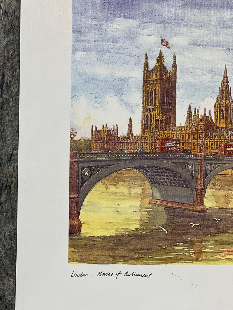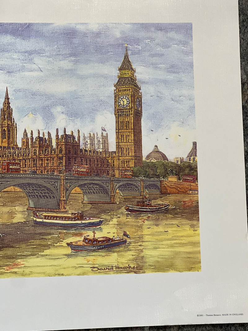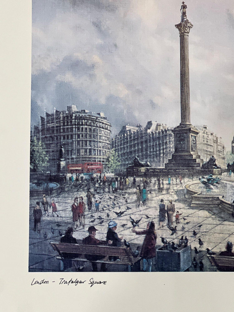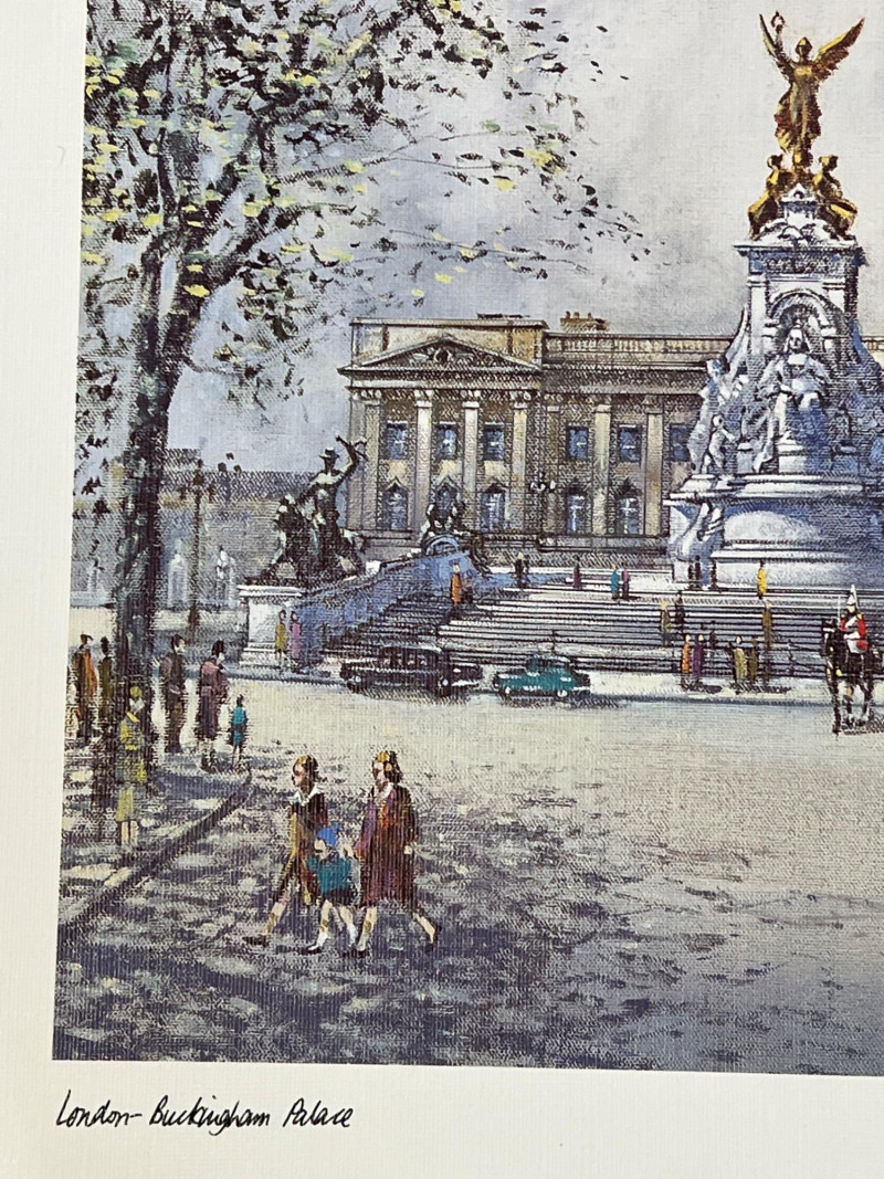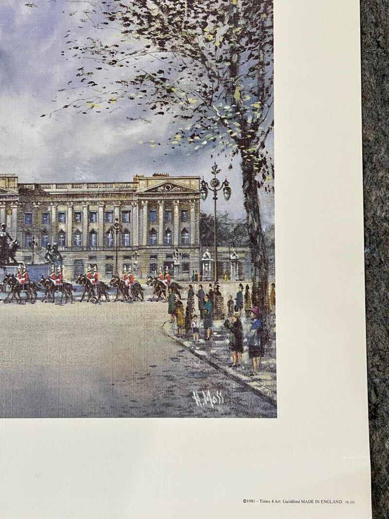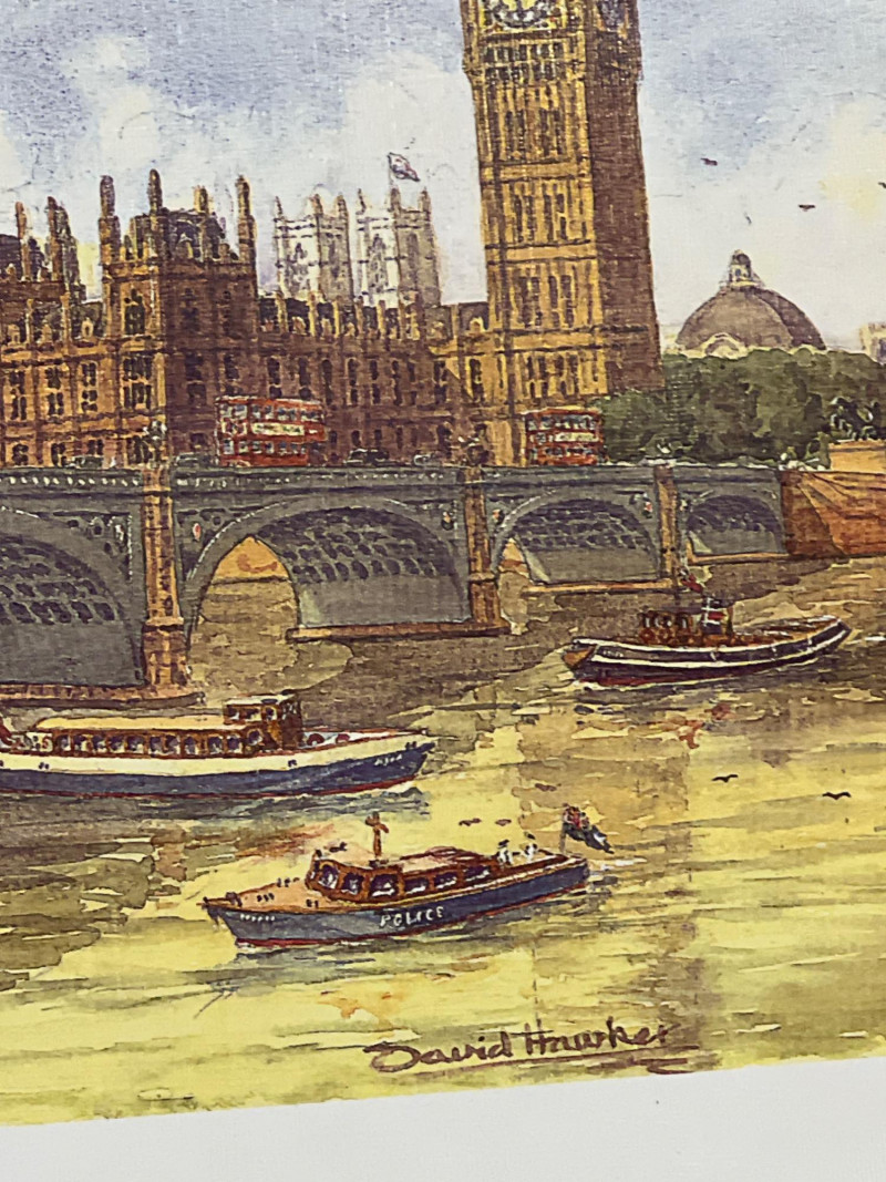 Set of three professionally printed (on quality art paper) London scene artworks featuring iconic landmarks. Includes works by David Hawker and H. Moss. Houses of Parliament with Westminster Bridge (signed: David Hawker) Trafalgar Square with Nelson’s Column (signed: H. Moss) Buckingham Palace with the Victoria Memorial (signed: H. Moss)