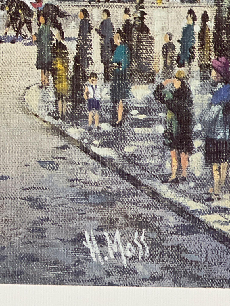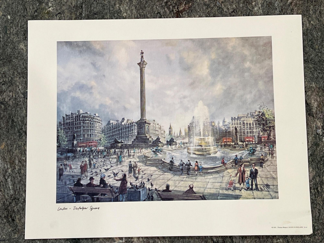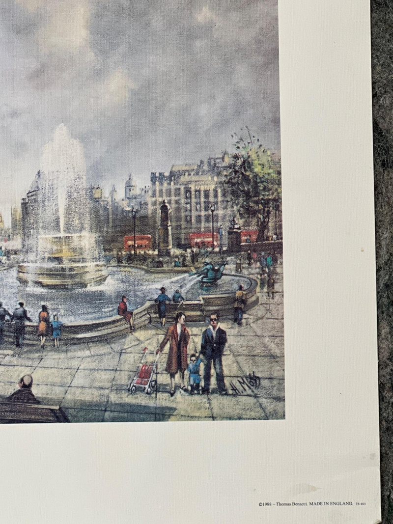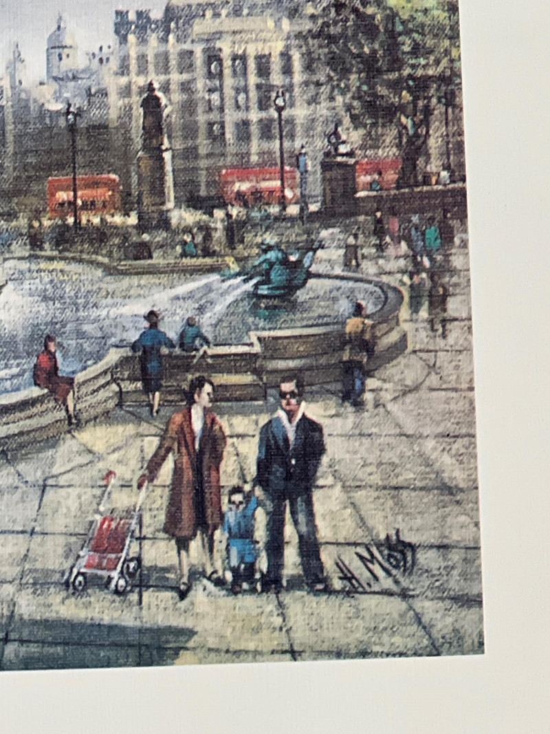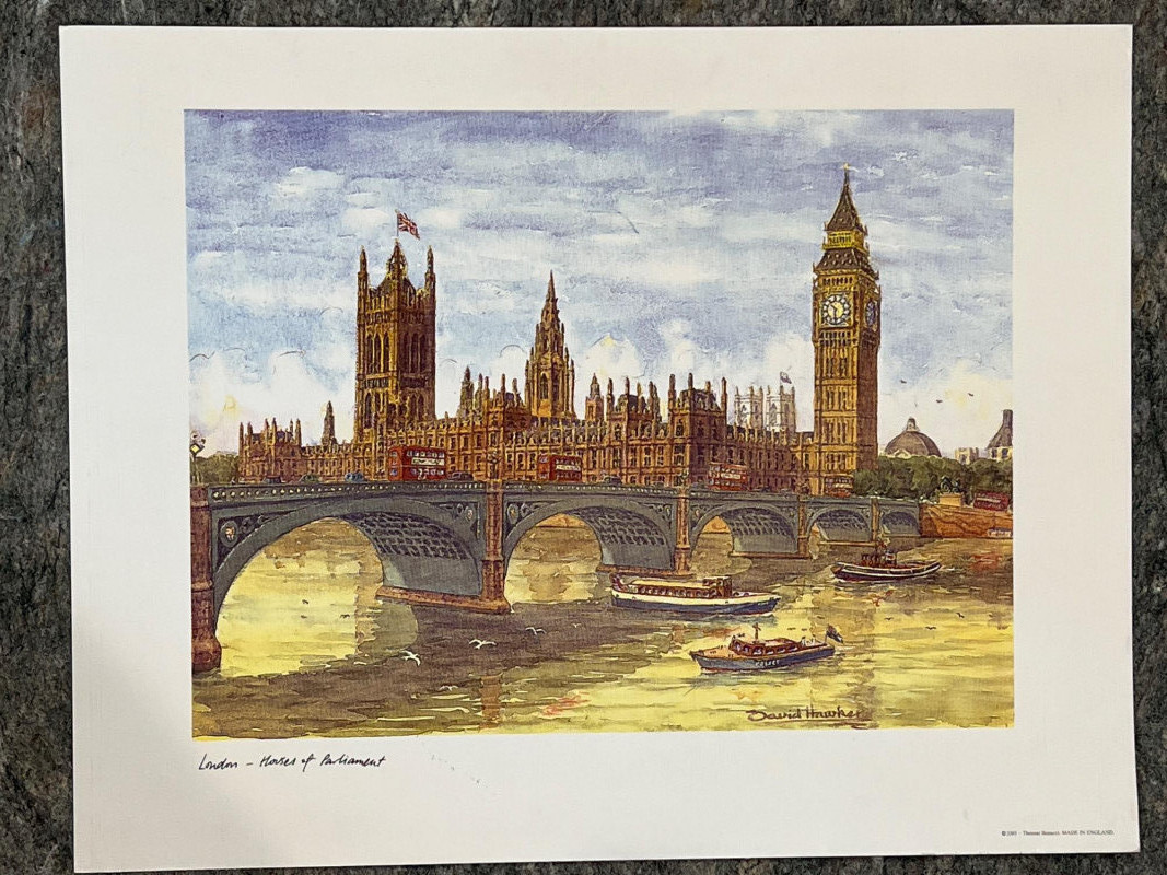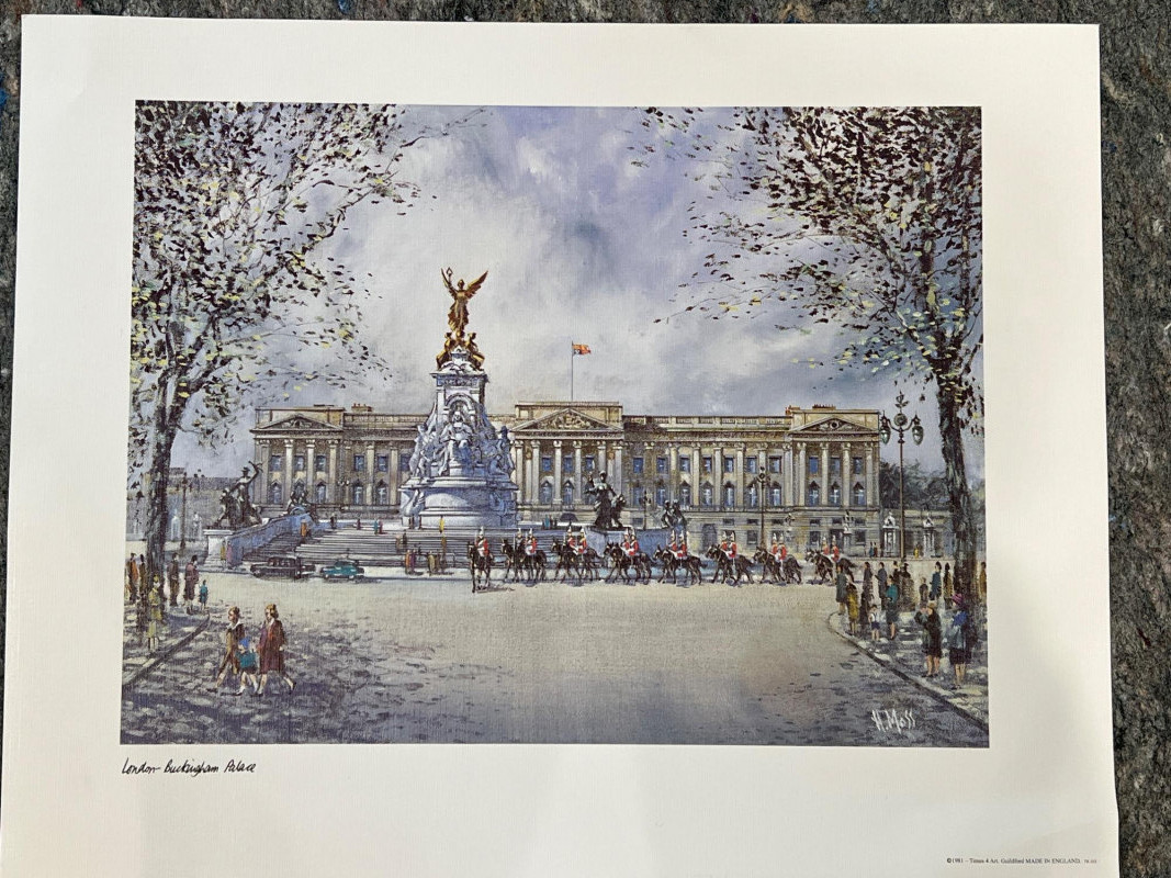 Set of three professionally printed (on quality art paper) London scene artworks featuring iconic landmarks. Includes works by David Hawker and H. Moss. Houses of Parliament with Westminster Bridge (signed: David Hawker) Trafalgar Square with Nelson’s Column (signed: H. Moss) Buckingham Palace with the Victoria Memorial (signed: H. Moss)