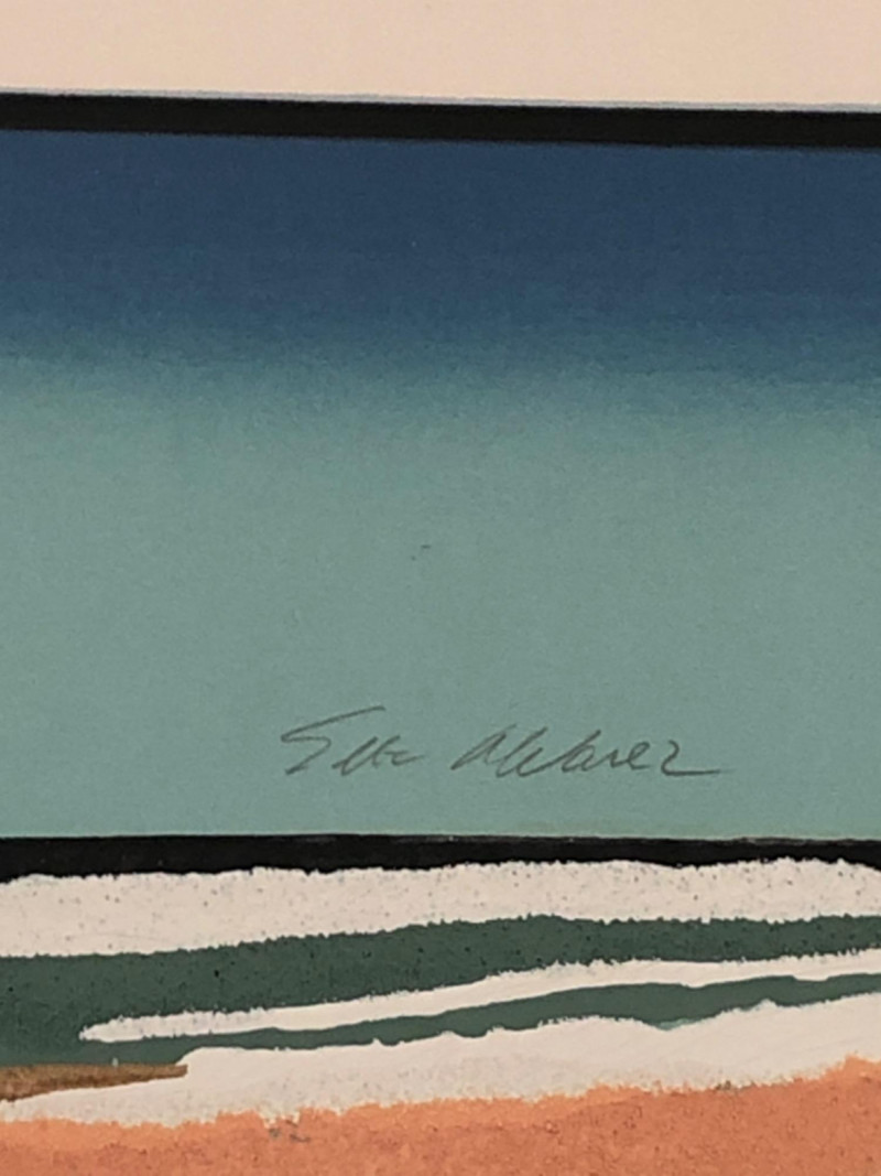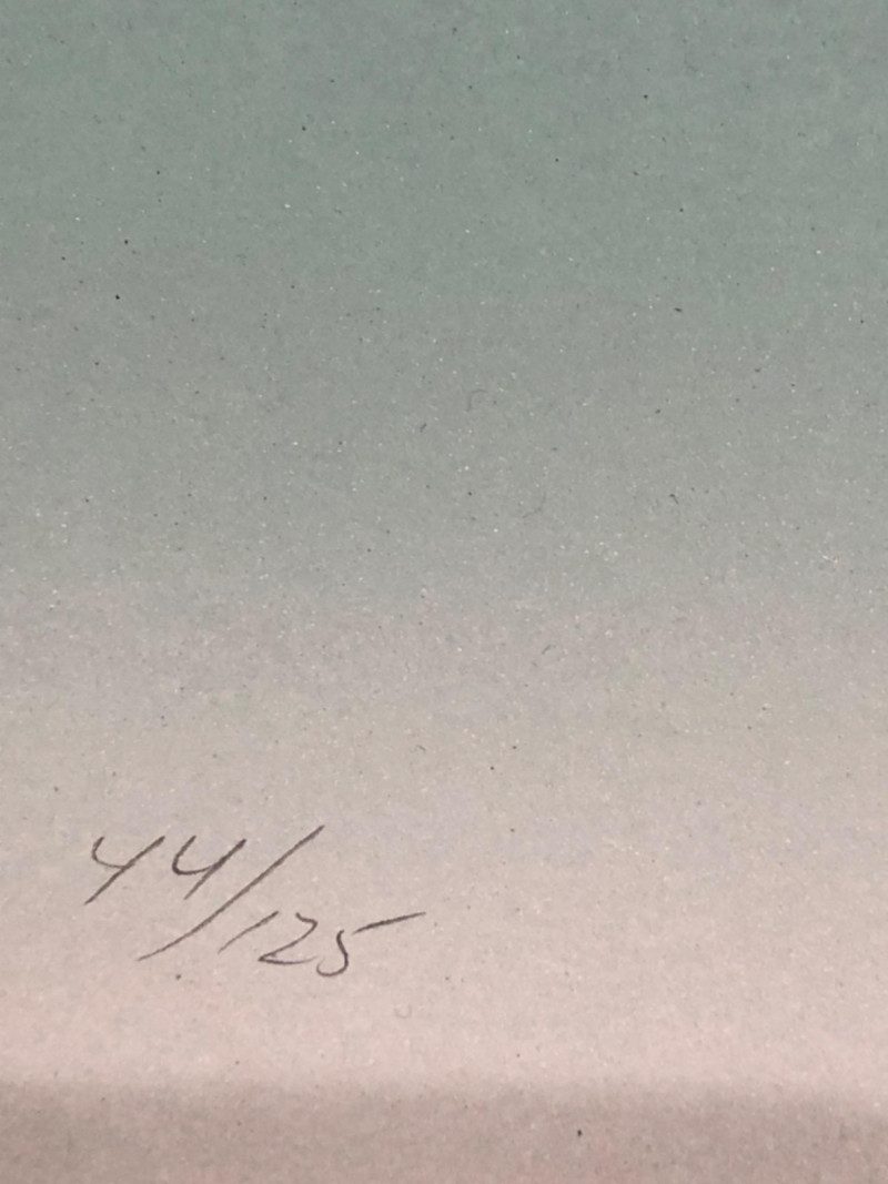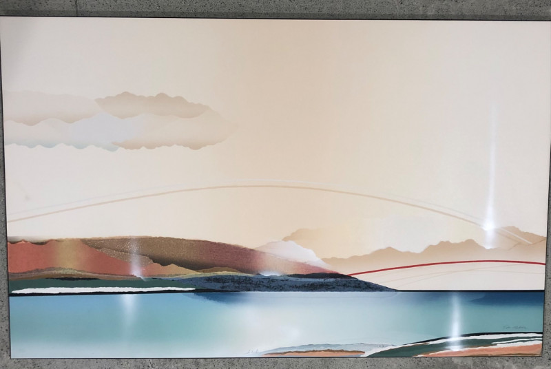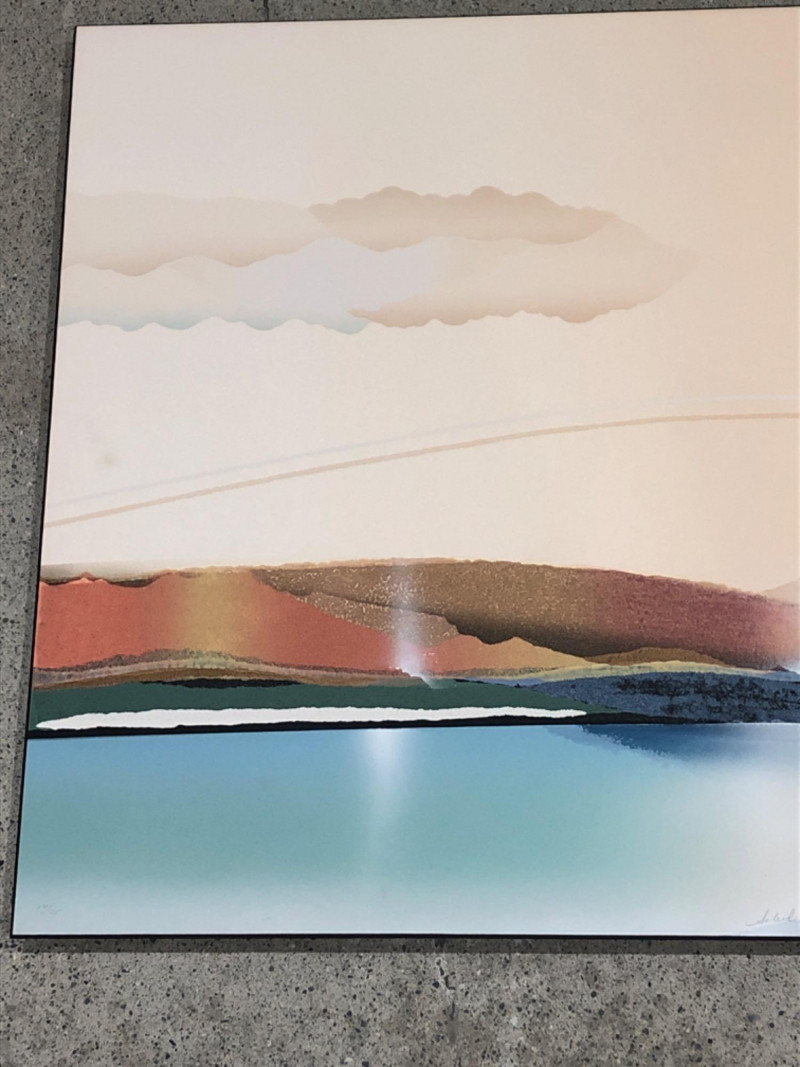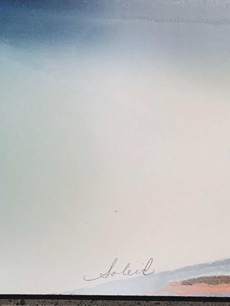 A masterclass in stylized abstraction and tonal harmony, Soleil by Elba Alvarez is a limited edition chromolithograph numbered 44 out of 125 and hand-signed in pencil by the artist. Measuring an impressive 4 feet wide by 2.75 feet high, this evocative composition fuses serene color gradients with architectural curves to create a meditative landscape grounded in both realism and abstraction. Executed in gentle layers of peach, teal, sage, and sun-washed earth tones, Soleil evokes the sensation of early light rising over mirrored water and undulating hills. Alvarez’s refined palette and soft-edged forms invite emotional introspection and spatial stillness—a signature characteristic of her landscape-inspired works. The composition combines lyrical horizon lines with misty cloud textures and negative space to craft a visual rhythm both grounded and ephemeral. The title, Soleil (French for “sun”), is especially apt given the ambient luminosity suffused across the scene, suggesting warmth, passage, and tranquil reflection. Artist: Elba Alvarez Title: Soleil Medium: Chromolithograph on fine art paper Edition: Hand-signed and numbered 44/125 Artist Notes: Elba Alvarez was born in Pedernales, Venezuela in 1944, making her a South American artist by origin. She later moved to Paris to study art and eventually settled in New York in 1968, where she developed her signature abstract style. Her work blends Latin American color sensibilities with European modernist influences, and she gained international recognition through exhibitions across five continents. Due to Size/Fragility: This Item Is Not Eligible for Shipping. Available for Local Pickup Only.
