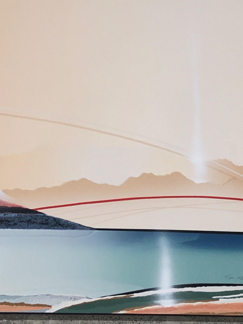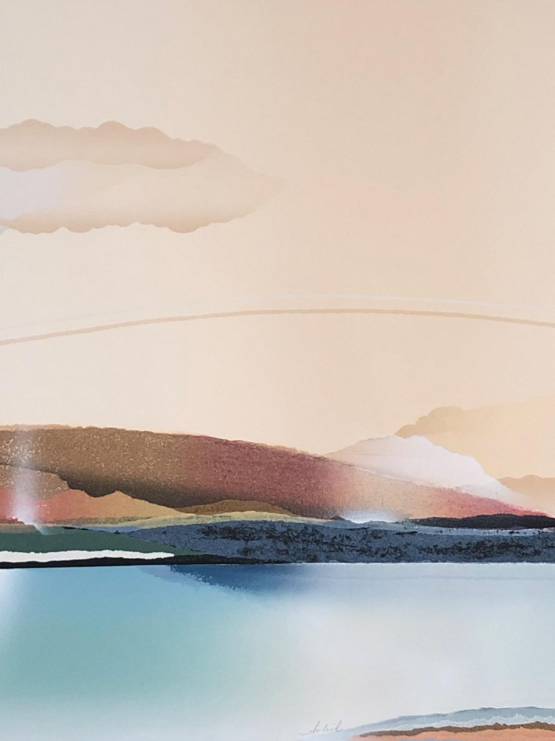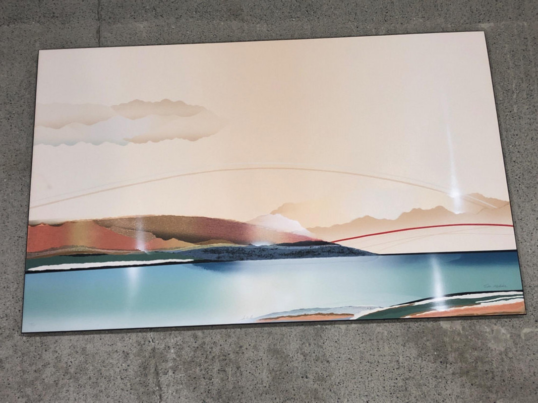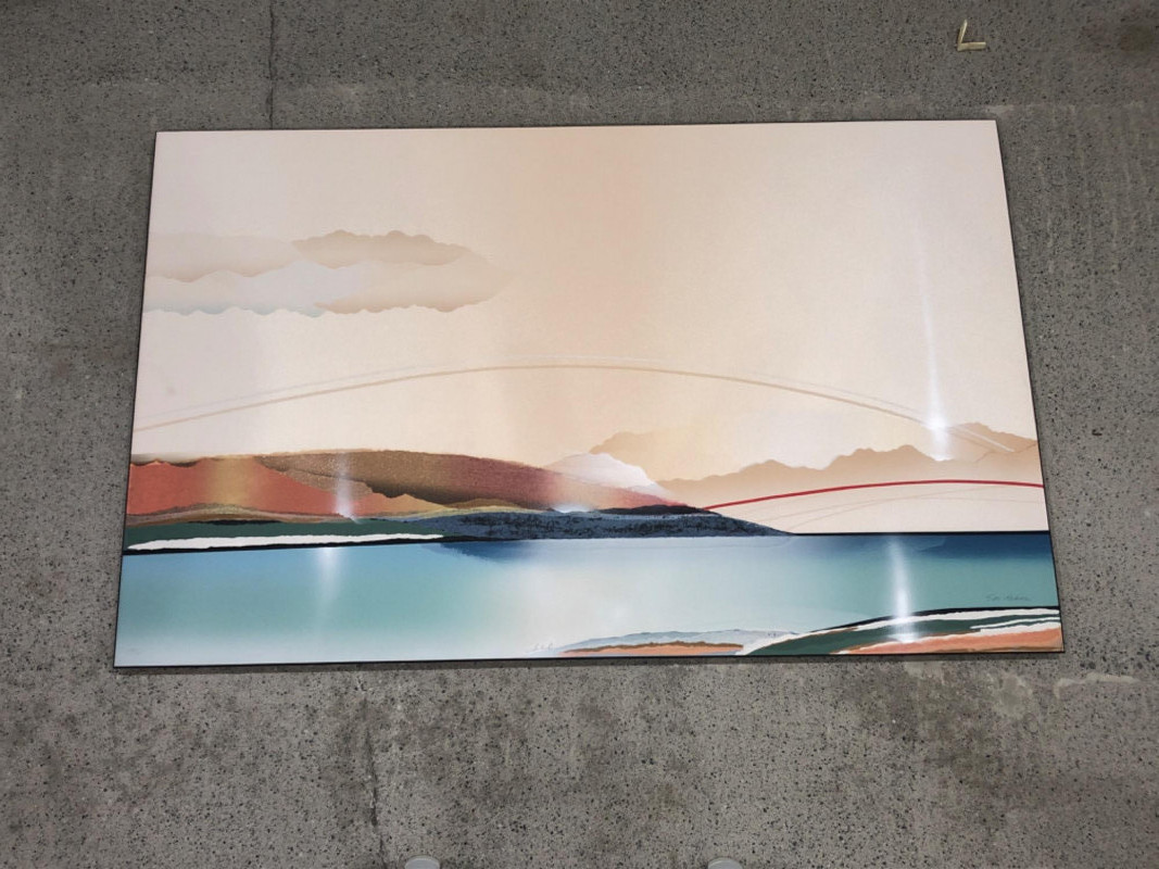 A masterclass in stylized abstraction and tonal harmony, Soleil by Elba Alvarez is a limited edition chromolithograph numbered 44 out of 125 and hand-signed in pencil by the artist. Measuring an impressive 4 feet wide by 2.75 feet high, this evocative composition fuses serene color gradients with architectural curves to create a meditative landscape grounded in both realism and abstraction. Executed in gentle layers of peach, teal, sage, and sun-washed earth tones, Soleil evokes the sensation of early light rising over mirrored water and undulating hills. Alvarez’s refined palette and soft-edged forms invite emotional introspection and spatial stillness—a signature characteristic of her landscape-inspired works. The composition combines lyrical horizon lines with misty cloud textures and negative space to craft a visual rhythm both grounded and ephemeral. The title, Soleil (French for “sun”), is especially apt given the ambient luminosity suffused across the scene, suggesting warmth, passage, and tranquil reflection. Artist: Elba Alvarez Title: Soleil Medium: Chromolithograph on fine art paper Edition: Hand-signed and numbered 44/125 Artist Notes: Elba Alvarez was born in Pedernales, Venezuela in 1944, making her a South American artist by origin. She later moved to Paris to study art and eventually settled in New York in 1968, where she developed her signature abstract style. Her work blends Latin American color sensibilities with European modernist influences, and she gained international recognition through exhibitions across five continents. Due to Size/Fragility: This Item Is Not Eligible for Shipping. Available for Local Pickup Only.