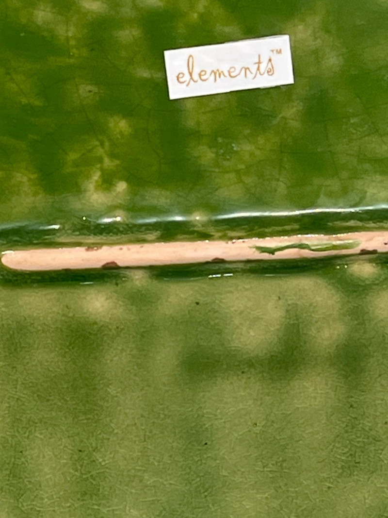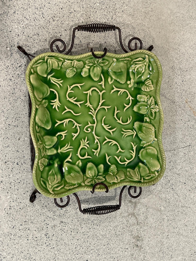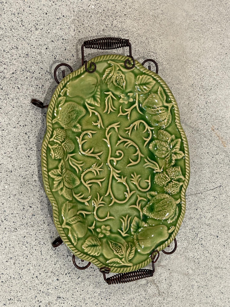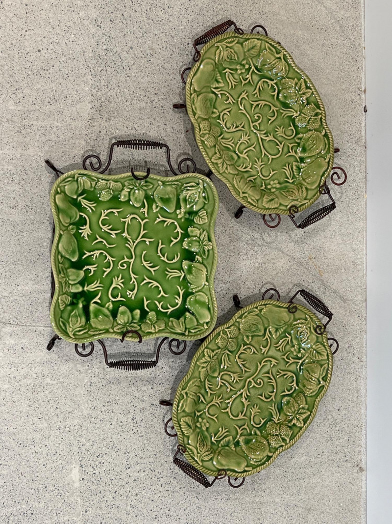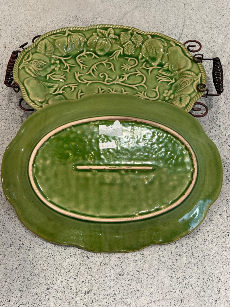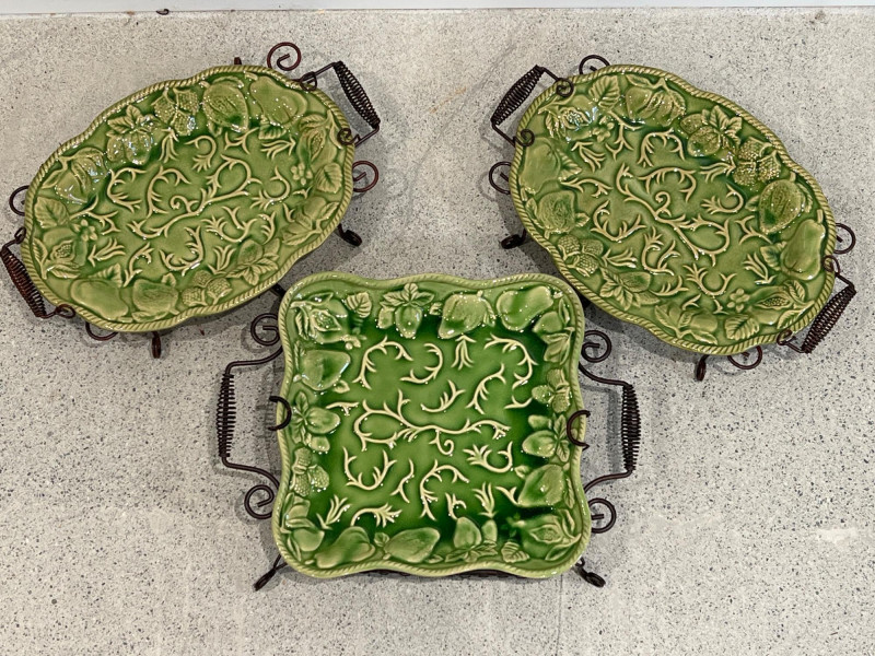 Three embossed green ceramic platters by Elements. Each features raised botanical and fruit motifs with wire stands in oil-rubbed bronze (ORB) finish. Glazed green ceramic (beginning to show signs of distress) with embossed fruit/leaf pattern & decorative scroll metal handles and stand frames. Marked "Elements" on back. 2 oval trays: approx. 14.5" x 10.5" 1 square tray: approx. 12" x 12"