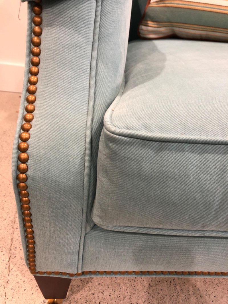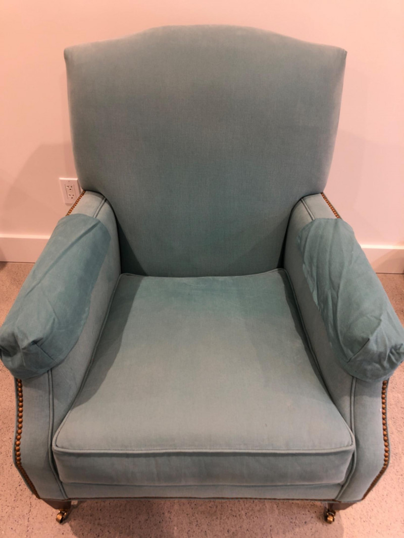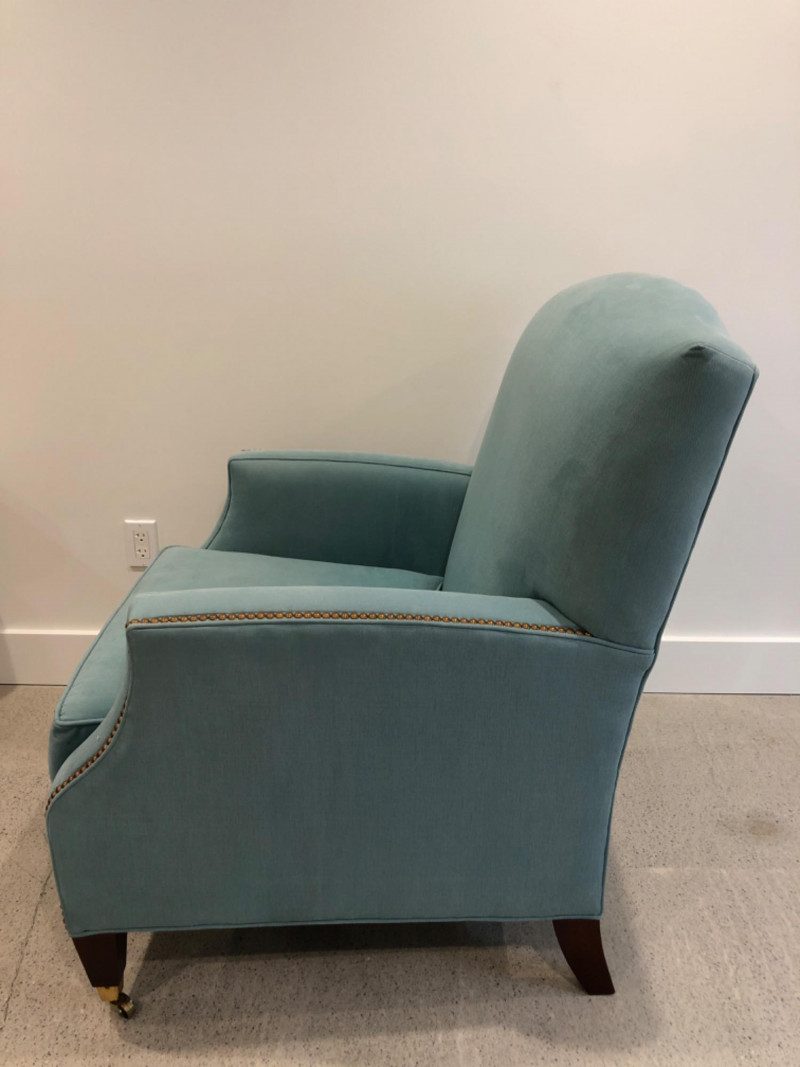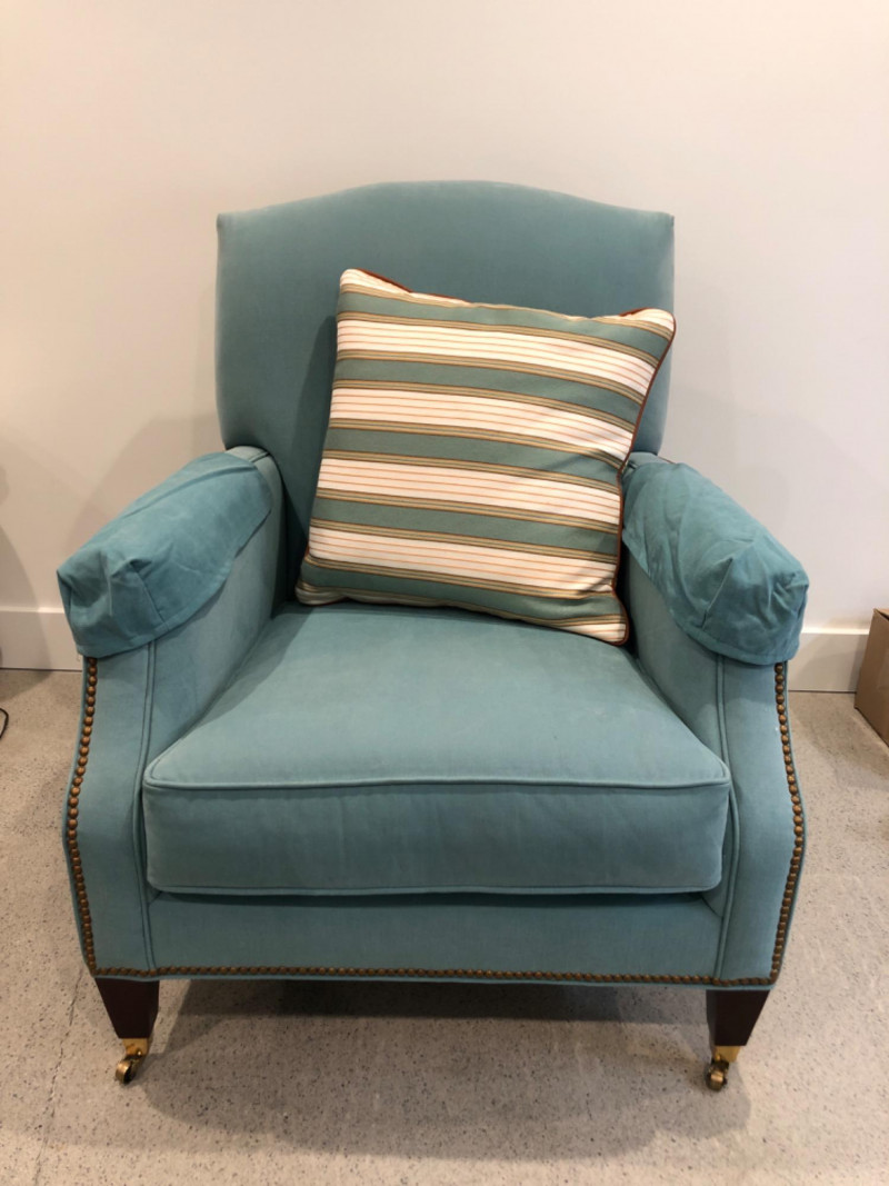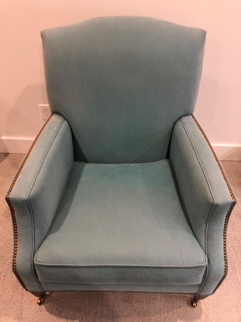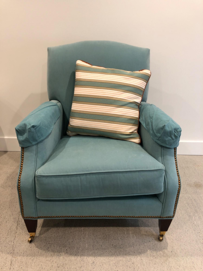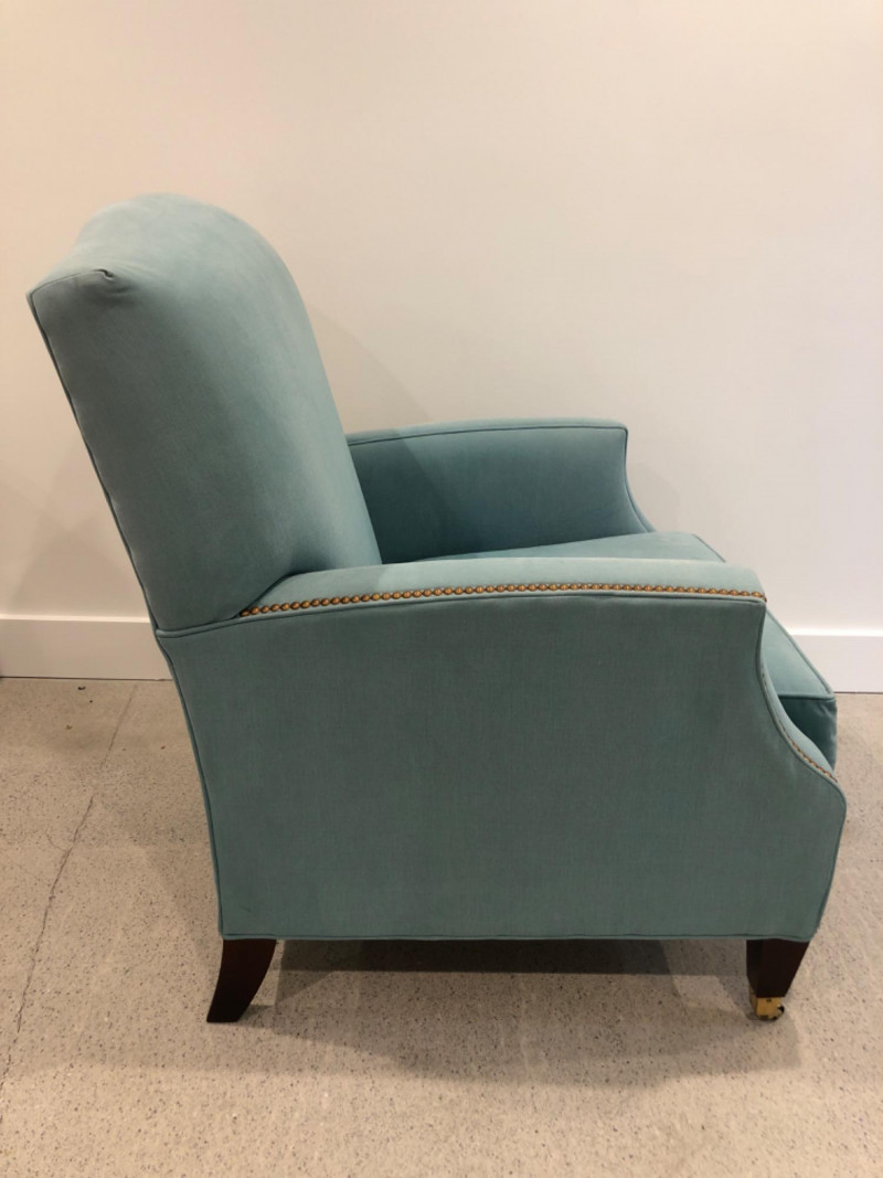 Baker Furniture Company, "The Milling Road Collection", upholstered armchair in a soft blue fabric with coordinating striped pillow. Features nailhead trim, wooden legs with front brass casters, and removable arm covers. Original labels intact. Maker: Baker Furniture Company Collection: Milling Road Color: Light blue Includes: Striped accent pillow, armrest covers Due to Size: This Item Is Not Eligible for Shipping. Available for Local Pickup Only.