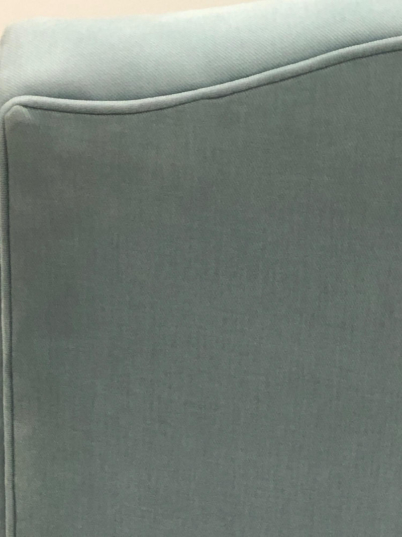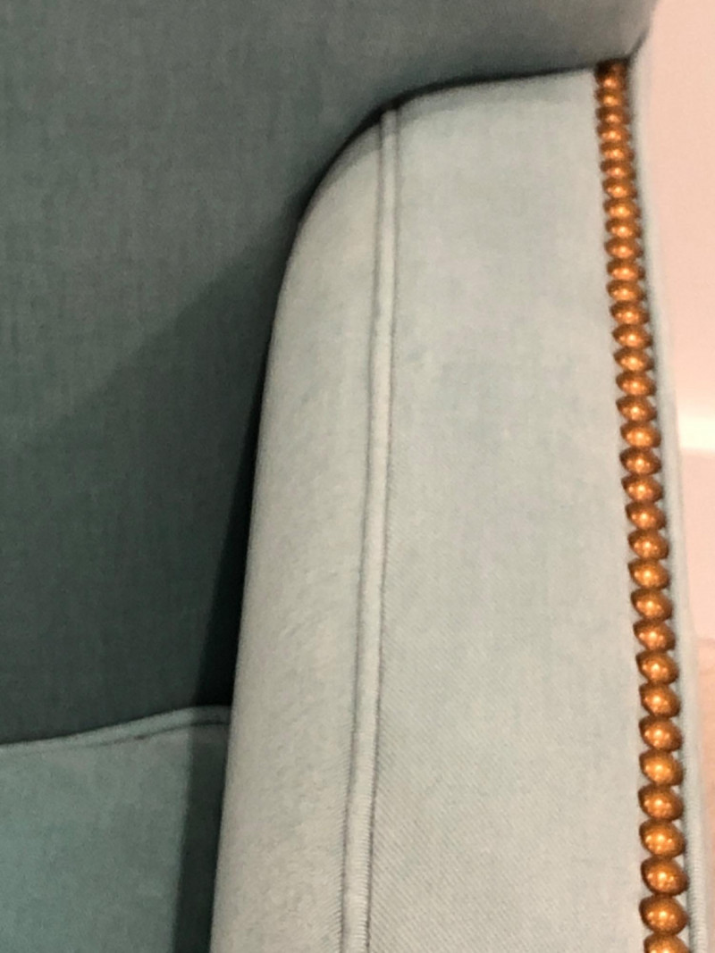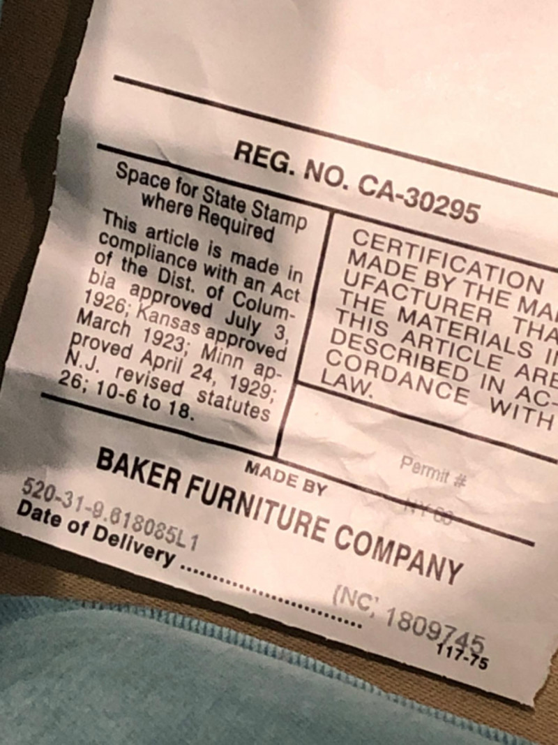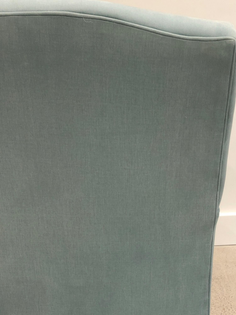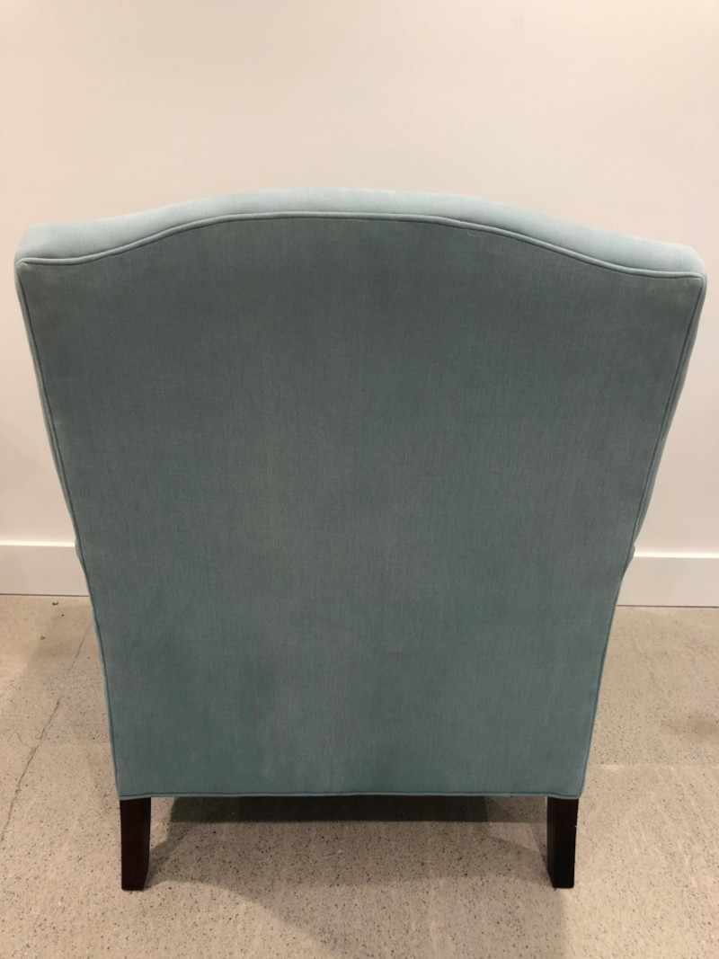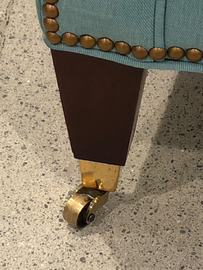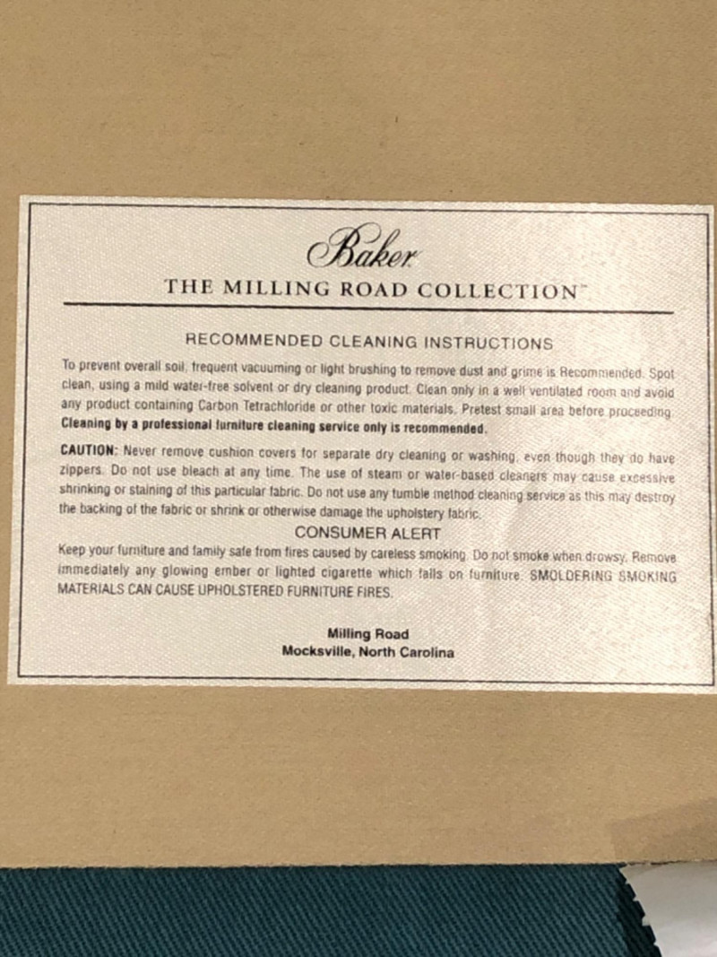 Baker Furniture Company, "The Milling Road Collection", upholstered armchair in a soft blue fabric with coordinating striped pillow. Features nailhead trim, wooden legs with front brass casters, and removable arm covers. Original labels intact. Maker: Baker Furniture Company Collection: Milling Road Color: Light blue Includes: Striped accent pillow, armrest covers Due to Size: This Item Is Not Eligible for Shipping. Available for Local Pickup Only.