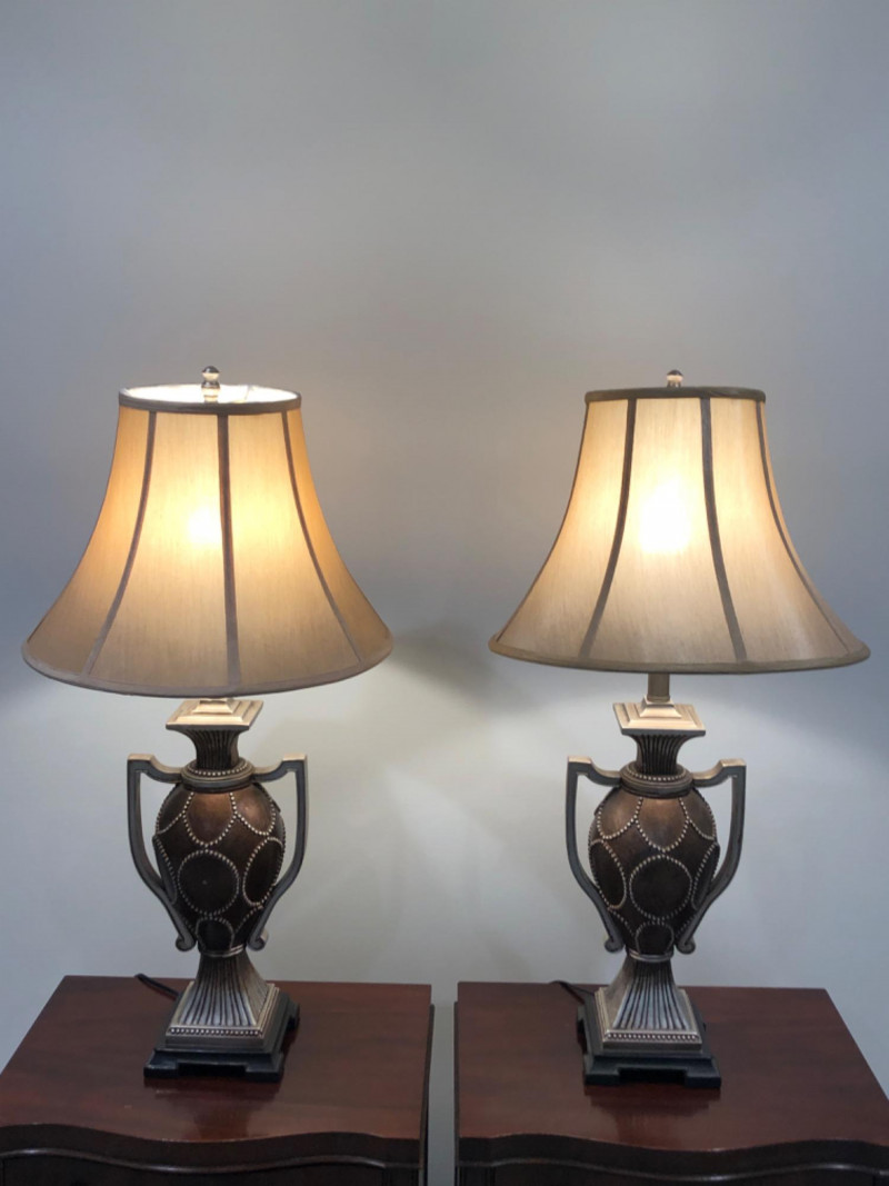 Matching pair of early 2000s table lamps with sculptural urn-style bases, styled after neoclassical Greco-Roman forms. Each lamp features a metallic bronze and silver finish with a ribbed square pedestal, faux beaded accents, and a classical profile. Standard bulb sockets; both tested and working. Includes traditional shades.