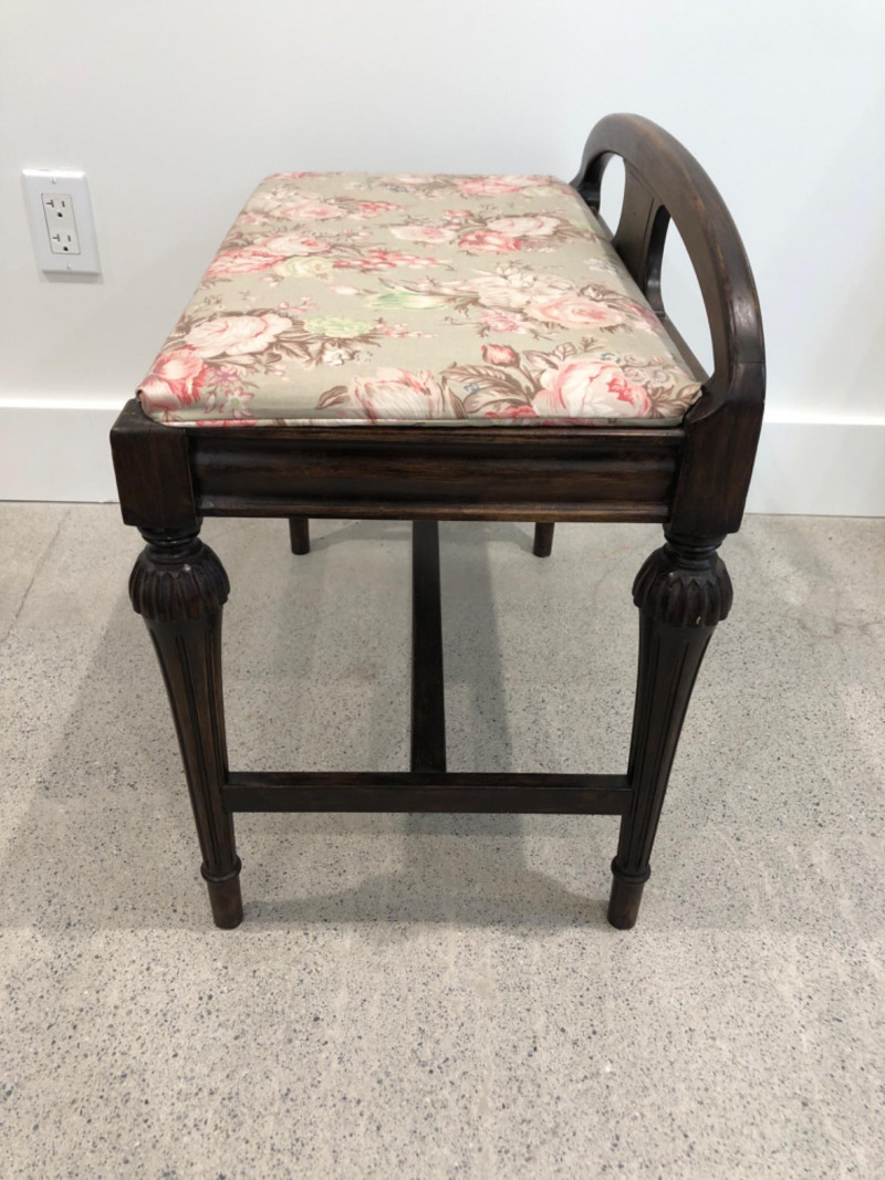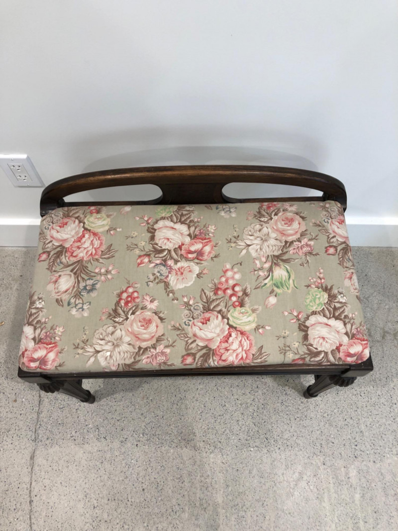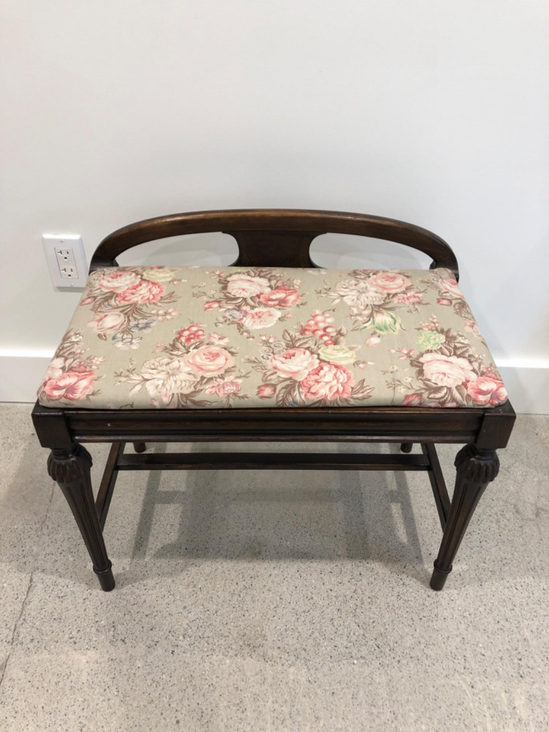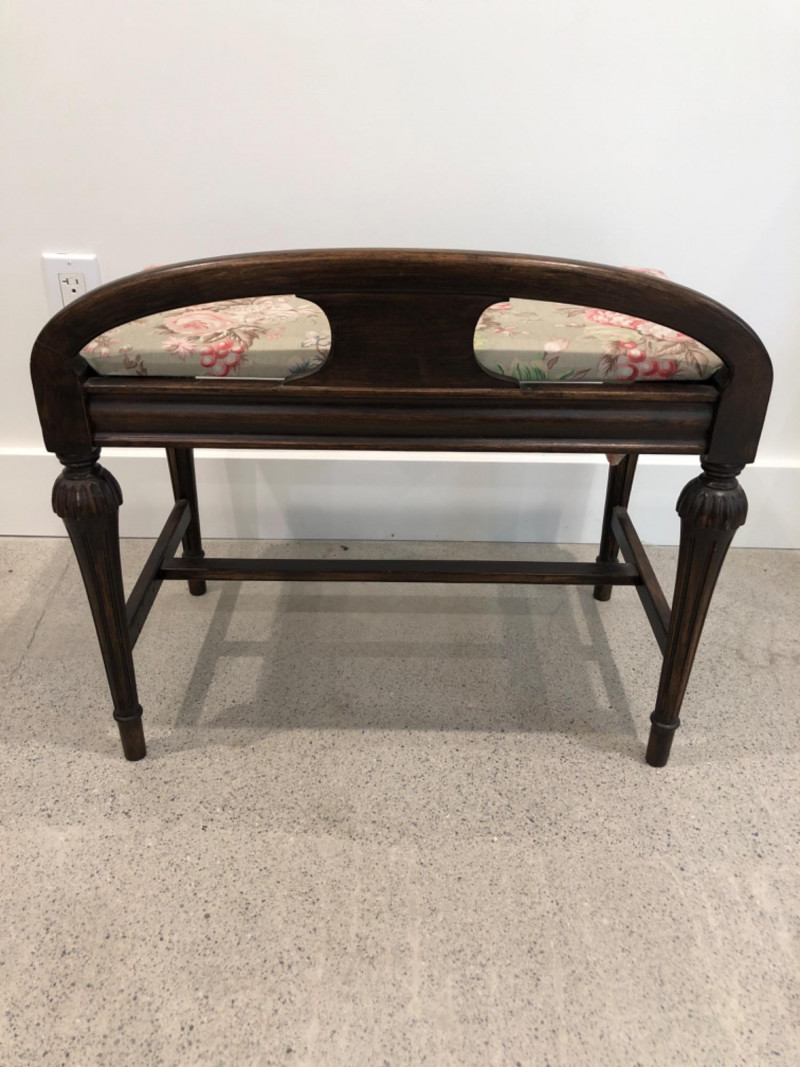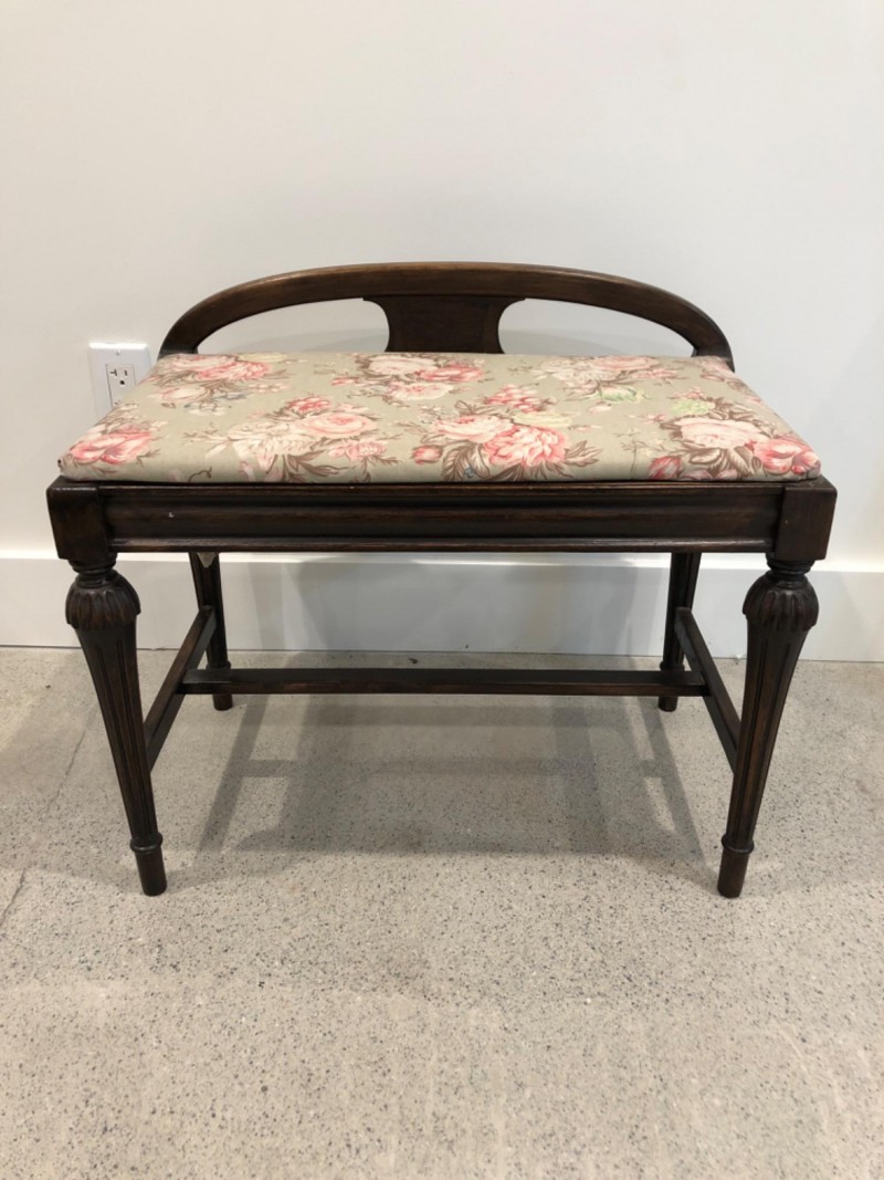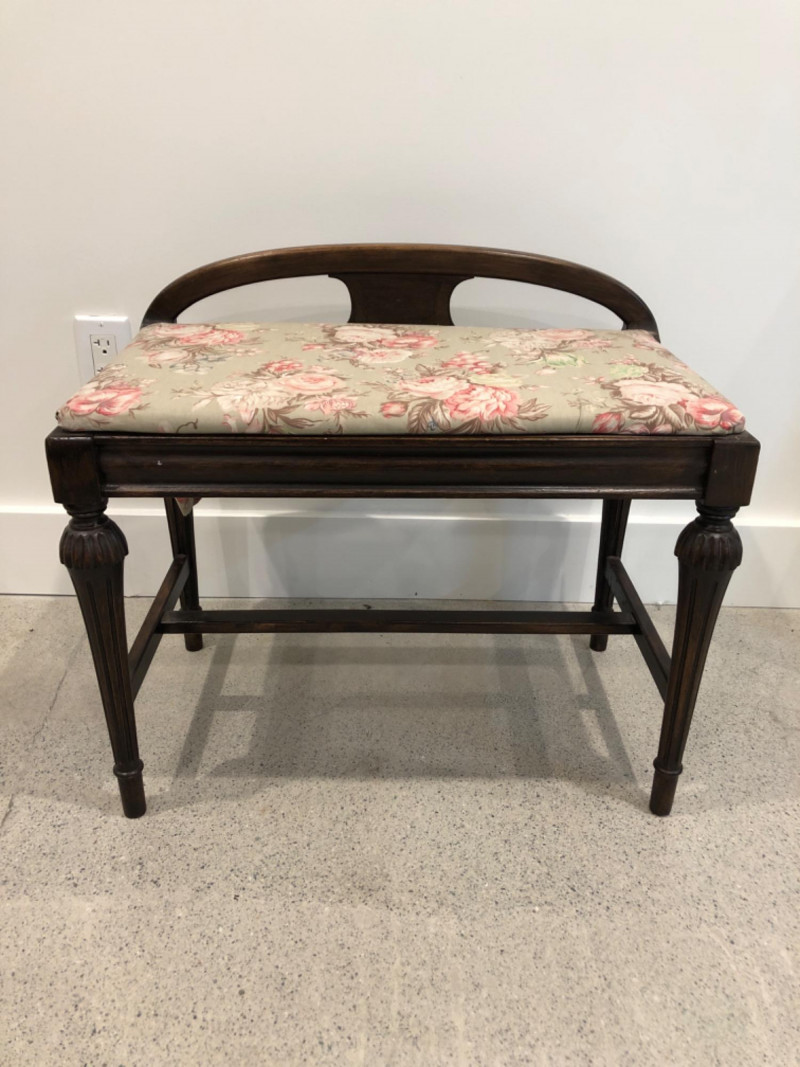Vintage vanity bench featuring a dark wood frame with carved fluted legs and a curved open-back design. The seat is upholstered in a floral fabric with soft rose and green tones. Compact size works well for vanity use, entryways, or as an accent piece. Solid wood frame with warm finish. Due to Size: This Item Is Not Eligible for Shipping. Available for Local Pickup Only.