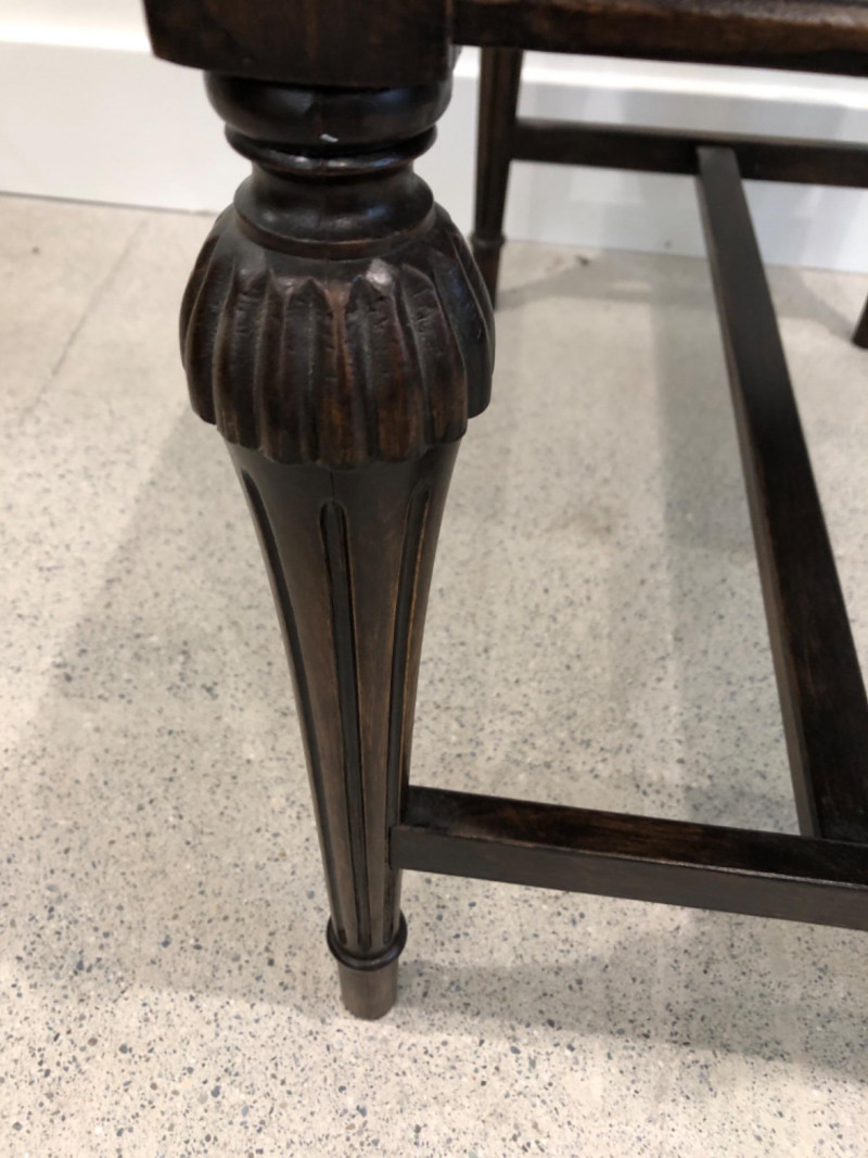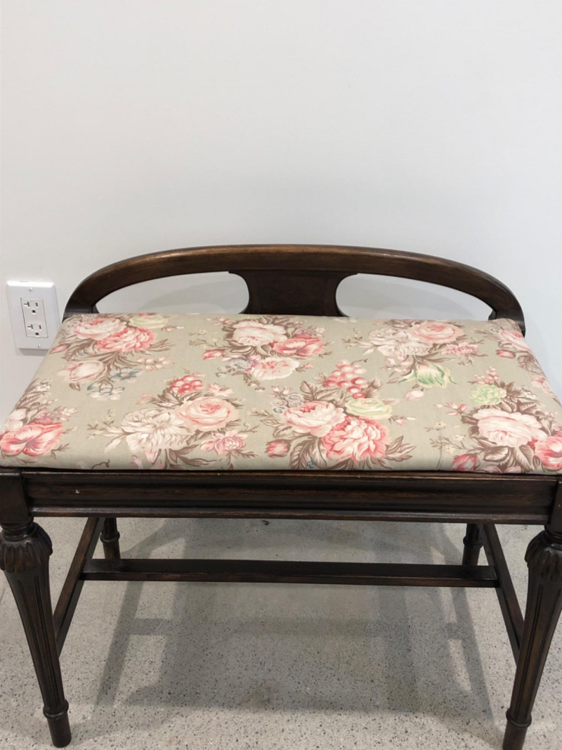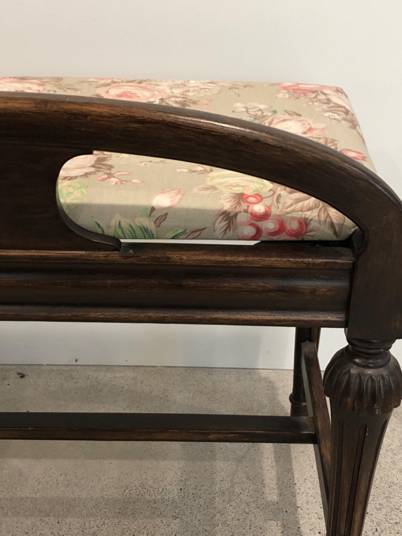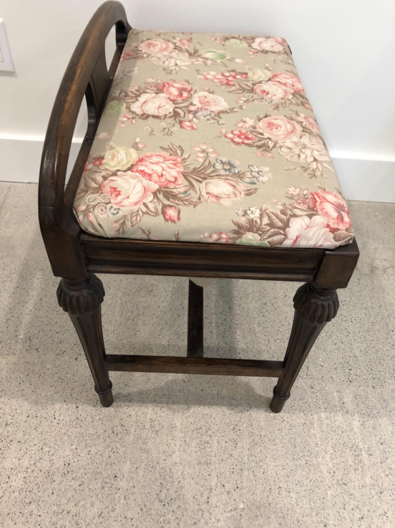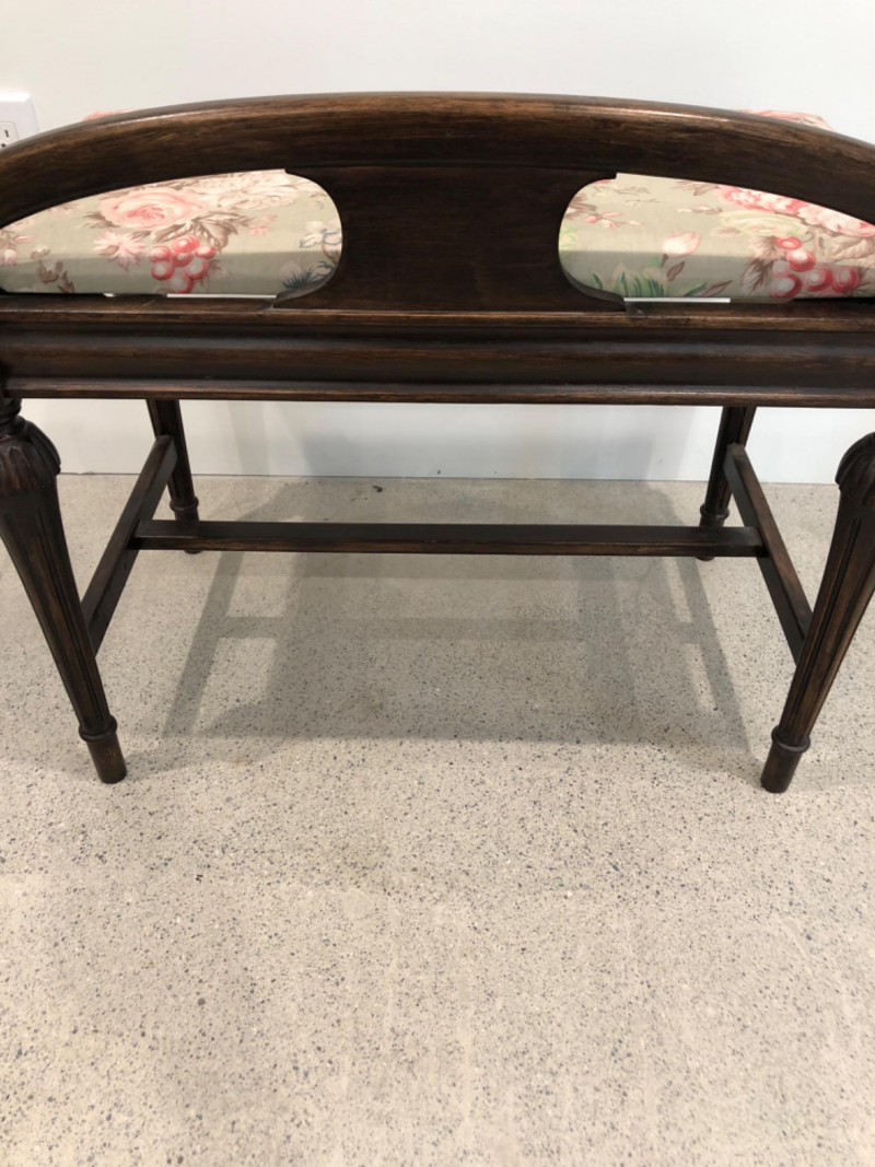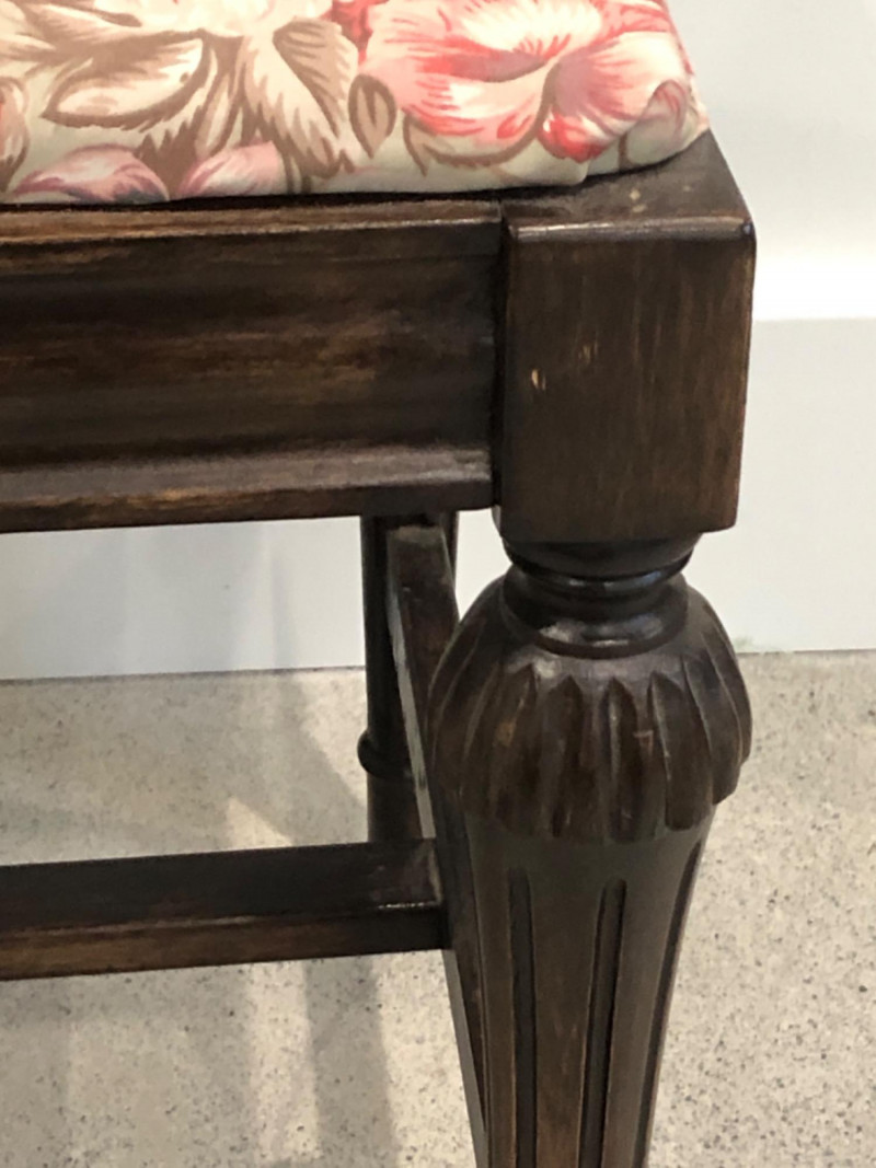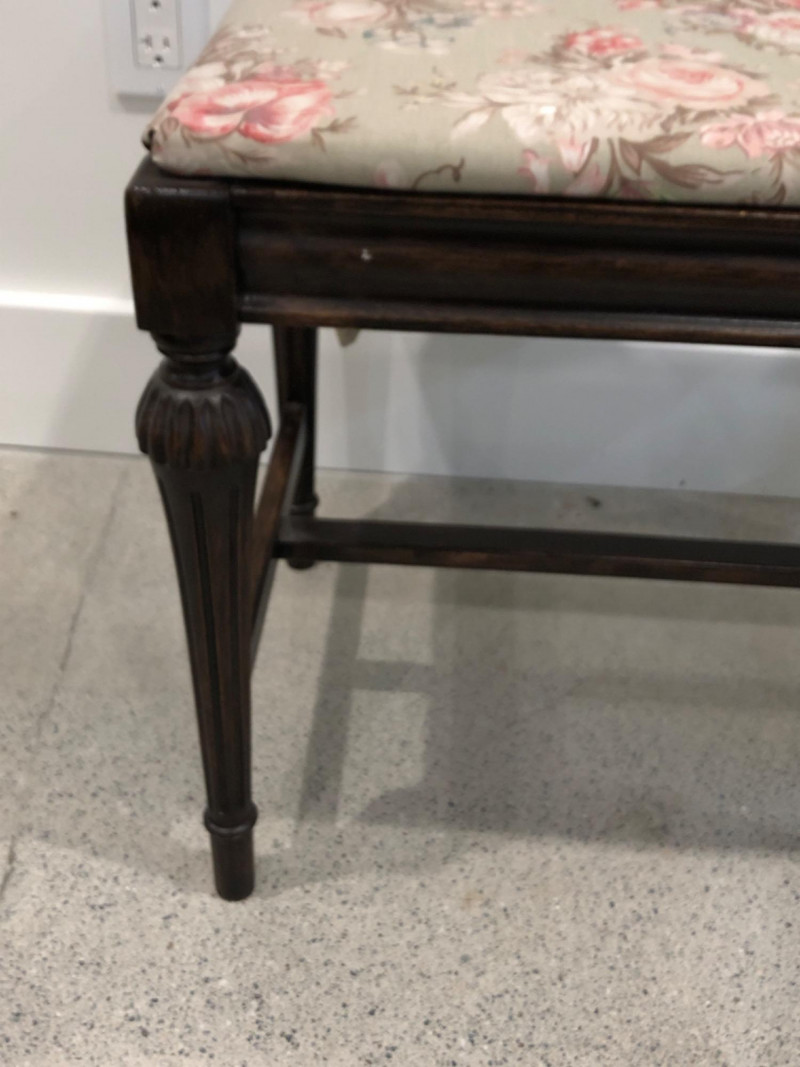 Vintage vanity bench featuring a dark wood frame with carved fluted legs and a curved open-back design. The seat is upholstered in a floral fabric with soft rose and green tones. Compact size works well for vanity use, entryways, or as an accent piece. Solid wood frame with warm finish. Due to Size: This Item Is Not Eligible for Shipping. Available for Local Pickup Only.