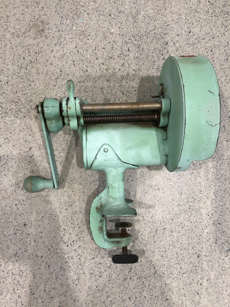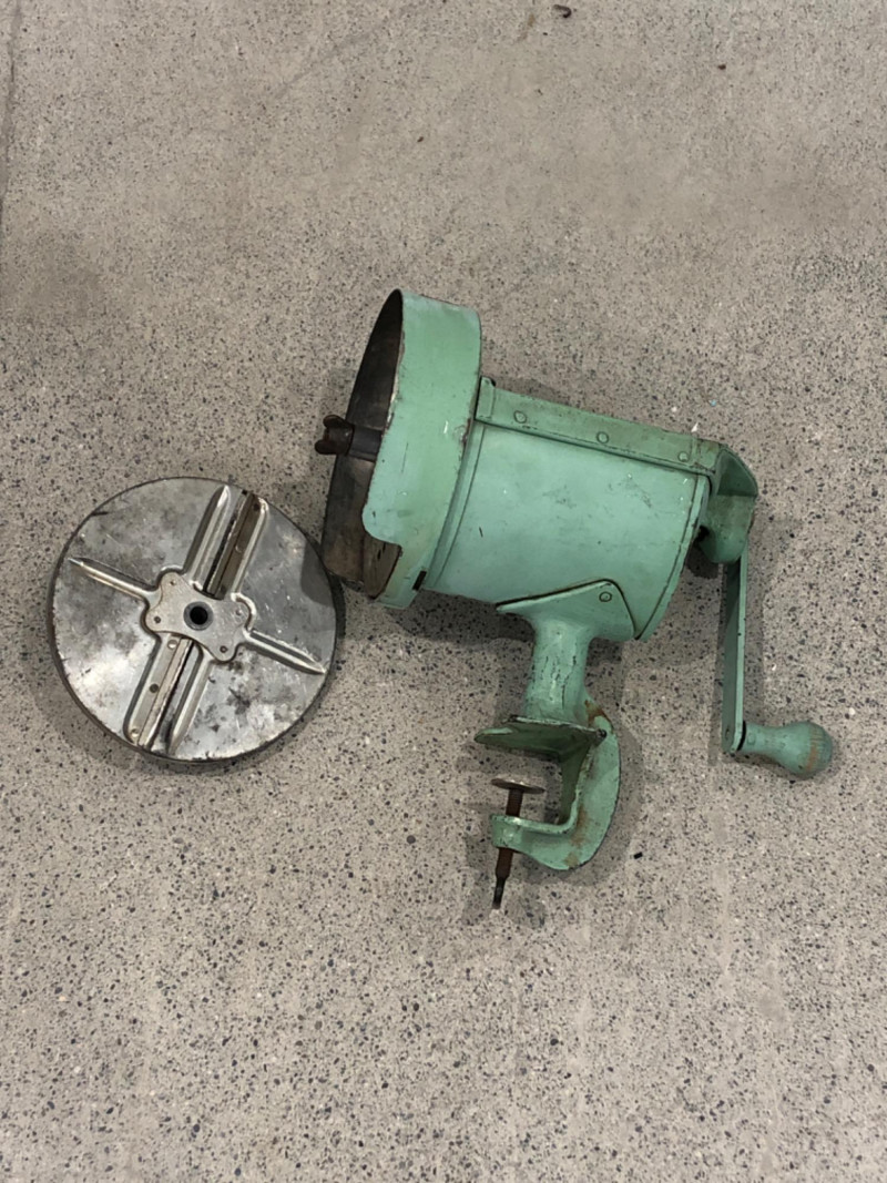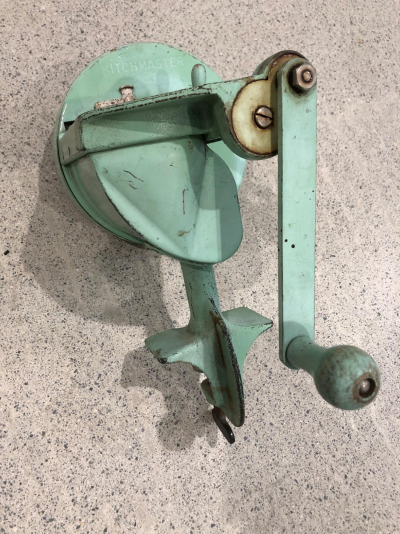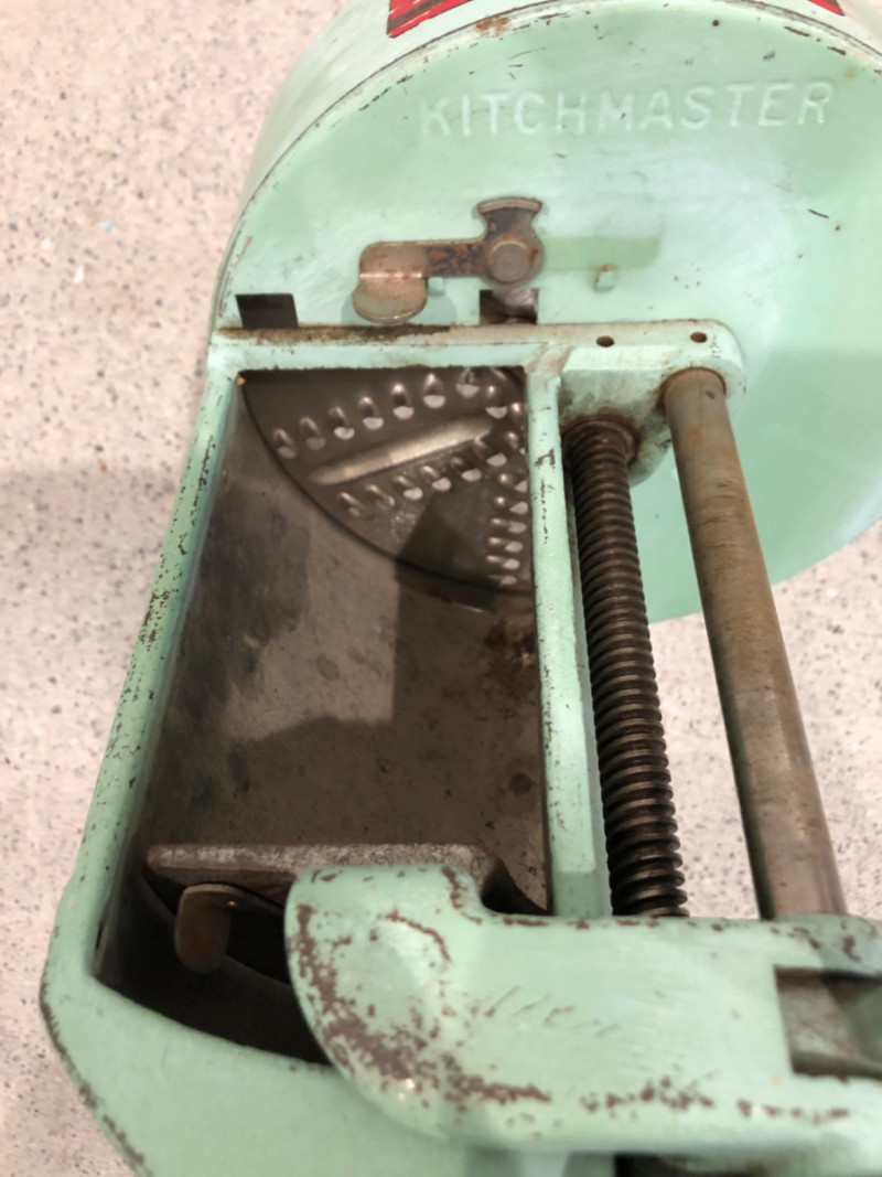 Vintage Kitchmaster rotary food processor with crank handle, clamp mount, and interchangeable grater/slicer discs. Made in USA by Chicago Flexible Shaft Co. in classic mint green. Includes 2 round grating/slicing discs.