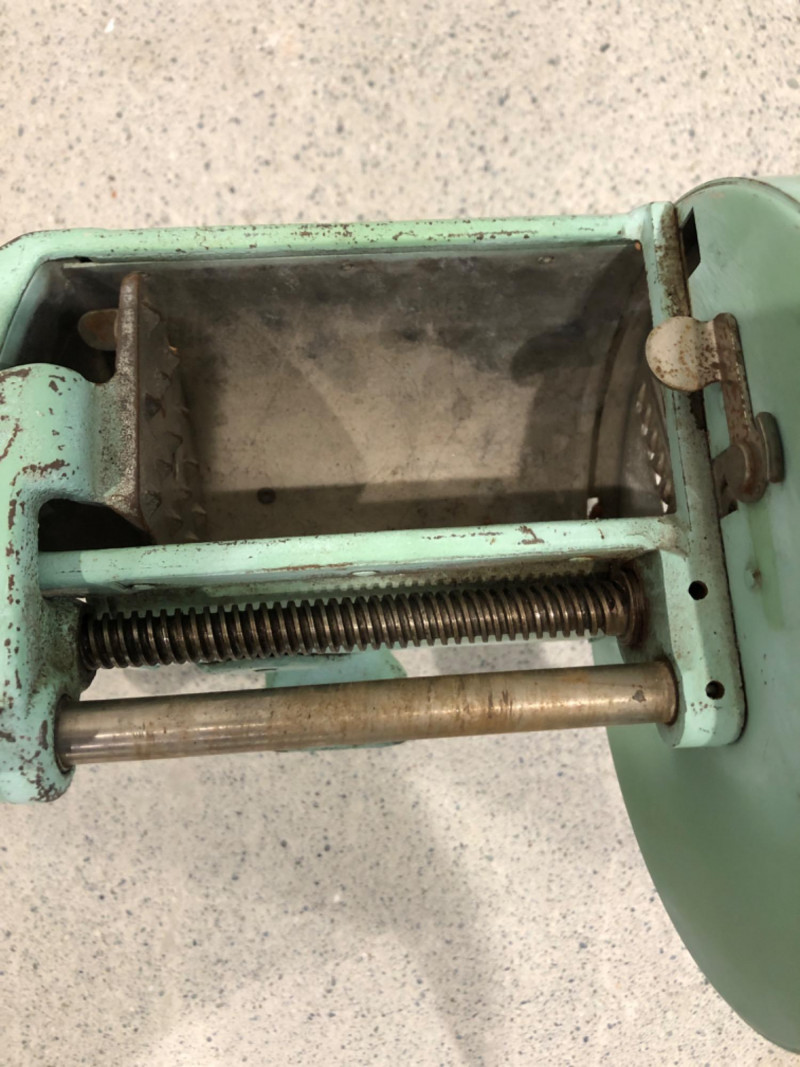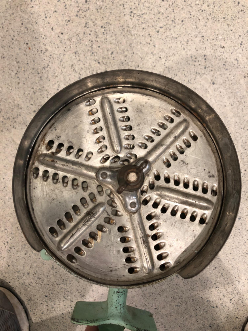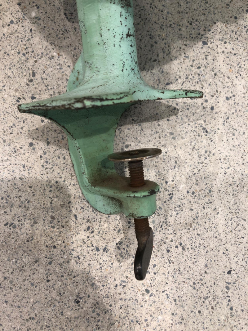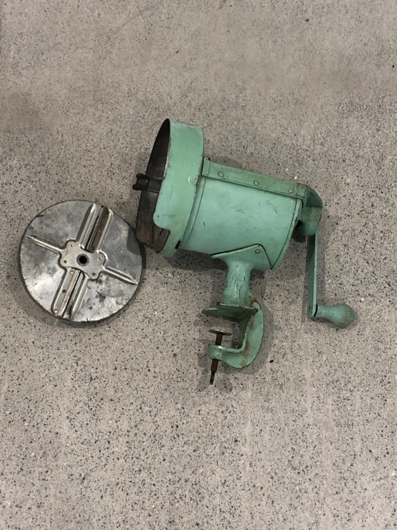Vintage Kitchmaster rotary food processor with crank handle, clamp mount, and interchangeable grater/slicer discs. Made in USA by Chicago Flexible Shaft Co. in classic mint green. Includes 2 round grating/slicing discs.