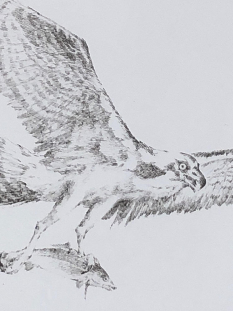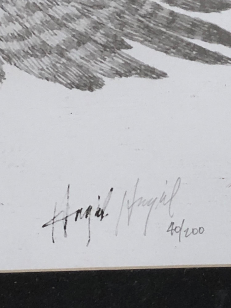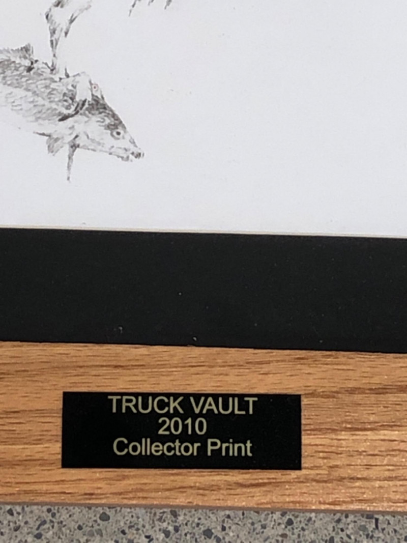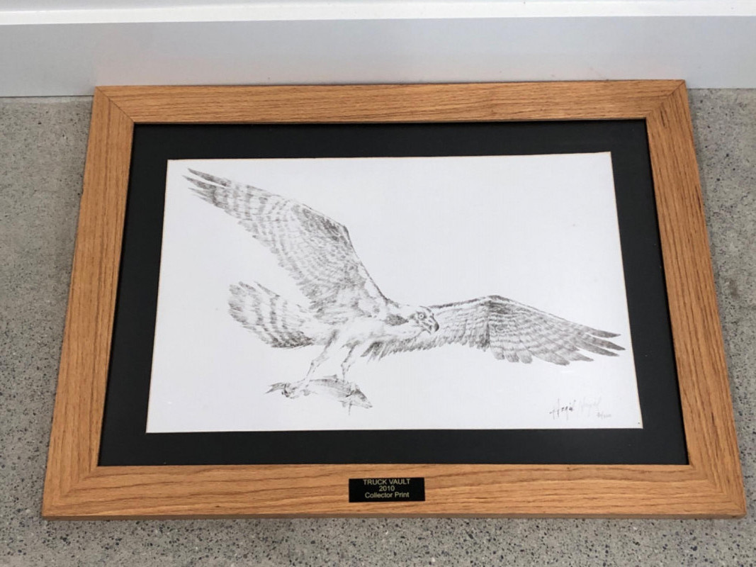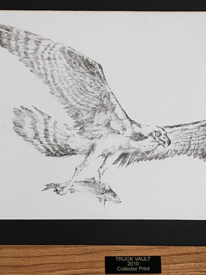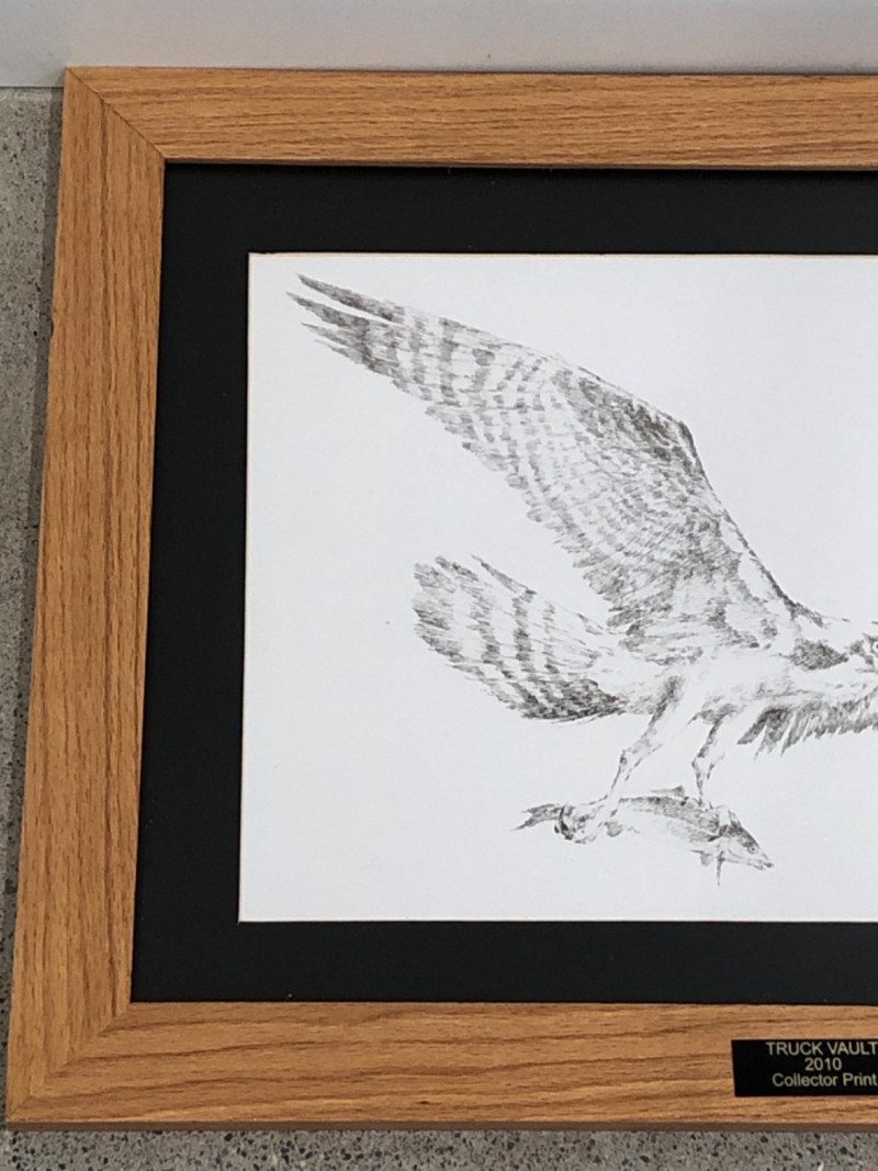 Black and white lithograph depicting an osprey mid-flight holding a fish, signed by the artist and numbered 40/200. This 2010 Truck Vault collector print is professionally framed with a black mat, wood frame, and brass title plaque.