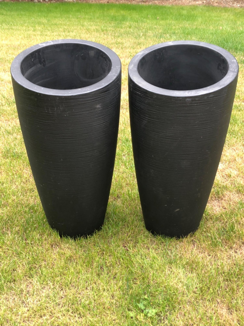 Set of two tall heavy plastic planters with a sleek tapered silhouette and matte black finish. The exterior features horizontal groove lines that add subtle texture and visual interest. Suitable for indoor or outdoor display. Both have drainage holes at the base for practical planting.