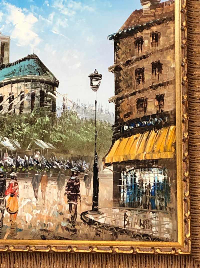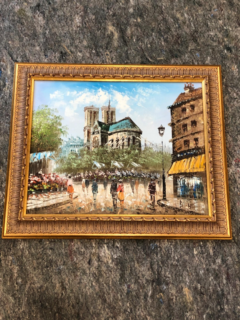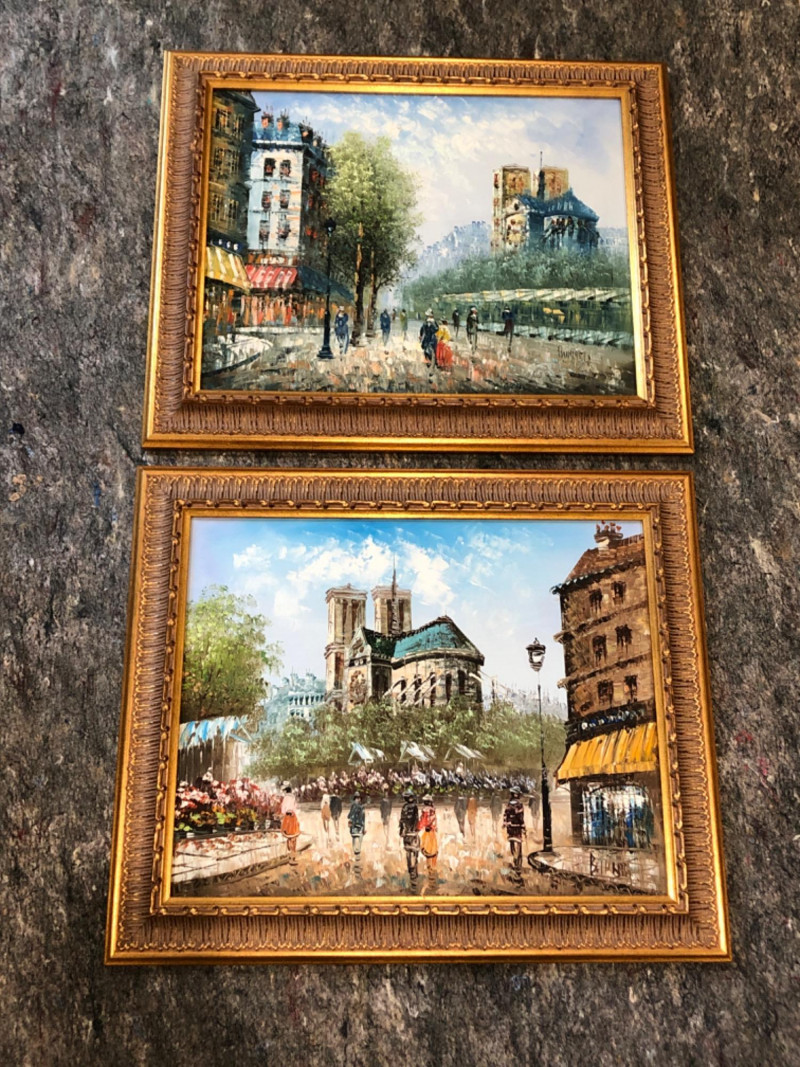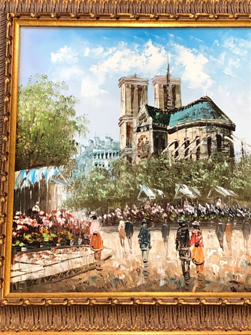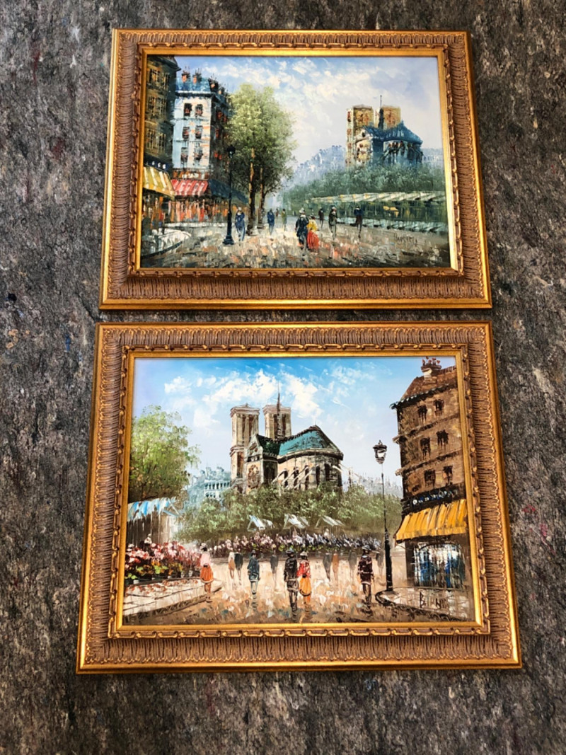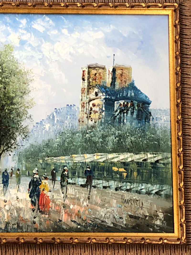 Matching framed giclée prints on canvas by Burnett, each portraying a Parisian street scene in impressionistic style. The works feature hand-applied acrylic highlights that enhance texture and dimension, mimicking original brushwork. Includes ornate gold-toned frames with minor wear. Signed in the lower corner. Impressive decorative fine art editions that would enhance any room seeking warmth or French style romance. Painting subjects are of Notre Dame and other buildings and figures.