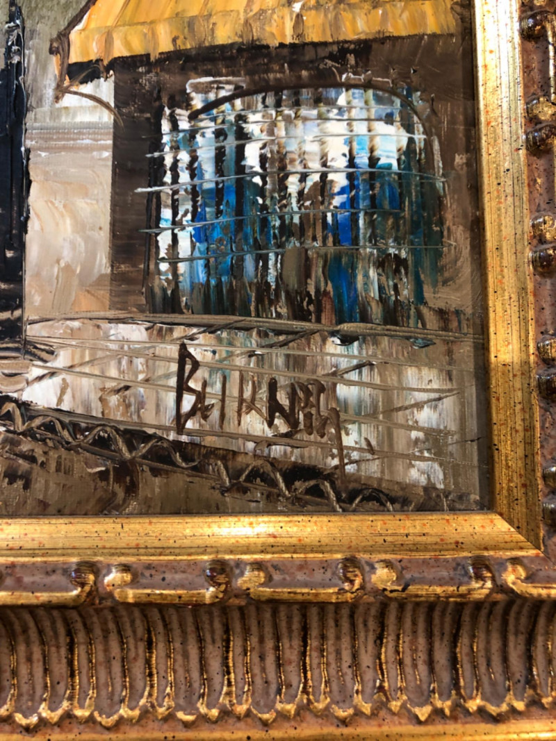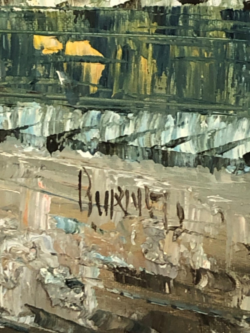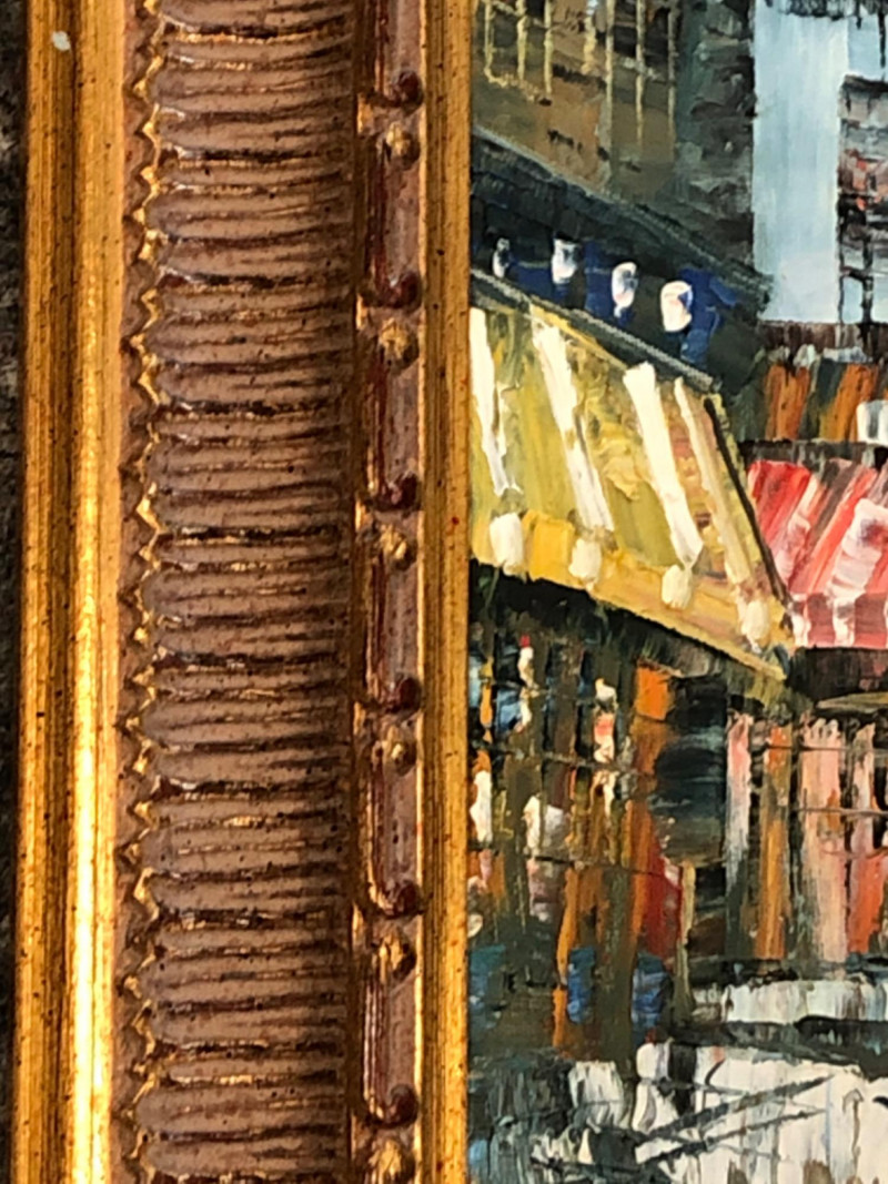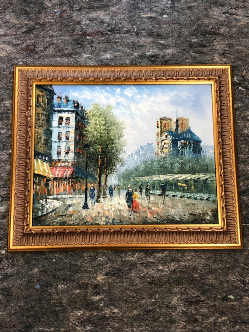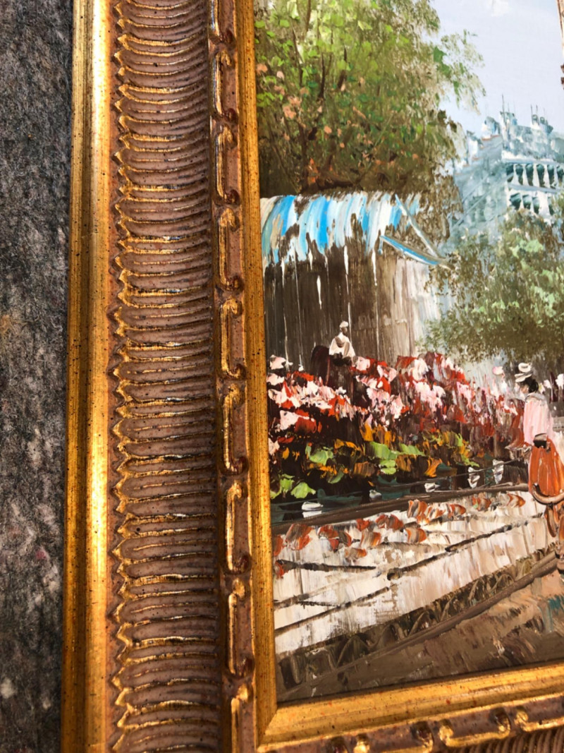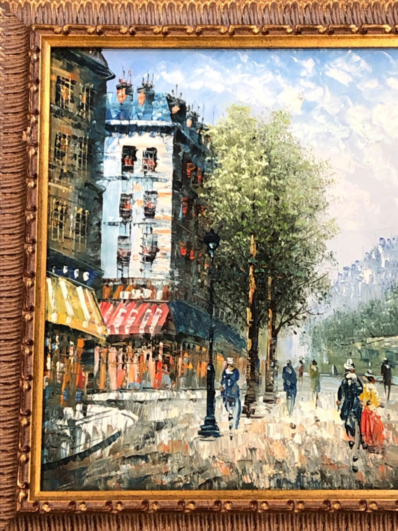 Matching framed giclée prints on canvas by Burnett, each portraying a Parisian street scene in impressionistic style. The works feature hand-applied acrylic highlights that enhance texture and dimension, mimicking original brushwork. Includes ornate gold-toned frames with minor wear. Signed in the lower corner. Impressive decorative fine art editions that would enhance any room seeking warmth or French style romance. Painting subjects are of Notre Dame and other buildings and figures.