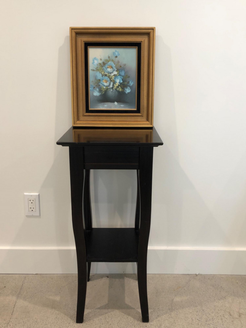 Framed still life painting featuring soft blue flowers in a vase, displayed on a black curved-leg pedestal table. The artwork is signed by the artist (name not confirmed). The canvas is framed in a gold and black wood frame.