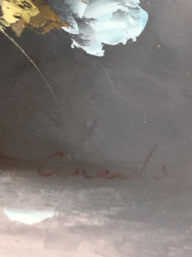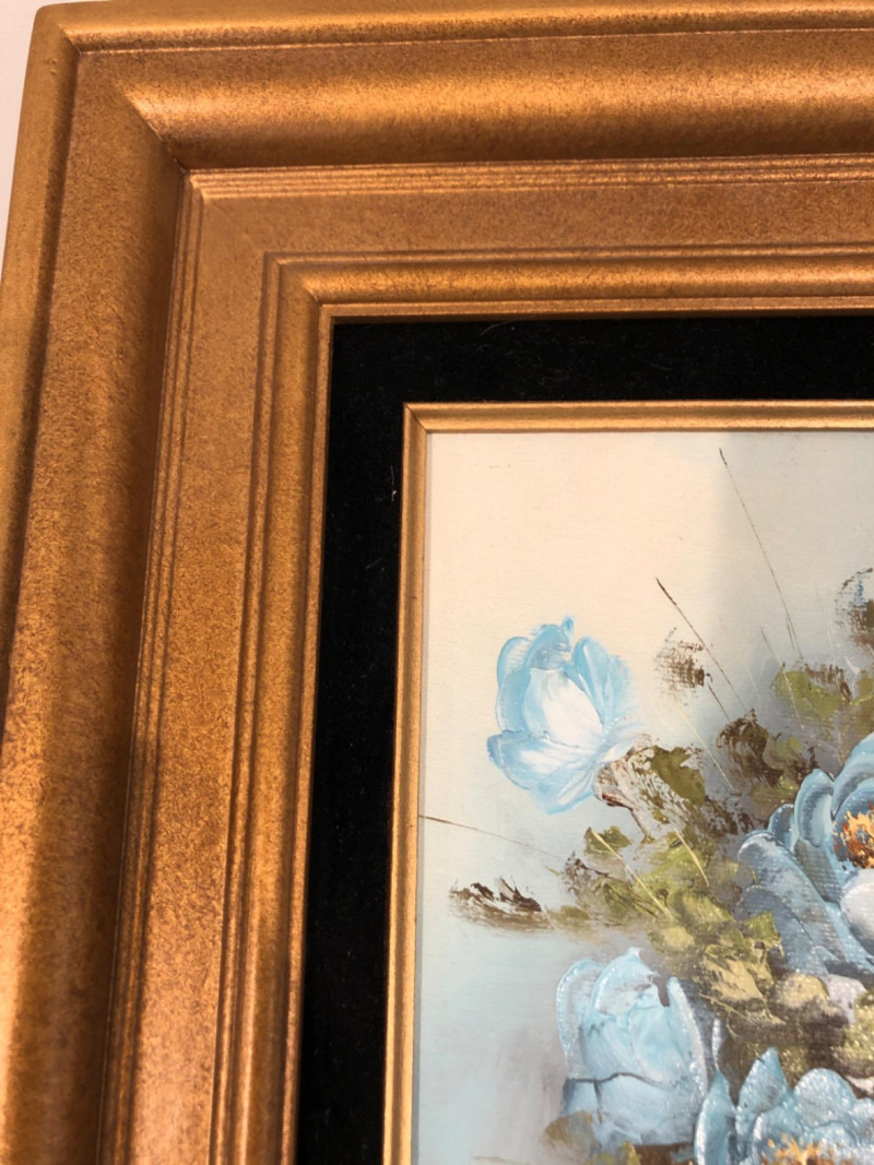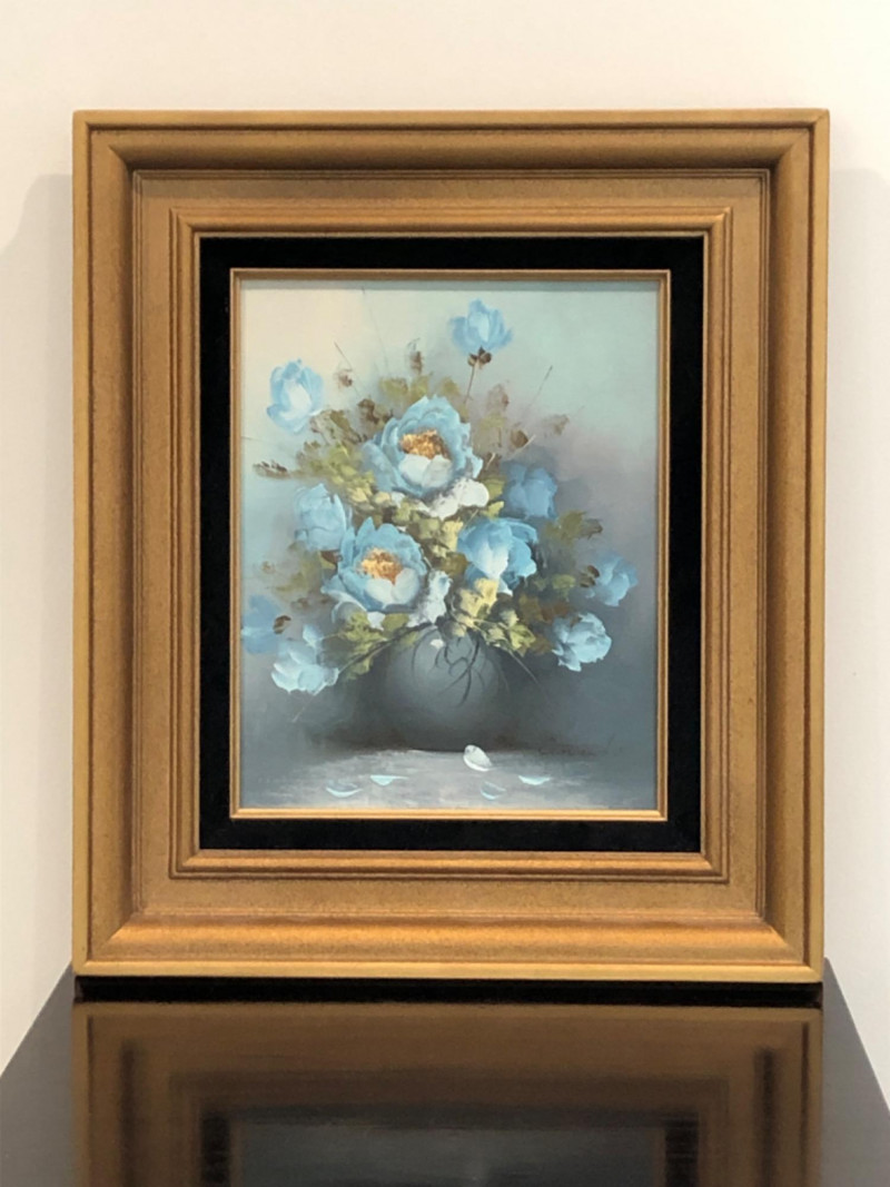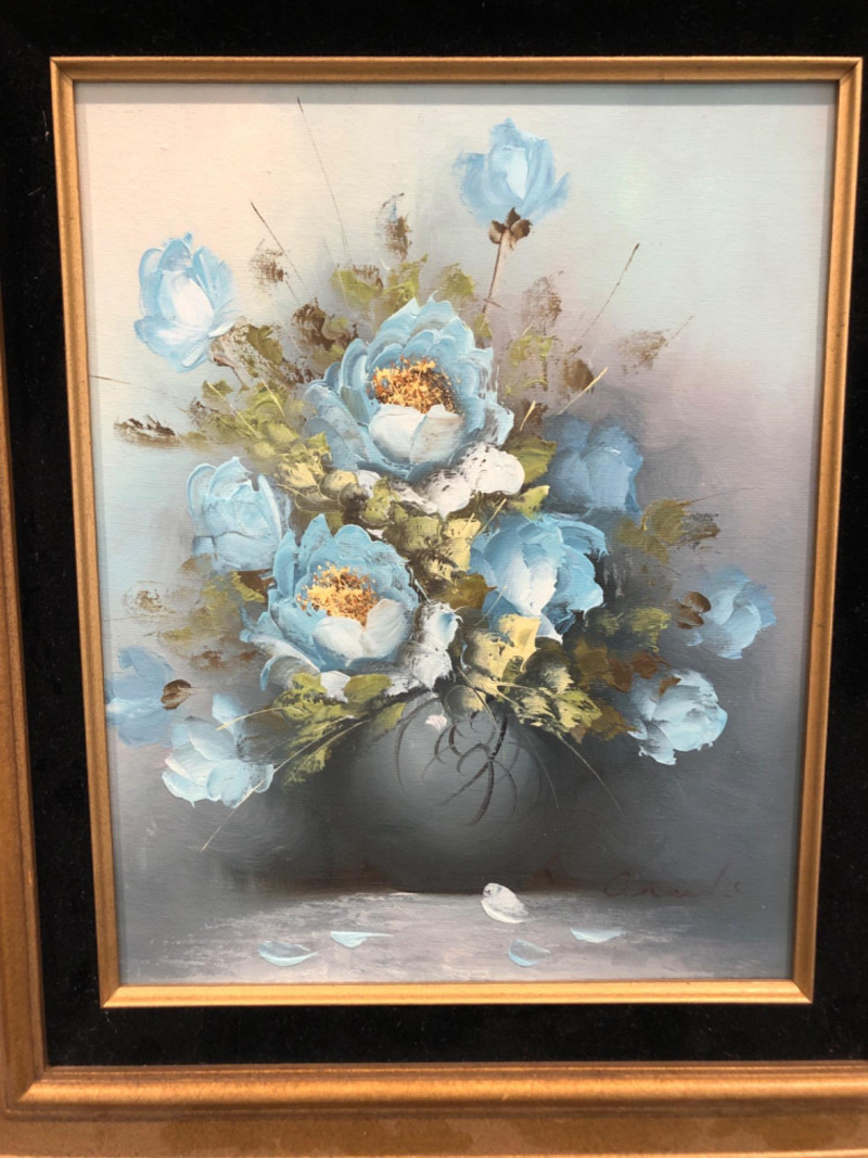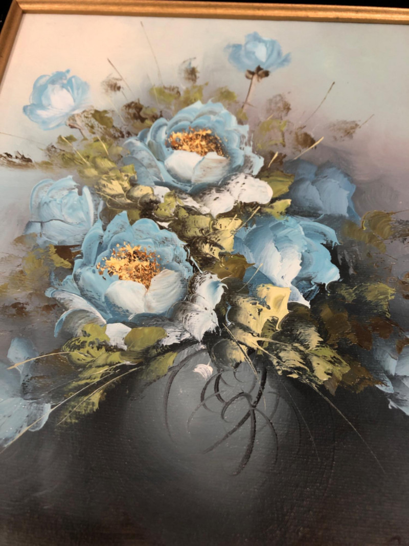 Lot # 56 - Framed Soft Blue Roses Still Life on Canvas & Display Stand