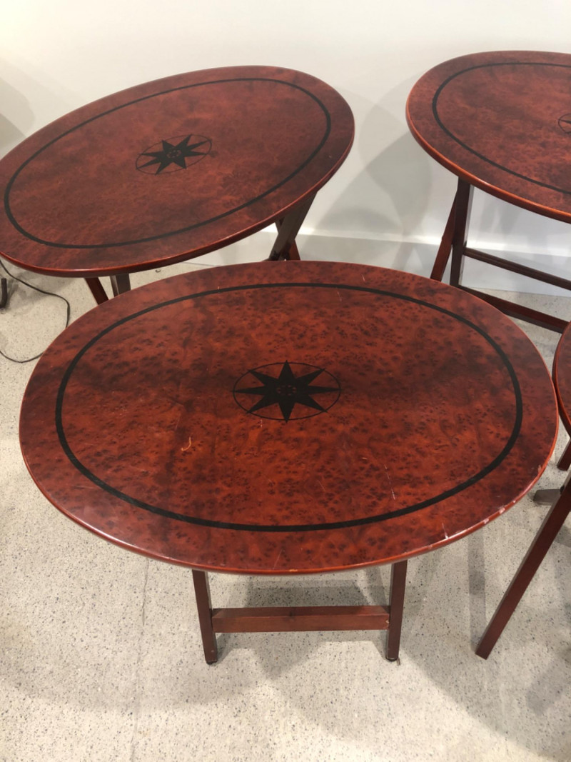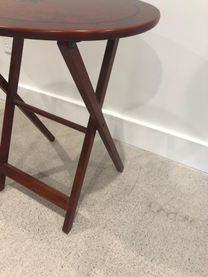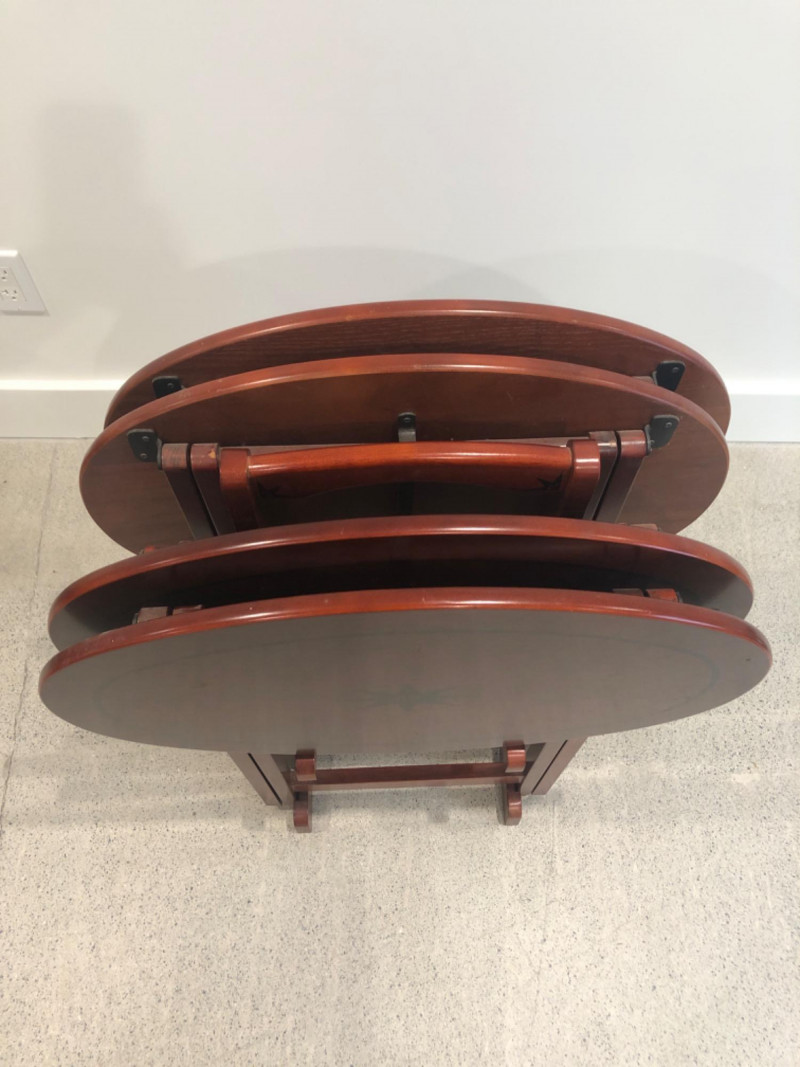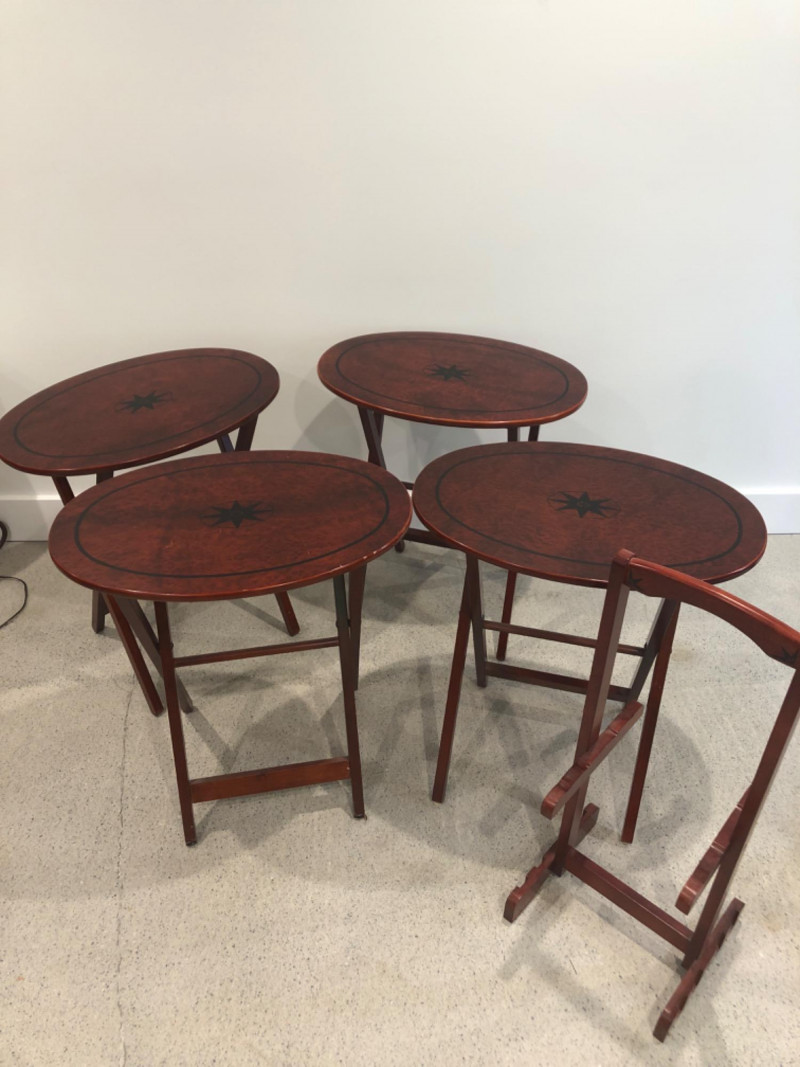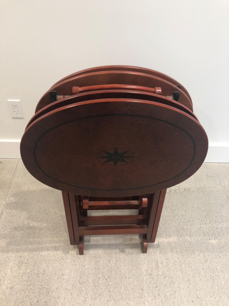 Set of four oval-shaped wooden TV trays featuring an inlaid black compass rose design and rich reddish-brown finish. Includes matching folding stand for compact storage. All trays are with functional folding mechanisms. Includes 4 folding trays and 1 stand Matching compass motif on each tray and stand Due to Size: This Item Is Not Eligible for Shipping. Available for Local Pickup Only.