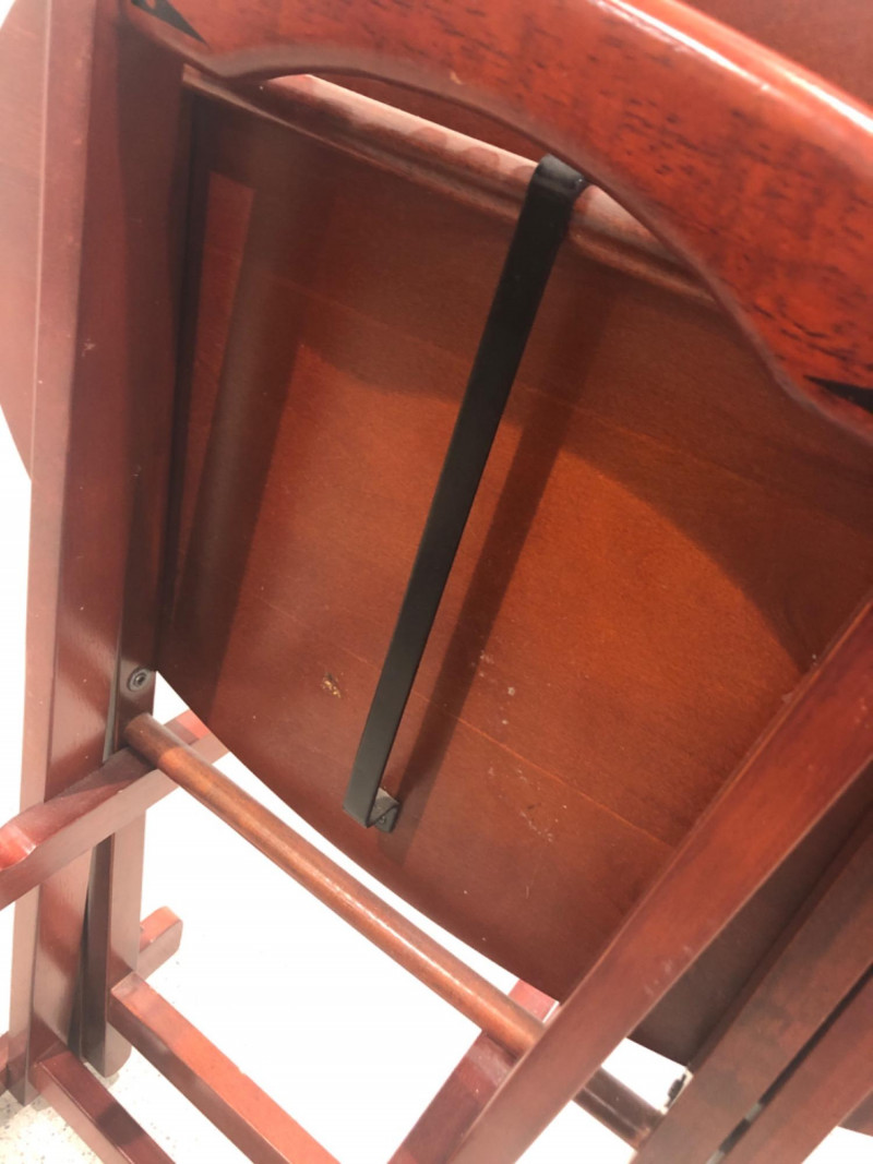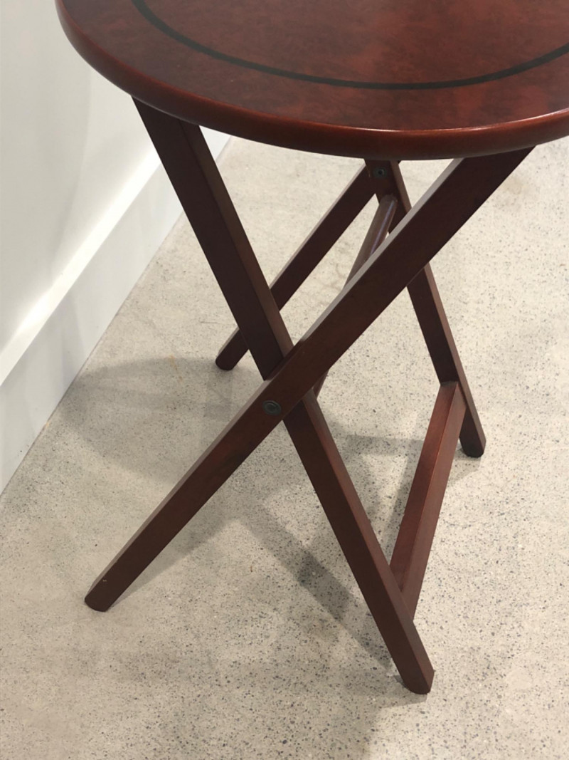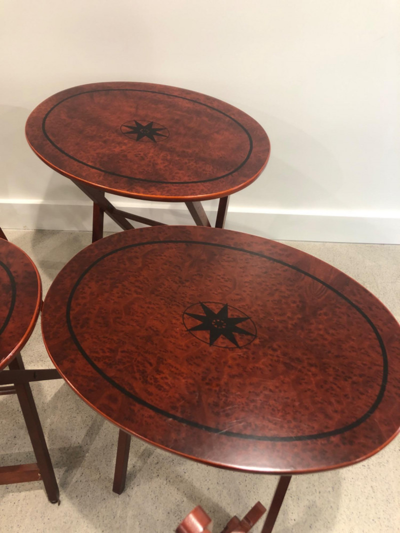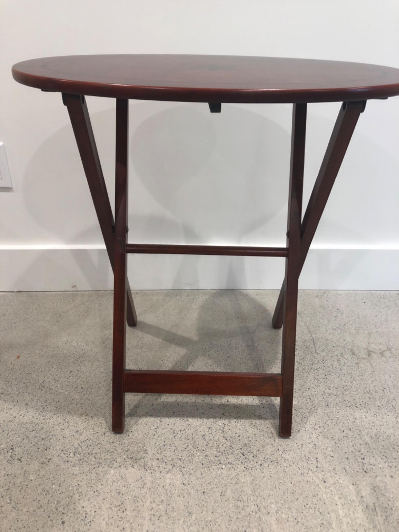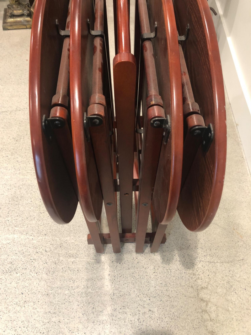 Set of four oval-shaped wooden TV trays featuring an inlaid black compass rose design and rich reddish-brown finish. Includes matching folding stand for compact storage. All trays are with functional folding mechanisms. Includes 4 folding trays and 1 stand Matching compass motif on each tray and stand Due to Size: This Item Is Not Eligible for Shipping. Available for Local Pickup Only.