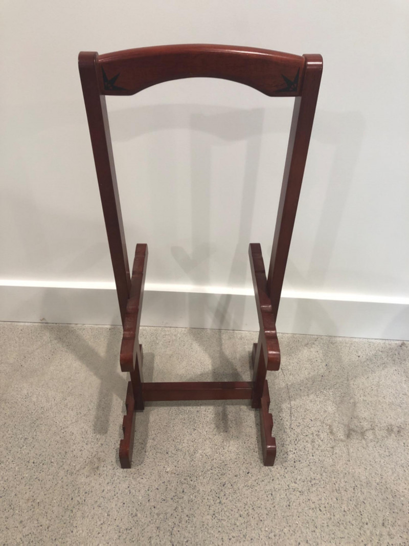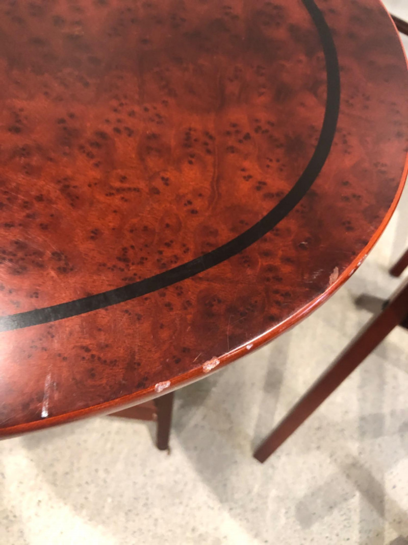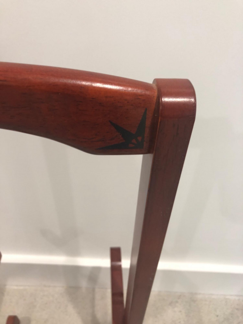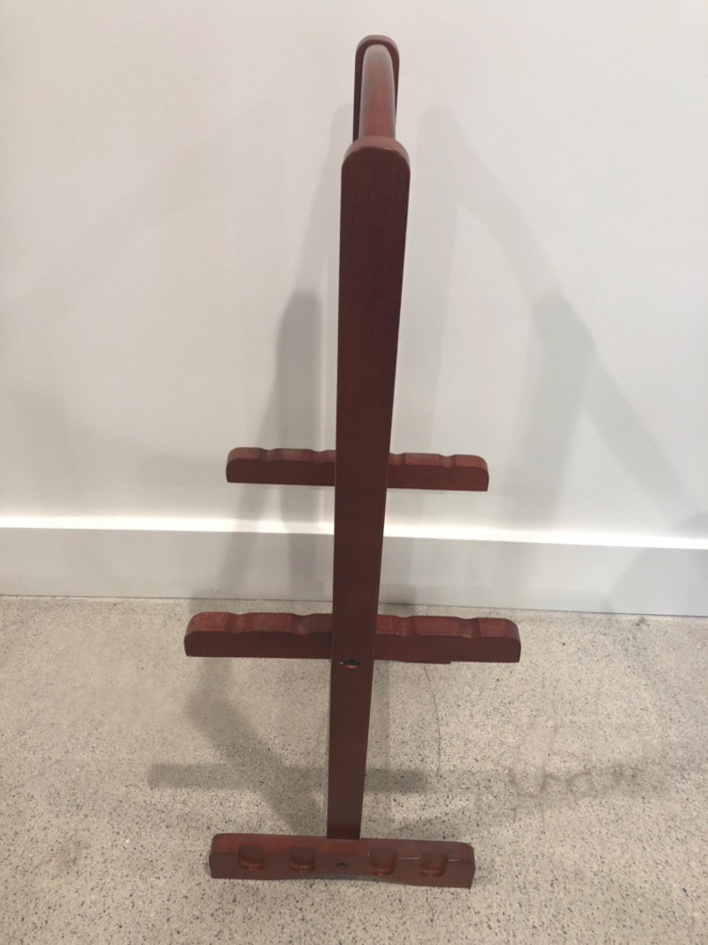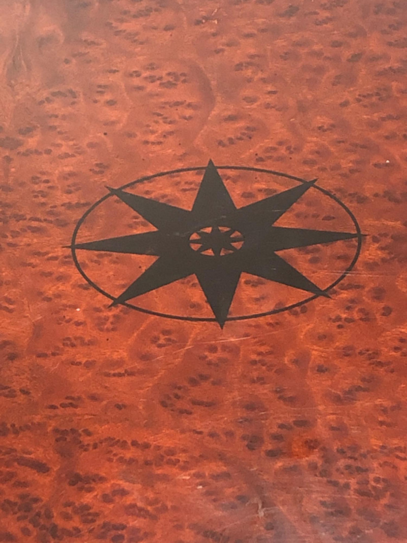 Set of four oval-shaped wooden TV trays featuring an inlaid black compass rose design and rich reddish-brown finish. Includes matching folding stand for compact storage. All trays are with functional folding mechanisms. Includes 4 folding trays and 1 stand Matching compass motif on each tray and stand Due to Size: This Item Is Not Eligible for Shipping. Available for Local Pickup Only.